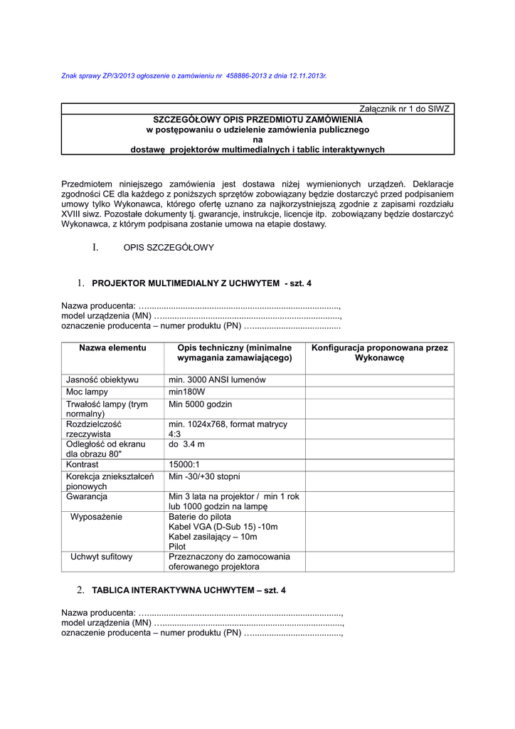 Znak sprawy ZP/3/2013 ogłoszenie o zamówieniu nr 458886-2013 z dnia 12.11.2013r. Załącznik nr 1 do SIWZ SZCZEGÓŁOWY OPIS PRZEDMIOTU ZAMÓWIENIA w postępowaniu o udzielenie zamówienia publicznego na dostawę projektorów multimedialnych i tablic interaktywnych Przedmiotem niniejszego zamówienia jest dostawa niżej wymienionych urządzeń. Deklaracje zgodności CE dla każdego z poniższych sprzętów zobowiązany będzie dostarczyć przed podpisaniem umowy tylko Wykonawca, którego ofertę uznano za najkorzystniejszą zgodnie z zapisami rozdziału XVIII siwz. Pozostałe dokumenty tj. gwarancje, instrukcje, licencje itp. zobowiązany będzie dostarczyć Wykonawca, z którym podpisana zostanie umowa na etapie dostawy. I. OPIS SZCZEGÓŁOWY 1. PROJEKTOR MULTIMEDIALNY Z UCHWYTEM - szt. 4 Nazwa producenta: …................................................................................, model urządzenia (MN) ….........................................................................., oznaczenie producenta – numer produktu (PN) …..................................... Nazwa elementu Jasność obiektywu Moc lampy Trwałość lampy (trym normalny) Rozdzielczość rzeczywista Odległość od ekranu dla obrazu 80" Kontrast Korekcja zniekształceń pionowych Gwarancja Wyposażenie Uchwyt sufitowy Opis techniczny (minimalne wymagania zamawiającego) Konfiguracja proponowana przez Wykonawcę min. 3000 ANSI lumenów min180W Min 5000 godzin min. 1024x768, format matrycy 4:3 do 3.4 m 15000:1 Min -30/+30 stopni Min 3 lata na projektor / min 1 rok lub 1000 godzin na lampę Baterie do pilota Kabel VGA (D-Sub 15) -10m Kabel zasilający – 10m Pilot Przeznaczony do zamocowania oferowanego projektora 2. TABLICA INTERAKTYWNA UCHWYTEM – szt. 4 Nazwa producenta: …................................................................................., model urządzenia (MN) …..........................................................................., oznaczenie producenta – numer produktu (PN) …....................................., Znak sprawy ZP/3/2013 ogłoszenie o zamówieniu nr 458886-2013 z dnia 12.11.2013r. Nazwa elementu Przekątna Przekątna powierzchni roboczej Obsługa tablicy Powierzchnia ekranu Rozdzielczość Format obrazu Technologia Sposób podłączenia do komputera Wymagania dotyczące zasilania Gwarancja Obsługiwane Systemy operacyjne Akcesoria Opis techniczny (minimalne wymagania zamawiającego) min. 80” min. 77” za pomocą załączonych pisaków i za pomocą palca. Matowa, suchościeralna, magnetyczna, kompatybilna ze sucho-ścieralny markerami dołączonymi do tablicy, żadne uszkodzenia nie wpływają na działanie tablicy Min. 4096x4096 4:3 Dotykowa (Rezystancyjna) lub pozycjonowana w podczerwieni. USB Tablica jest zasilana bezpośrednio z komputera przez kabel USB Min 5 lat ze względu na kompatybilność oprogramowania tablicy z istniejącym oprogramowaniem sprzętu komputerowego w szkole zamawiający wymaga Windows XP/Vista/7 32 bit i 64 bit • • • W zastawie z tablicą cztery pisaki odpowiadające kolorom czarny, czerwony, niebieski i zielony oraz gąbka do ścierania pisma elektronicznego. Półka na pisaki automatycznie rozpoznająca, który pisak został podniesiony, aktywująca automatycznie przypisany w oprogramowaniu kolor linii lub gąbkę z sygnalizacją za pomocą diod LED, które urządzenie z półki jest aktywne. Tablica automatyczne rozpoznaje używane narzędzie, tak że użytkownicy podnosząc pióro mogą pisać nim w aplikacjach, sterować programem za pomocą palca, usuwać notatki dłonią, wszystko te czynności bez konieczności odkładania Konfiguracja proponowana przez Wykonawcę Znak sprawy ZP/3/2013 ogłoszenie o zamówieniu nr 458886-2013 z dnia 12.11.2013r. • • • • Oprogramowanie • • • • • pióra na półkę. kabel USB min. 5 m, uchwyty do montażu na ścianie, oprogramowanie w języku polskim, instrukcja obsługi, Funkcja rozpoznawania pisma odręcznego - m.in. w języku polskim Rozpoznawanie gestów wykonanych na tablicy Autozapis - umożliwia automatyczne zapisywanie zmian w pliku co zadany interwał czasu Wbudowane interaktywne narzędzia przedmiotowe - do nauki przedmiotów matematyczno przyrodniczych, i języka angielskiego Zarządzanie obiektami - m.in. funkcja blokowania, grupowania i rozgrupowania obiektów graficznych .......................................................... (data i podpis uprawnionego przedstawiciela Wykonawcy)