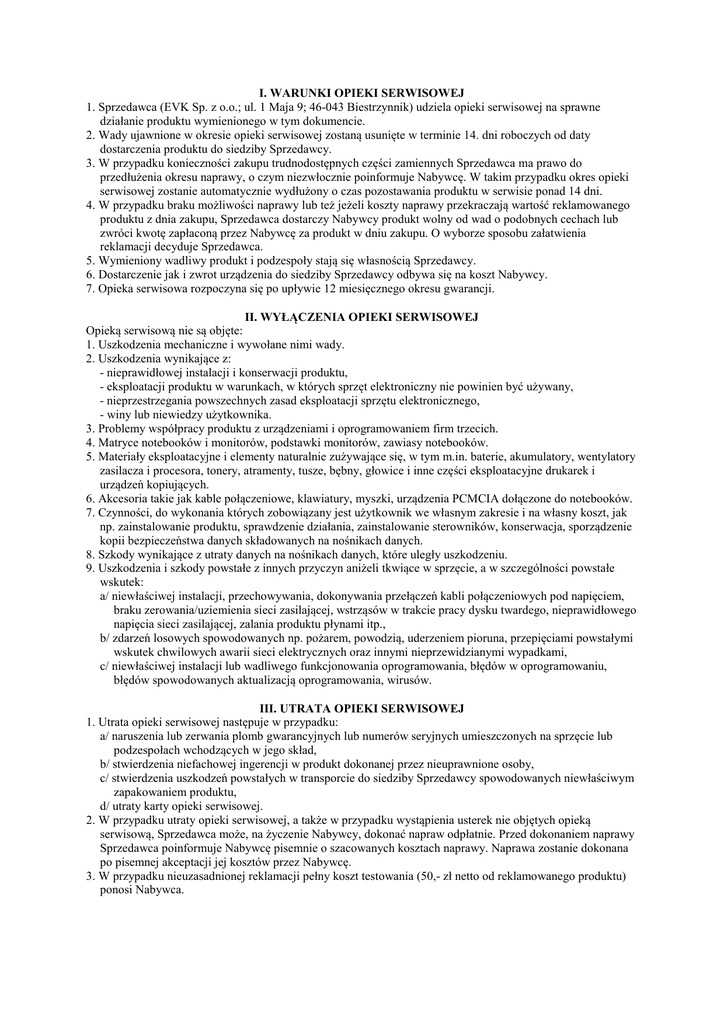 I. WARUNKI OPIEKI SERWISOWEJ 1. Sprzedawca (EVK Sp. z o.o.; ul. 1 Maja 9; 46-043 Biestrzynnik) udziela opieki serwisowej na sprawne działanie produktu wymienionego w tym dokumencie. 2. Wady ujawnione w okresie opieki serwisowej zostaną usunięte w terminie 14. dni roboczych od daty dostarczenia produktu do siedziby Sprzedawcy. 3. W przypadku konieczności zakupu trudnodostępnych części zamiennych Sprzedawca ma prawo do przedłużenia okresu naprawy, o czym niezwłocznie poinformuje Nabywcę. W takim przypadku okres opieki serwisowej zostanie automatycznie wydłużony o czas pozostawania produktu w serwisie ponad 14 dni. 4. W przypadku braku możliwości naprawy lub też jeżeli koszty naprawy przekraczają wartość reklamowanego produktu z dnia zakupu, Sprzedawca dostarczy Nabywcy produkt wolny od wad o podobnych cechach lub zwróci kwotę zapłaconą przez Nabywcę za produkt w dniu zakupu. O wyborze sposobu załatwienia reklamacji decyduje Sprzedawca. 5. Wymieniony wadliwy produkt i podzespoły stają się własnością Sprzedawcy. 6. Dostarczenie jak i zwrot urządzenia do siedziby Sprzedawcy odbywa się na koszt Nabywcy. 7. Opieka serwisowa rozpoczyna się po upływie 12 miesięcznego okresu gwarancji. II. WYŁĄCZENIA OPIEKI SERWISOWEJ Opieką serwisową nie są objęte: 1. Uszkodzenia mechaniczne i wywołane nimi wady. 2. Uszkodzenia wynikające z: - nieprawidłowej instalacji i konserwacji produktu, - eksploatacji produktu w warunkach, w których sprzęt elektroniczny nie powinien być używany, - nieprzestrzegania powszechnych zasad eksploatacji sprzętu elektronicznego, - winy lub niewiedzy użytkownika. 3. Problemy współpracy produktu z urządzeniami i oprogramowaniem firm trzecich. 4. Matryce notebooków i monitorów, podstawki monitorów, zawiasy notebooków. 5. Materiały eksploatacyjne i elementy naturalnie zużywające się, w tym m.in. baterie, akumulatory, wentylatory zasilacza i procesora, tonery, atramenty, tusze, bębny, głowice i inne części eksploatacyjne drukarek i urządzeń kopiujących. 6. Akcesoria takie jak kable połączeniowe, klawiatury, myszki, urządzenia PCMCIA dołączone do notebooków. 7. Czynności, do wykonania których zobowiązany jest użytkownik we własnym zakresie i na własny koszt, jak np. zainstalowanie produktu, sprawdzenie działania, zainstalowanie sterowników, konserwacja, sporządzenie kopii bezpieczeństwa danych składowanych na nośnikach danych. 8. Szkody wynikające z utraty danych na nośnikach danych, które uległy uszkodzeniu. 9. Uszkodzenia i szkody powstałe z innych przyczyn aniżeli tkwiące w sprzęcie, a w szczególności powstałe wskutek: a/ niewłaściwej instalacji, przechowywania, dokonywania przełączeń kabli połączeniowych pod napięciem, braku zerowania/uziemienia sieci zasilającej, wstrząsów w trakcie pracy dysku twardego, nieprawidłowego napięcia sieci zasilającej, zalania produktu płynami itp., b/ zdarzeń losowych spowodowanych np. pożarem, powodzią, uderzeniem pioruna, przepięciami powstałymi wskutek chwilowych awarii sieci elektrycznych oraz innymi nieprzewidzianymi wypadkami, c/ niewłaściwej instalacji lub wadliwego funkcjonowania oprogramowania, błędów w oprogramowaniu, błędów spowodowanych aktualizacją oprogramowania, wirusów. III. UTRATA OPIEKI SERWISOWEJ 1. Utrata opieki serwisowej następuje w przypadku: a/ naruszenia lub zerwania plomb gwarancyjnych lub numerów seryjnych umieszczonych na sprzęcie lub podzespołach wchodzących w jego skład, b/ stwierdzenia niefachowej ingerencji w produkt dokonanej przez nieuprawnione osoby, c/ stwierdzenia uszkodzeń powstałych w transporcie do siedziby Sprzedawcy spowodowanych niewłaściwym zapakowaniem produktu, d/ utraty karty opieki serwisowej. 2. W przypadku utraty opieki serwisowej, a także w przypadku wystąpienia usterek nie objętych opieką serwisową, Sprzedawca może, na życzenie Nabywcy, dokonać napraw odpłatnie. Przed dokonaniem naprawy Sprzedawca poinformuje Nabywcę pisemnie o szacowanych kosztach naprawy. Naprawa zostanie dokonana po pisemnej akceptacji jej kosztów przez Nabywcę. 3. W przypadku nieuzasadnionej reklamacji pełny koszt testowania (50,- zł netto od reklamowanego produktu) ponosi Nabywca.