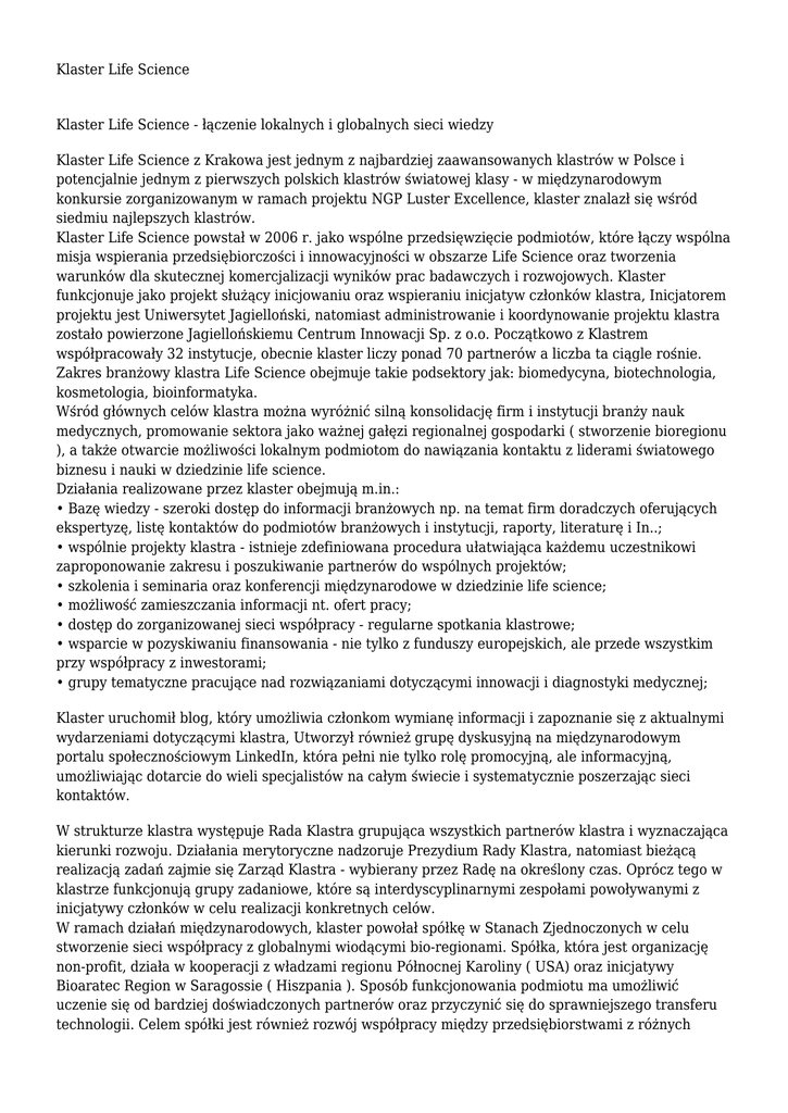 Klaster Life Science Klaster Life Science - łączenie lokalnych i globalnych sieci wiedzy Klaster Life Science z Krakowa jest jednym z najbardziej zaawansowanych klastrów w Polsce i potencjalnie jednym z pierwszych polskich klastrów światowej klasy - w międzynarodowym konkursie zorganizowanym w ramach projektu NGP Luster Excellence, klaster znalazł się wśród siedmiu najlepszych klastrów. Klaster Life Science powstał w 2006 r. jako wspólne przedsięwzięcie podmiotów, które łączy wspólna misja wspierania przedsiębiorczości i innowacyjności w obszarze Life Science oraz tworzenia warunków dla skutecznej komercjalizacji wyników prac badawczych i rozwojowych. Klaster funkcjonuje jako projekt służący inicjowaniu oraz wspieraniu inicjatyw członków klastra, Inicjatorem projektu jest Uniwersytet Jagielloński, natomiast administrowanie i koordynowanie projektu klastra zostało powierzone Jagiellońskiemu Centrum Innowacji Sp. z o.o. Początkowo z Klastrem współpracowały 32 instytucje, obecnie klaster liczy ponad 70 partnerów a liczba ta ciągle rośnie. Zakres branżowy klastra Life Science obejmuje takie podsektory jak: biomedycyna, biotechnologia, kosmetologia, bioinformatyka. Wśród głównych celów klastra można wyróżnić silną konsolidację firm i instytucji branży nauk medycznych, promowanie sektora jako ważnej gałęzi regionalnej gospodarki ( stworzenie bioregionu ), a także otwarcie możliwości lokalnym podmiotom do nawiązania kontaktu z liderami światowego biznesu i nauki w dziedzinie life science. Działania realizowane przez klaster obejmują m.in.: • Bazę wiedzy - szeroki dostęp do informacji branżowych np. na temat firm doradczych oferujących ekspertyzę, listę kontaktów do podmiotów branżowych i instytucji, raporty, literaturę i In..; • wspólnie projekty klastra - istnieje zdefiniowana procedura ułatwiająca każdemu uczestnikowi zaproponowanie zakresu i poszukiwanie partnerów do wspólnych projektów; • szkolenia i seminaria oraz konferencji międzynarodowe w dziedzinie life science; • możliwość zamieszczania informacji nt. ofert pracy; • dostęp do zorganizowanej sieci współpracy - regularne spotkania klastrowe; • wsparcie w pozyskiwaniu finansowania - nie tylko z funduszy europejskich, ale przede wszystkim przy współpracy z inwestorami; • grupy tematyczne pracujące nad rozwiązaniami dotyczącymi innowacji i diagnostyki medycznej; Klaster uruchomił blog, który umożliwia członkom wymianę informacji i zapoznanie się z aktualnymi wydarzeniami dotyczącymi klastra, Utworzył również grupę dyskusyjną na międzynarodowym portalu społecznościowym LinkedIn, która pełni nie tylko rolę promocyjną, ale informacyjną, umożliwiając dotarcie do wieli specjalistów na całym świecie i systematycznie poszerzając sieci kontaktów. W strukturze klastra występuje Rada Klastra grupująca wszystkich partnerów klastra i wyznaczająca kierunki rozwoju. Działania merytoryczne nadzoruje Prezydium Rady Klastra, natomiast bieżącą realizacją zadań zajmie się Zarząd Klastra - wybierany przez Radę na określony czas. Oprócz tego w klastrze funkcjonują grupy zadaniowe, które są interdyscyplinarnymi zespołami powoływanymi z inicjatywy członków w celu realizacji konkretnych celów. W ramach działań międzynarodowych, klaster powołał spółkę w Stanach Zjednoczonych w celu stworzenie sieci współpracy z globalnymi wiodącymi bio-regionami. Spółka, która jest organizację non-profit, działa w kooperacji z władzami regionu Północnej Karoliny ( USA) oraz inicjatywy Bioaratec Region w Saragossie ( Hiszpania ). Sposób funkcjonowania podmiotu ma umożliwić uczenie się od bardziej doświadczonych partnerów oraz przyczynić się do sprawniejszego transferu technologii. Celem spółki jest również rozwój współpracy między przedsiębiorstwami z różnych krajów, a także zachęcaniu firm do inwestowania w krajach partnerskich. Kapitałem zakładowym spółki jest zarówno wiedza wnoszona przez partnerów jak i infrastruktura badawcza. Dzięki podjętym działaniom, firmy mają dostęp do szerokich możliwości biznesowych - od wsparcia w działaniach badawczo-rozwojowych, poprzez procedury ochrony własności prac intelektualnych i transferu technologii, po dostęp do kapitału inwestycyjnego, wsparcia rozwoju firm typu spin-offów oraz pomocy przy wejściu na nowe rynki. Ten sposób umiędzynarodowienia działalności klastrów wydaje się być dobrą praktyką zwłaszcza dla klastrów działających w sektorach opartych na wiedzy ( technologie informacyjno - komunikacyjnej, biotechnologia, przemysł lotniczy ). W tego typu branżach klastry mogą stać się platformami współpracy zarówno lokalnej jak i światowej - systemowo wspierając uczestników w rozwoju ich działalności międzynarodowej. Źródło: „Inicjatywy klastrowe: skuteczne działania i strategiczny rozwój" red. Marita Koszarek, PARP, Warszawa 2011
