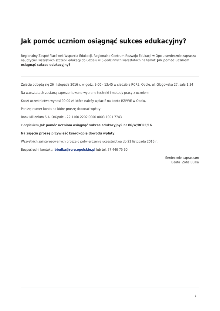 Jak pomóc uczniom osiągnąć sukces edukacyjny? Regionalny Zespół Placówek Wsparcia Edukacji, Regionalne Centrum Rozwoju Edukacji w Opolu serdecznie zaprasza nauczycieli wszystkich szczebli edukacji do udziału w 6 godzinnych warsztatach na temat: Jak pomóc uczniom osiągnąć sukces edukacyjny? Zajęcia odbędą się 26 listopada 2016 r. w godz. 9:00 - 13:45 w siedzibie RCRE, Opole, ul. Głogowska 27, sala 1.34 Na warsztatach zostaną zaprezentowane wybrane techniki i metody pracy z uczniem. Koszt uczestnictwa wynosi 90,00 zł, które należy wpłacić na konto RZPWE w Opolu. Poniżej numer konta na które proszę dokonać wpłaty: Bank Millenium S.A. O/Opole - 22 1160 2202 0000 0003 1001 7743 z dopiskiem Jak pomóc uczniom osiągnąć sukces edukacyjny? nr 86/W/RCRE/16 Na zajęcia proszę przywieźć kserokopię dowodu wpłaty. Wszystkich zainteresowanych proszę o potwierdzenie uczestnictwa do 22 listopada 2016 r. Bezpośredni kontakt: [email protected] lub tel. 77 440 75 60 Serdecznie zapraszam Beata Zofia Bułka 1