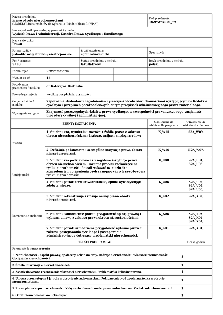 Nazwa przedmiotu: Kod przedmiotu: Prawo obrotu nieruchomościami (MODUŁY(Liczba modułów do wyboru 1) / Moduł (Blok): C (WPiA)) 10.9V27AII05_79 Nazwa jednostki prowadzącej przedmiot / moduł: Wydział Prawa i Administracji, Katedra Prawa Cywilnego i Handlowego Nazwa kierunku: Prawo Forma studiów: Profil kształcenia: jednolite magisterskie, niestacjonarne ogólnoakademicki Rok / semestr: 5 / 10 Status przedmiotu / modułu: Język przedmiotu / modułu: fakultatywny polski Specjalność: Forma zajęć: konwersatoria Wymiar zajęć: 15 Koordynator przedmiotu / modułu: dr Katarzyna Dadańska Prowadzący zajęcia: według przydziału czynności Cel przedmiotu / modułu: Zapoznanie studentów z zagadnieniami prawnymi obrotu nieruchomościami występującymi w Kodeksie cywilnym i przepisach pozakodeksowych, w tym przepisach administracyjnego prawa materialnego. Wymagania wstępne: Znajomość poszczególnych działów prawa cywilnego, w szczególności prawa rzeczowego, znajomość procedury cywilnej i administracyjnej. Odniesienie do efektów dla programu Odniesienie do efektów dla obszaru 1. Student zna, wymienia i rozróżnia źródła prawa z zakresu obrotu nieruchomościami: krajowe, unijne i międzynarodowe. K_W15 S2A_W09, 2. Definiuje podstawowe i szczególne instytucje prawa obrotu nieruchomościami. K_W19 H2A_W07, 3. Student zna podstawowe i szczegółowe instytucje prawa obrotu nieruchomościami, rozumie procesy zachodzące na rynku nieruchomości. Potrafi wskazać na niezbędne kompetencje i uprawnienia osób zaangażowanych zawodowo na rynku nieruchomości. K_U08 S2A_U04, S2A_U06, 4. Student potrafi formułować wnioski, opinie wykorzystując zdobytą wiedzę. K_U06 S2A_U02, S2A_U03, S2A_U08, 5. Student rekonstruuje i stosuje normy prawa obrotu nieruchomościami. K_K02 S2A_K02, 6. Student samodzielnie potrafi przygotować opinię prawną i wybraną umowę z zakresu prawa obrotu nieruchomościami. K_K06 S2A_K03, S2A_K05, S2A_K07, 7. Student potrafi samodzielne przygotować wybrane pisma z zakresu postępowania cywilnego i postępowania administracyjnego dotyczące problematyki nieruchomości. K_K01 S2A_K01, EFEKTY KSZTAŁCENIA Wiedza Umiejętności Kompetencje społeczne TREŚCI PROGRAMOWE Liczba godzin Forma zajęć: konwersatoria 1. Nieruchomości – aspekt prawny, społeczny i ekonomiczny. Rodzaje nieruchomości. Własność nieruchomości. Obciążenia nieruchomości. 1 2. Źródła informacji o nieruchomościach. 1 3. Zasady dotyczące przenoszenia własności nieruchomości. Problematyka kolizyjnoprawna. 1 4. Umowa przedwstępna i jej rola w obrocie nieruchomościami.Pełnomocnictwo i zgoda małżonka w obrocie nieruchomościami. 1 5. Prawo pierwokupu nieruchomości. Nabywanie nieruchomości przez cudzoziemców. Zasiedzenie nieruchomości. 1 6. Obrót nieruchomościami lokalowymi. 1 7. Obrót użytkowaniem wieczystym. 1 8. Ograniczone prawa rzeczowe na nieruchomości i obrót nimi. 1 9. Umowy obligacyjne dotyczące nieruchomości (sprzedaż, zamiana, darowizna, umowa o dożywocie). 1 10. Powiernicze nabycie nieruchomości. Przeniesienie własności nieruchomości na zabezpieczenie wierzytelności. 1 11. Umowa przekazania nieruchomości. Zrzeczenie się własności nieruchomości i użytkowania wieczystego. 1 12. Wywłaszczenie nieruchomości.Zniesienie współwłasności nieruchomości. 1 13. Obrót nieruchomościami rolnymi. Obrót nieruchomościami skarbowymi i samorządowymi. 1 14. Działalność zawodowa w obrocie nieruchomościami. 1 15. Rozgraniczanie, scalanie i podział nieruchomości. 1 Metody kształcenia Metody weryfikacji efektów kształcenia Forma i warunki zaliczenia Wykład połączony z prezentacją multimedialną i dyskusją dydaktyczną związaną z wykładem. Analiza kazusów z dyskusją, praca w grupach; karty pracy. Nr efektu kształcenia z sylabusa * sprawdzian 1,2,3,4,5,6,7, Zaliczenie z oceną (stanowi 100 % oceny koordynatora). Samodzielne opracowanie przez studenta do wyboru: opinii prawnej/ umowy z zakresu prawa obrotu nieruchomościami/pisma z zakresu postępowania cywilnego albo postępowania administracyjnego dotyczącego problematyki nieruchomości. 5 - 10 pkt 4,5 - 9 pkt 4 - 8-7 pkt 3,5 - 6 pkt 3 - 5 pkt Literatura podstawowa B. Ziemianin, K.A. Dadańska (2012): Prawo rzeczowe.. Wolters Kluwer R. Strzelczyk (2011): Prawo obrotu nieruchomościami.. C.H.Beck Literatura uzupełniająca K.A. Dadańska (2012): Prawo rzeczowe. C.H. Beck G. Bieniek, S. Rudnicki (2010): Nieruchomości, Problematyka prawna.. LexisNexis R. Doganowski (2012): Obrót nieruchomościami w teorii i w praktyce.. PWN B. Wierzbowski (2010): Gospodarka nieruchomościami. Podstawy prawne.. LexisNexis NAKŁAD PRACY STUDENTA: Liczba godzin Zajęcia dydaktyczne 15 Udział w konsultacjach 10 Zdawanie egzaminu lub/i zaliczenia 2 Przygotowanie się do zajęć 20 Studiowanie literatury 35 Przygotowanie się do egzaminu lub/i zaliczenia 18 ŁĄCZNY nakład pracy studenta w godz. 100 Liczba punktów ECTS 4
