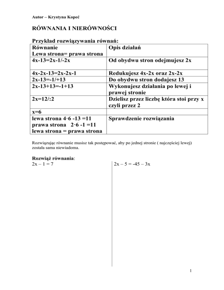 Autor – Krystyna Kopeć RÓWNANIA I NIERÓWNOŚCI Przykład rozwiązywania równań: Równanie Opis działań Lewa strona= prawa strona 4x-13=2x-1/-2x Od obydwu stron odejmujesz 2x 4x-2x-13=2x-2x-1 2x-13=-1/+13 2x-13+13=-1+13 2x=12/:2 x=6 lewa strona 4·6 -13 =11 prawa strona 2·6 -1 =11 lewa strona = prawa strona Redukujesz 4x-2x oraz 2x-2x Do obydwu stron dodajesz 13 Wykonujesz działania po lewej i prawej stronie Dzielisz przez liczbę która stoi przy x czyli przez 2 Sprawdzenie rozwiązania Rozwiązując równanie musisz tak postępować, aby po jednej stronie ( najczęściej lewej) została sama niewiadoma. Rozwiąż równania: 2x – 1 = 7 2x – 5 = -45 – 3x 1 2x + 6 = -2x +4 -8x+2=18 -4x-2=6 5x+1=3x-4 8x+1=4x-15 12x=-24 2