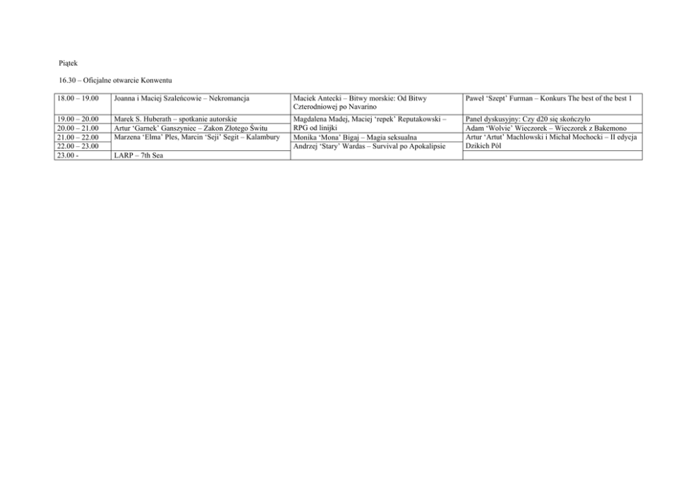 Piątek 16.30 – Oficjalne otwarcie Konwentu 18.00 – 19.00 Joanna i Maciej Szaleńcowie – Nekromancja Maciek Antecki – Bitwy morskie: Od Bitwy Czterodniowej po Navarino Paweł ‘Szept’ Furman – Konkurs The best of the best 1 19.00 – 20.00 20.00 – 21.00 21.00 – 22.00 22.00 – 23.00 23.00 - Marek S. Huberath – spotkanie autorskie Artur ‘Garnek’ Ganszyniec – Zakon Złotego Świtu Marzena ‘Elma’ Ples, Marcin ‘Seji’ Segit – Kalambury Magdalena Madej, Maciej ‘repek’ Reputakowski – RPG od linijki Monika ‘Mona’ Bigaj – Magia seksualna Andrzej ‘Stary’ Wardas – Survival po Apokalipsie Panel dyskusyjny: Czy d20 się skończyło Adam ‘Wolvie’ Wieczorek – Wieczorek z Bakemono Artur ‘Artut’ Machlowski i Michał Mochocki – II edycja Dzikich Pól LARP – 7th Sea Sobota 10.00 – 11.00 Krzysztof ‘Jaxa’ Rudek – Zagłada zakonu Jedi 11.00 – 12.00 Magdalena Madej, Maciej ‘repek’ Reputakowski – Warsztaty komiksowe Aleksandra ‘Arwena’ Busse, Piotr ‘Azder’ Wydra – „Apokalipsa w Śródziemiu” Michał Sołtysiak - Apokaliptycznie Nudny Konkurs 12.00 – 13.00 13.00 – 14.00 Michał Studniarek – Rzym upadł – i co dalej? Kuźnia Gier – prezentacja Wiochmen Rejsera 14.00 – 15.00 15.00 – 16.00 16.00 – 17.00 Romuald Pawlak - Zagłada imperiów indiańskich Marcin ‘Seji’ Segit – Warhammer II edycja Spotkanie z tłumaczami II edycji Warhammera 17.00 – 18.00 18.00 – 19.00 19.00 – 20.00 Panel wydawców RPG Panel dyskusyjny: Jak stworzyć dobrą grę RPG Wolf Fang – Crystalicum Julian Czurko – Piekło ciała, demoniczna nieczystość Krzysztof ‘Bookat’ Bortel - I żyli przez pewien czas i niezbyt szczęśliwie - apokalipsa i postapokalipsa w serialach fantastycznych Michał Dagajew – Warsztaty fotograficzne 20.00 – 21.00 Grzegorz ‘Gregg’ Bonikowski – Konkurs wiedzy o Warhammerze Michał ‘Puszkin’ Marszalik – Motywacja drużyny: po co Maciek Antecki – Okręty wieku pary rozwiązywać quest? Mateusz ‘Pinki’ Budziakowski – Inkwizycja czyli Wolf Fang prezentuje: Krew, pożoga, zniszczenie Tajemnice Watykanu vol. 2 LARP: Wolsung 21.00 – 22.00 22.00 – 23.00 23.00 - Piotr Konieczny – Jutro dla zaawansowanych, czyli apokalipsa naukowo Piotr W. Cholewa – Zakazane kreskówki Krzysztof ‘Bookat’ Bortel – Seriale fantastyczne – sesje i kampanie instant Andrzej ‘Stary’ Wardas - Wszystko o zabijaniu – czyli po co mi śrutówka skoro żyletka wychodzi taniej Spotkanie z redakcją Gozoku Adam ‘Wolvie’ Wieczorek i Andrzej Chwalisz – Konkurs: Znajdź Cthulhu w Rokuganie! Paweł ‘Szept’ Furman – Konkurs The best of the best 2 Maciej Sabat – Apokalipsy, które nie nadeszły Julian Czurko – Siedem fortun i łódź skarbów. Na skrzyżowaniu kultur azjatyckich Barbara Lach – Celtyckie mity Avalonu i Inlandii Cyprian ‘ Cypis’ Bogacz – Życie w korporacji Marcin Tysler – Apokalipsa Jana Artur ‘Garnek’ Ganszyniec – Prezentacja Wolsunga Michał ‘Puszon’ Stachyra, grupa Twój Stary – Warsztaty kalamburowe Piotr ‘Skała’ Jurgiel – Wilkołak w nowym WoDzie LARP: Warhammer Niedziela 10.00 – 11.00 11.00 – 11.30 11.30 – 12.00 12.00 – 13.00 13.00 – 14.00 14.00 – 15.00 15.00 – 16.00 Spotkanie organizatorów konwentów. Adrian ‘Alan’ Bogacz – Jak zostać trollem – warsztaty charakteryzacyjne Wojciech Rzadek – Warsztaty prowadzenia: Akcja na sesji Katarzyna i Andrzej Pilipiuk – Konkurs kuriozalny 16.00 – 17.00 17.00 – 18.00 18.00 – 19.00 Romuald Pawlak – Indiańska apokalipsa 19.00 – 20.00 Bogusław ‘Mordred’ Kleszczyński – Stosunki Fandom Kościół Marzena ‘Elma’ Ples, Marcin ‘Seji’ Segit – Kalambury 20.00 – 21.00 Łukasz "Miagi" Młotkowski, Bartek "Frost" Gackowski – Filmowy konkurs Star Wars Marzena ‘Elma’ Ples, Marcin ‘Seji’ Segit – Biblijny konkurs apokaliptyczny Michał Sołtysiak – Najbardziej krwawe jatki w historii świata Paweł ‘Szept’ Furman – Konkurs Retro TV Jakub Link-Lenczowski – Podsumowanie „Władcy pierścieni” po wersjach rozszerzonych Piotr W. Cholewa – Jak udaremniliśmy koniec świata Łukasz ‘Morfion’ Kaleta – Prawda o życiu żeglarzy w okresie wielkich żaglowców Julian Czurko – Vendel w obrazach, obrazy w Vendelu Julian Czurko – Kosmiczny pożar dni ostatnich Brabara Lach, Julian Czurko – Warsztaty przygotowywania pomocy na sesje 21.00 – 22.00 22.00 – 23.00 Maciej Sabat – Sławni mordercy IV 23.00 - LARP: Wilkołak Piotr Konieczny – Konstytucja Trzeciego Maja czyli Apokalipsa I Rzeczypospolitej Rafał 'Merlin' Hordyjewski – Antychryst Wydawnictwo Portal - Tajemnice świata Monastyru Maciej Sabat – Jak Hitler próbował zniszczyć świat Michał Mochocki – Diabły Polskie Tomasz Z. Majkowski – Warsztaty recenzenckie Michał Sołtysiak – Dowódcy wypraw krzyżowych Wydawnictwo Portal – Krowy zdobędą fandom Tomasz Z. Majkowski – Piętnastu Benedyktów Marta Komornicka, Tomasz Z. Majkowski, Michał ‘Puszon’ Stachyra – Martin obnażony Artur ‘Garnek’ Ganszyniec – Nowy WoD – prezentacja Katarzyna ‘Bagheera’ Bodziony – Upadek Cesarstwa Chińskiego Piotr ‘Skała’ Jurgiel i Aleksander ‘Alex’ Daukszewicz – Śmiertelnicy w nowym WoDzie Łukasz Czyżewski – Muzyczny konkurs apokaliptyczny LARP: Neuroshima Poniedziałek 10.00 – 11.00 Ula Majka – Czy krasnoludy mają stryjenki? Piotr ‘Ithil’ Grygiel – Gawęda o pancerzu 11.00 – 12.00 12.00 – 13.00 Maciej Sabat – Masoni Małgorzata Majkowska – Jak słuchać, żeby słyszeć. Warsztaty komunikacyjne Krystyna Nahlik – Tajemnice Tarota Paweł „Czeźwy” Marchwica – I znów bijatyka cały dzień Michał Sołtysiak – Historia alternatywna w 13.00 – 14.00 Paweł „Czeźwy” Marchwica – Zielarstwo, czyli jak kogoś nakarmić, rozkochać i otruć. Barbara Lach, Julian Czurko – Konkurs qiuniowy Kuźnia G