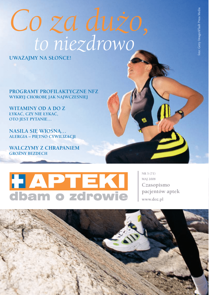 Co za dużo, to niezdrowo UWAŻAJMY NA SŁOŃCE! PROGRAMY PROFILAKTYCZNE NFZ WYKRYJ CHOROBĘ JAK NAJWCZEŚNIEJ WITAMINY OD A DO Z ŁYKAĆ, CZY NIE ŁYKAĆ, OTO JEST PYTANIE… NASILA SIĘ WIOSNĄ… ALERGIA – PIĘTNO CYWILIZACJI WALCZYMY Z CHRAPANIEM GROŹNY BEZDECH NR 5 7/8 (71) (61/62) LIPIEC/SIERPIEŃ MAJ 2008 2007 Czasopismo pacjentów aptek www.dbamozdrowie.pl www.doz.pl infolinia: 0-800 APTEKI [278-354] www.doz.pl 1 2 infolinia: 0-800 APTEKI [278-354] www.doz.pl 1 Aktualności ZAPRASZAMY DO ZAKUPÓW W KSIĘGARNI WYSYŁKOWEJ PROGRAMU APTEKI DBAM O ZDROWIE. W tym numerze polecamy Książkę Miesiąca „Rwa kulszowa”, której autor bardzo wnikliwie omawia zarówno rwę kulszową, jak i inne zespoły bólowe kręgosłupa. Ponadto polecamy nowość: • „ŻYWIENIE W STWARDNIENIU ROZSIANYM” – poradnik, który ma służyć praktyczną pomocą na co dzień. Dzięki zawartej w nim wiedzy możemy wpływać na poszczególne objawy towarzyszące chorobie, ograniczające m.in. liczbę rzutów, łagodzące takie dolegliwości, jak: zaparcia, męczliwość, problemy z pęcherzem. Autorzy mają nadzieję, że ich poradnik ułatwi życie chorych i korzystnie wpłynie na ich samopoczucie, zarówno fizyczne, jak i psychiczne. 2 Zamówienia prosimy przesyłać na formularzu zamieszczonym wewnątrz czasopisma lub na stronie internetowej www.doz.pl Od redakcji DRODZY CZYTELNICY Wiosna to czas budzenia się do życia przyrody, ale również czas większego wysiłku dla naszych organizmów, które po zimowym marazmie potrzebują energetycznego „kopa” w postaci zwiększonej dawki witamin i mikroelementów. Witaminy to związki niezbędne do wzrostu i rozwoju tkanek organizmu oraz do prawidłowego przebiegu procesów metabolicznych w ustroju człowieka. Ich brak jest bardzo, ale musimy również pamiętać, ze zbyt duża dawka też może być szkodliwa. Więcej o witaminach znajdą Państwo w artykułach „Łykać, czy nie łykać, oto jest pytanie…” i „Dzieci potrzebują witamin D i K”. Podobnie jak witaminy, do prawidłowego funkcjonowania naszego organizmu niezbędne jest promieniowanie słoneczne. Umiejętne i właściwe korzystanie ze słońca może być nie tylko źródłem przyjemności, ale także zdrowia. Należy jednak wiedzieć, iż oprócz dobroczynnego działania, słońce może wywoływać też wiele objawów niepożądanych. O czym przestrzegamy przed urlopami w artykule „Uważajmy na słońce!” W majowym numerze czasopisma Pacjentów Aptek „Dbam o Zdrowie” prezentujemy także wyczerpujący artykuł na temat profilaktycznych programów zdrowotnych Narodowego Funduszu Zdrowia, które umożliwiają wykrycie zagrożenia lub wczesne zdiagnozowanie chorób powszechnie występujących. Do programów tych mogą zgłaszać się osoby z określonych grup wiekowych, które spełniają dodatkowe kryteria kwalifikacji, o których możecie przeczytać Państwo w tekście „Programy profilaktyczne NFZ w podstawowej opiece zdrowotnej” Życzymy miłej lektury! Redakcja Przewodnik po aptece „Dbam o zdrowie” - czasopismo pacjentów aptek Wydawca: Bez Recepty Sp. z o.o. (spółka Polskiej Grupy Farmaceutycznej), 91-342 Łódź, ul. Zbąszyńska 3, tel. (0 42) 613 34 44. Prezes wydawnictwa: Wojciech Rosicki. Redakcja: adres jak wyżej, redaguje zespół: Redaktor Naczelny: Krzysztof Chrzanowski, Sekretarz Redakcji: Grzegorz Dróżdż, Redaktor Graficzny: Izabela Raduszewska. Dział Reklamy: Sebastian Ciechomski, tel. (0 42) 613 35 86, 0 601 292 272, e-mail: [email protected], Katarzyna Kustra, tel. (0 42) 613 35 86, e-mali: [email protected] Skład: JURCZYK DESIGN, www.jurczykdesign.com. Zdjęcia: FPM, Indigo. Nadzór farmaceutyczny: Jerzy Stasiak, Druk: RR Donnelley Europe Sp. z o.o. Redakcja nie odpowiada za treść reklam. Nie zwraca materiałów niezamówionych. Zastrzega sobie prawo do dokonywania skrótów redakcyjnych, nadawania tytułów i śródtytułów. Za treść opisów preparatów odpowiedzialność Zleceniodawcy. infolinia: 0-800 APTEKI [278-354] ponoszą www.doz.pl SPIS TREŚCI Z OKŁADKI: UWAŻAJMY NA SŁOŃCE 4 ALERGIA - PIĘTNO CYWILIZACJI 24 ŁYKAĆ, CZY NIE ŁYKAĆ - OTO JEST PYTANIE 30 PROGRAMY 38 PROFILAKTYCZNE NFZ W PODSTAWOWEJ OPIECE ZDROWOTNEJ GROŹNY BEZDECH 48 WSTYDLIWY PROBLEM 10 DZIECI POTRZEBUJĄ WITAMIN D i K 18 ŻÓŁTACZKA CHOROBA, CZY OBJAW? 42 LISTA LAUREATÓW 53 KRZYŻÓWKA 56 PORADNIA 58 KSIĘGARNIA 62 3 WARTO WIEDZIEĆ 4 Uważajmy na słońce! PROMIENIOWANIE SŁONECZNE JEST NIEZBĘDNE DO PRAWIDŁOWEGO FUNKCJONOWANIA NASZEGO ORGANIZMU. JEDNAK JEGO ZBYT SILNA DAWKA MOŻE BYĆ GROŹNA DLA CZŁOWIEKA. Ewa Marańda infolinia: 0-800 APTEKI [278-354] www.doz.pl 5 WARTO WIEDZIEĆ Promieniowanie słoneczne ma korzystny wpływ na samopoczucie, aktywność fizyczną, pobudza wydzielanie wielu hormonów, umożliwia syntezę witamin z grupy D. Umiejętne i właściwe korzystanie ze słońca może być nie tylko źródłem przyjemności, ale także zdrowia. Należy jednak wiedzieć, iż oprócz dobroczynnego działania, słońce może wywoływać też wiele objawów niepożądanych. Panująca od wielu lat moda na opalanie, spowodowała wzrost zainteresowania niepożądanymi efektami działania promieni słonecznych. Zaczęto badać i opisywać coraz więcej zmian skórnych wynikających z ekspozycji na słońce. DZIAŁANIE PROMIENIOWANIA ULTRAFIOLETOWEGO Promieniowanie słoneczne jest promieniowaniem elektromagnetycznym. Obejmuje ono promieniowanie podczerwone, światło widzialne oraz promieniowanie ultrafioletowe (UV). To ostatnie dzieli się na trzy główne zakresy o różnych efektach biologicznych: • UVC - jest promieniowaniem o najkrótszej długości fali. Ma najwyższą energię, jest silnie rumieniotwórcze, ale jest prawie całko- 6 wicie pochłaniane przez warstwę ozonową atmosfery i w normalnych warunkach nie dociera na powierzchnię Ziemi. • UVB - promieniowanie o średniej długości fali ma bardzo silne właściwości rumieniot