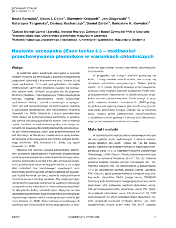 KOMUNIKATY RYBACKIE Nr 1 (126)/2012, 7 – 10 Beata Sarosiek1, Beata I. Cejko1, S³awomir Krejszeff3, Jan Glogowski1,2, Katarzyna Targoñska3, Dariusz Kucharczyk3, Daniel ¯arski3, Rados³aw K. Kowalski1 1 Zak³ad Biologii Gamet i Zarodka, Instytut Rozrodu Zwierz¹t i Badañ ¯ywnoœci PAN w Olsztynie 2 Katedra Ichtiologii, Uniwersytet Warmiñsko-Mazurski w Olsztynie Katedra Rybactwa Jeziorowego i Rzecznego, Uniwersytet Warmiñsko-Mazurski w Olsztynie 3 Nasienie szczupaka (Esox lucius L.) – mo¿liwoœci przechowywania plemników w warunkach ch³odniczych Wstêp ¿noœci od jego biologii rozrodu oraz sk³adu jonowego pla- W ostatnich latach liczebnoœæ szczupaka w polskich wodach wyraŸnie siê zmniejszy³a z powodu nieracjonalnej zmy nasienia. W przypadku ryb, których plemniki poruszaj¹ siê gospodarki rybackiej i k³usownictwa oraz bardzo du¿ej krótko i maj¹ niewiele mitochondriów, nie stosuje siê presji wêdkarskiej. Szczupak jest gatunkiem niezwykle dodatków substratów energetycznych. Mo¿na jednak wartoœciowym, gdy¿ jako drapie¿ca ¿ywi¹cy siê przewa- s¹dziæ, ¿e w czasie d³ugookresowego przechowywania, ¿nie rybami ma³o cennymi przyczynia siê do poprawy substraty takie mog³yby stanowiæ dodatkowe Ÿród³o ener- struktury rybostanu. Rozwijaj¹ca siê w Polsce akwakultura gii dla plemników. Nascimento i in. (2008) wykazali, ¿e gli- wymaga sztucznego koliza stanowi pierwszorzêdowe Ÿród³o energii w przy- zap³odnienia. Jedn¹ z technik stosowanych w wylêgar- padku nasienia cz³owieka. Lahnsteiner i in. (1993) podaj¹, niach ryb jest krótkookresowe przechowywanie nasienia ¿e glukoza jest wykorzystywana jako Ÿród³o energii pod- w warunkach ch³odniczych, bez koniecznoœci mro¿enia czas ruchu plemników pstr¹ga. Dlatego te¿, w niniejszej (Kowalski i in. 2009). Metoda ta z du¿ym powodzeniem pracy podjêto próbê zastosowania rozcieñczalników mo¿e s³u¿yæ do przechowywania plemników w sytuacji, z dodatkiem cukrów (glukozy i fruktozy) do krótkookreso- gdy samice dojrzewaj¹ póŸniej ni¿ samce. Jest to metoda wego przechowywania nasienia szczupaka. ci¹g³ego doskonalenia metod prosta, mo¿liwa do zastosowania praktycznie wszêdzie, ponadto nie powoduje tak drastycznej utraty jakoœci nasienia jak kriokonserwacja, je¿eli czas przechowywania nie Materia³ i metody jest zbyt d³ugi. W literaturze znaleŸæ mo¿na opisy krótko- W doœwiadczeniu wykorzystano nasienie pochodz¹ce okresowego przechowywania plemników pstr¹ga têczowego (McNiven 1993, Kowalski i in. 2008), czy stynki od szczupaków (n=5), wy³owionych z Jeziora Kortow- (Kowalski i in. 2010). poboru nasienia ryby przetrzymywano w basenach o tem- skiego (Olsztyn, p³n.-wsch. Polska, fot. 1a). Do czasu Nasienie ryb cechuje wysoka koncentracja plemni- peraturze wody 10°C, w Katedrze Rybactwa Jeziorowego ków, co stanowi ograniczenie w mo¿liwoœci d³ugotrwa³ego i Rzecznego, UWM, Olsztyn. W celu pobrania nasienia ryby przetrzymywania nasienia w warunkach obni¿onego metabolizmu (temperatura poni¿ej 4°C). Aby zmniejszyæ mo¿li- uœpiono w roztworze Propiscinu (1 ml l-1, fot. 1b). Nasienie woœæ grawitacyjnej sedymentacji plemników, a co za tym idzie uszkodzeñ b³on komórkowych wywo³anych naciskiem masy plemników oraz umo¿liwiæ dostêp jak najwiêkszej liczbie komórek do tlenu, nasienie nierozcieñczone przechowuje siê w cienkiej warstwie. Aby zwiêkszyæ objêtoœæ przechowywanego nasienia oraz wyd³u¿yæ okres jego prze¿ywalnoœci w warunkach in vitro stosuje siê odpowiednie dla gatunku bufory immobilizuj¹ce. Maj¹ one na celu pobrano metod¹ masa¿u pow³ok brzusznych (fot. 1c). Pobrane nasienie (fot. 1d) przewieziono w temperaturze +4°C do laboratorium Zak³adu Biologii Gamet i Zarodka, PAN Olsztyn, gdzie przeprowadzono komputerow¹ analizê ruchu plemników CASA (Image House CRISMAS Company Ltd). Analizowano nastêpuj¹ce parametry ruchu plemników: VCL (ca³kowita prêdkoœæ plemników; μm/s), VSL (prostoliniowoœæ ruchu plemników; μm/s), VAP (œred- rozrzedzenie plemników oraz zniwelowanie ewentualnego nia prêdkoœæ plemników; μm/s), LIN (liniowoœæ; %), STR negatywnego wp³ywu takich zanieczyszczeñ nasienia jak (kierunkowoœæ; %), WOB (wskaŸnik drgañ plemników; %), mocz (Cabrita i in. 2008). Sk³ad buforów immobilizuj¹cych ALH (amplituda bocznych wychyleñ g³ówki; μm), BCF dobierany jest indywidualnie do ka¿dego gatunku, w zale- (czêstotliwoœæ zmiany pracy witki; Hz), MOT (odsetek 1/2012 KOMUNIKATY RYBACKIE 7 Fot. 1. Szczupak od³owiony z Jeziora Kortowskiego (a), usypianie ryb (b), pobieranie nasienia szczupaka (c, d). plemników ruchliwych; %), PRG (odsetek plemników pogorszenie wartoœci takich parametrów jak VCL, VSL, o ruchu postêpowym; %). VAP, czy spadek odsetka ruchliwych plemników (MOT) Do aktywacji ruchu plemników wykorzystano roztwór 40 mM NaHCO3, z dodatkiem 20 mM Tris i 0,5% albuminy, z 79% do zaledwie 32% (rys. 1). Dodatek buforu immobili- pH 8,5 (Kowalski i in. 2010). Do krótkookresowego przecho- eksperymentalnej, gdzie mlecz rozcieñczono buforem wywania pos³u¿y³ p³yn immobilizuj¹cy (A) o nastêpuj¹cym sk³adzie: 130 mM NaCl, 25 mM NaHCO3, 40 mM KCl, immobilizuj¹cym z dodatkiem glukozy, ruchliwoœæ plemni- 20mM Tris, 2 mM CaCl2, 1,5 mM MgCl2 x 6 H2O (Kobayashi godzinach – 48%, podczas gdy w grupie kontrolnej po 96 i in. 2004). Ponadto do jednej czêœci p³ynu immobilizuj¹cego dodano 10 mM glukozê (B), do drugiej czêœci 10 godzinach nie obserwowano ju¿ ruchliwych plemników. Nie mM fruktozê (C). Parametry ruchu oraz ca³kowity czas pomiêdzy poszczególnymi wariantami doœwiadczalnymi, tj. ruchu plemników analizowano w czasie „0” – bezpoœrednio miêdzy nasieniem rozcieñczonym buforem immobili- po pobraniu i przywiezieniu do laboratorium, po 24 oraz po zuj¹cym bez dodatków (A) oraz buforem z dodatkiem 96 godzinach przechowywania w temperaturze +4°C. cukrów, glukozy (B) i fruktozy (C)