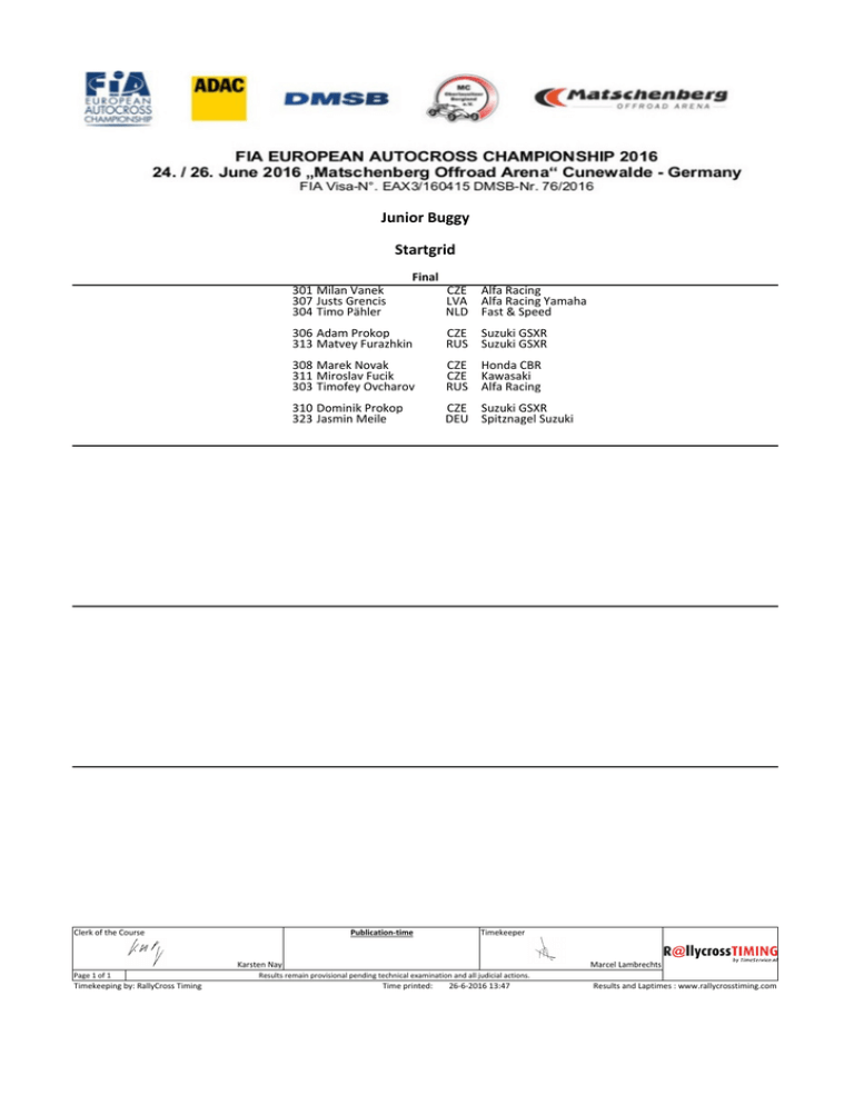 Junior Buggy Startgrid Final Clerk of the Course 301 Milan Vanek 307 Justs Grencis 304 Timo Pähler CZE Alfa Racing LVA Alfa Racing Yamaha NLD Fast & Speed 306 Adam Prokop 313 Matvey Furazhkin CZE RUS Suzuki GSXR Suzuki GSXR 308 Marek Novak 311 Miroslav Fucik 303 Timofey Ovcharov CZE CZE RUS Honda CBR Kawasaki Alfa Racing 310 Dominik Prokop 323 Jasmin Meile CZE Suzuki GSXR DEU Spitznagel Suzuki Publication-time Timekeeper Karsten Nay Page 1 of 1 Timekeeping by: RallyCross Timing Marcel Lambrechts Results remain provisional pending technical examination and all judicial actions. Time printed: 26-6-2016 13:47 Results and Laptimes : www.rallycrosstiming.com