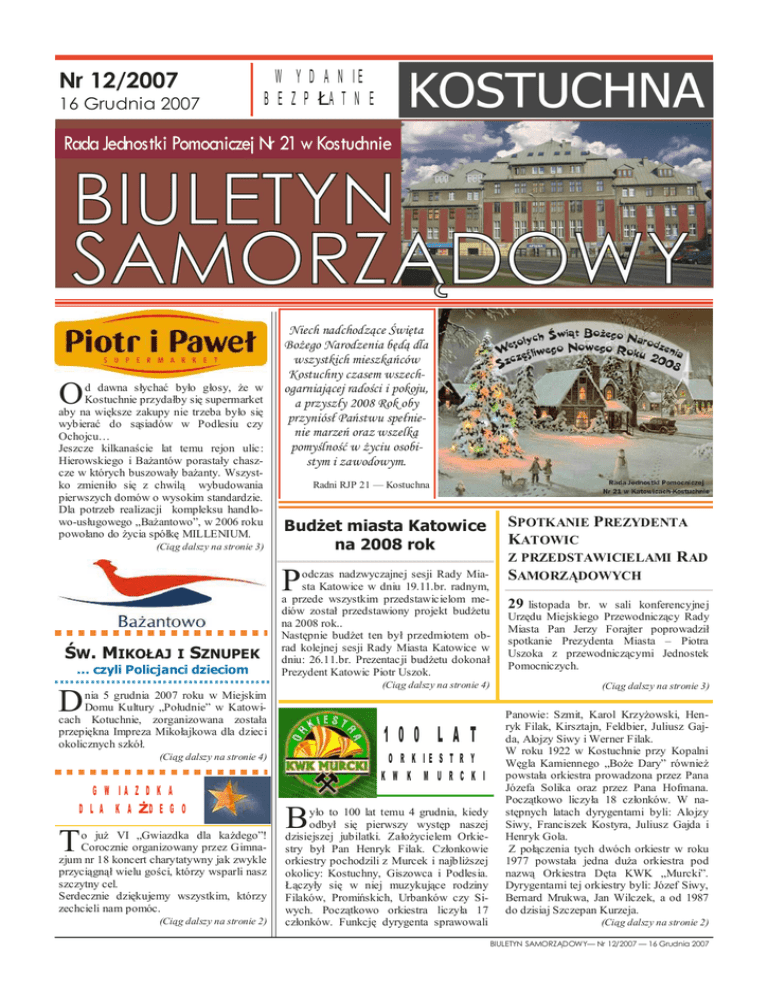 Nr 12/2007 16 Grudnia 2007 WYDANIE BEZP ATNE Rada Jednostki Pomocniczej Nr 21 w Kostuchnie O d dawna s ycha by o g osy, e w Kostuchnie przyda by si supermarket aby na wi ksze zakupy nie trzeba by o si wybiera do s siadów w Podlesiu czy Ochojcu… Jeszcze kilkana cie lat temu rejon ulic: Hierowskiego i Ba antów porasta y chaszcze w których buszowa y ba anty. Wszystko zmieni o si z chwil wybudowania pierwszych domów o wysokim standardzie. Dla potrzeb realizacji kompleksu handlowo-us ugowego „Ba antowo”, w 2006 roku powo ano do ycia spó MILLENIUM. (Ci g dalszy na stronie 3) Niech nadchodz ce wi ta Bo ego Narodzenia b dla wszystkich mieszka ców Kostuchny czasem wszechogarniaj cej rado ci i pokoju, a przysz y 2008 Rok oby przyniós Pa stwu spe nienie marze oraz wszelk pomy lno w yciu osobistym i zawodowym. Radni RJP 21 — Kostuchna Bud et miasta Katowice na 2008 rok P W. MIKO AJ I SZNUPEK … czyli Policjanci dzieciom odczas nadzwyczajnej sesji Rady Miasta Katowice w dniu 19.11.br. radnym, a przede wszystkim przedstawicielom mediów zosta przedstawiony projekt bud etu na 2008 rok.. Nast pnie bud et ten by przedmiotem obrad kolejnej sesji Rady Miasta Katowice w dniu: 26.11.br. Prezentacji bud etu dokona Prezydent Katowic Piotr Uszok. (Ci g dalszy na stronie 4) D nia 5 grudnia 2007 roku w Miejskim Domu Kultury „Po udnie” w Katowicach Kotuchnie, zorganizowana zosta a przepi kna Impreza Miko ajkowa dla dzieci okolicznych szkó . 100 LAT ORKIESTRY KWK MURCKI (Ci g dalszy na stronie 4) GWIAZDKA DLA KA DEGO T o ju VI „Gwiazdka dla ka dego”! Corocznie organizowany przez Gimnazjum nr 18 koncert charytatywny jak zwykle przyci gn wielu go ci, którzy wsparli nasz szczytny cel. Serdecznie dzi kujemy wszystkim, którzy zechcieli nam pomóc. (Ci g dalszy na stronie 2) B o to 100 lat temu 4 grudnia, kiedy odby si pierwszy wyst p naszej dzisiejszej jubilatki. Za ycielem Orkiestry by Pan Henryk Filak. Cz onkowie orkiestry pochodzili z Murcek i najbli szej okolicy: Kostuchny, Giszowca i Podlesia. czy y si w niej muzykuj ce rodziny Filaków, Promi skich, Urbanków czy Siwych. Pocz tkowo orkiestra liczy a 17 cz onków. Funkcj dyrygenta sprawowali SPOTKANIE PREZYDENTA KATOWIC Z PRZEDSTAWICIELAMI RAD SAMORZ DOWYCH 29 listopada br. w sali konferencyjnej Urz du Miejskiego Przewodnicz cy Rady Miasta Pan Jerzy Forajter poprowadzi spotkanie Prezydenta Miasta – Piotra Uszoka z przewodnicz cymi Jednostek Pomocniczych. (Ci g dalszy na stronie 3) Panowie: Szmit, Karol Krzy owski, Henryk Filak, Kirsztajn, Feldbier, Juliusz Gajda, Alojzy Siwy i Werner Filak. W roku 1922 w Kostuchnie przy Kopalni gla Kamiennego „Bo e Dary” równie powsta a orkiestra prowadzona przez Pana Józefa Solika oraz przez Pana Hofmana. Pocz tkowo liczy a 18 cz onków. W nast pnych latach dyrygentami byli: Alojzy Siwy, Franciszek Kostyra, Juliusz Gajda i Henryk Gola. Z po czenia tych dwóch orkiestr w roku 1977 powsta a jedna du a orkiestra pod nazw Orkiestra D ta KWK „Murcki”. Dyrygentami tej orkiestry byli: Józef Siwy, Bernard Mrukwa, Jan Wilczek, a od 1987 do dzisiaj Szczepan Kurzeja. (Ci g dalszy na stronie 2) BIULETYN SAMORZ DOWY— Nr 12/2007 — 16 Grudnia 2007 Strona 2 GWIAZDKA DLA KA DEGO WI TECZNY KONCERT CHARYTATYWNY (Ci g dalszy ze strony 1) W sposób szczególny dzi kujemy paniom Magdalenie Kurek oraz Agacie Krzemi skiej, które przygotowa y program artystyczny, paniom Ewie Ciesielskiej i Iwonie Dudzik, które czuwa y nad wykonaniem dekoracji, wszystkim pracownikom szko y oraz uczniom i rodzicom pomagaj cym w przygotowaniu imprezy. Szczególnie gor co chcemy tak e podzi kowa artystom, którzy u wietnili nasz koncert, pani Magdzie Anio z przyjació mi, Marcinowi Wyrostkowi z zespo em, a tak e uczniom naszego gimnazjum, którzy specjalnie na t okazj przygotowali musical, balet i programy taneczne. W nast pnym numerze Biuletynu przedstawimy obszern relacj z Koncertu Charytatywnego oraz informacj na temat zebranych rodków finansowych. Anna Kuczek (nauczycielka Gimnazjum Nr 18) Jedn z form pozyskania rodków by a sprzeda s odko ci 100 LAT ORKIESTRY KWK MURCKI (Ci g dalszy ze strony 1) Obecnie orkiestra liczy 65 cz onków. Najstarsi muzycy orkiestry graj cy do dzisiaj zaczynali przygod z muzyk ponad pó wieku temu. Nale do nich Pan Bernard Urbanek graj cy 69 lat, Pan Jan Kotas gracy 62 lata, Pan Pawe Urbanek - Prezes Zarz du Orkiestry graj cy 59 lat, Pan Ryszard Chmieli ski graj cy 56 lat. W swojej wiekowej historii orkiestra ma si czym pochwali . W niezliczonej ilo ci wyst pów zdoby a wiele nagród i wyró nie , czego dowodem s dziesi tki dyplomów i pucharów zdobi cych siedzib orkiestry. U wietnia a swoj gr wiele uroczysto ci pa stwowych i ko cielnych. Poprzez muzyk propagowa a pi kno kultury polskiej w kraju i za granic . Nawi za a kontakty i prowadzi wymian artystyczn z orkiestrami z: W gier, Niemiec, W och, i Finlandii. Za ca okszta t dzia alno ci w 1986 zosta a uhonorowana przez Polski Zwi zek Chórów i Orkiestr Z ot Odznak Honorow . Uroczysto ci jubileuszowe obchodzone by y 8 grudnia 2007 r. w Domu Kultury „Po udnie” w Katowicach-Kostuchnie. Przybyli na nie: Wiceprezydent Miasta Katowice – Pani Krystyna Siejna Dyrektor KWK „Murcki” – Pan Staniaw Lasek Wicedyrektor KWK „Murcki” – Pani Ewa Cerek Wiceprezes Katowickiego Holdingu W glowego S.A. – Pan Jaros aw Zuzelski, Cz onek Zarz du Oddzia u skiego PZChiO – Pan Rufin Bainczyk Prezes Okr gu Katowickiego PZChiO – Pan Zdzis aw Czenczek Dyrygent Okr gu Katowickiego PZChiO – Pan Krzysztof Karol Kaganiec oraz dyrygenci zaprzyja nionych chórów, orkiestr i sympatycy orkiestry. Program koncertu z okazji jubileuszu 100lecia Orkiestry D tej KWK „Murcki” przedstawia si nast puj co: Wojciech Kilar – Polonez z filmu „Pan Tadeusz” Klaus-Peter Bruchmann – Belvedere Timo Forsström – Linnan pusto – marssi V. Monti – Czardasz – solo na ksylofonie Miko aj Kurzeja Daniele Carnevali – Baltimore Augustyn Lara – Granada opr. Ron