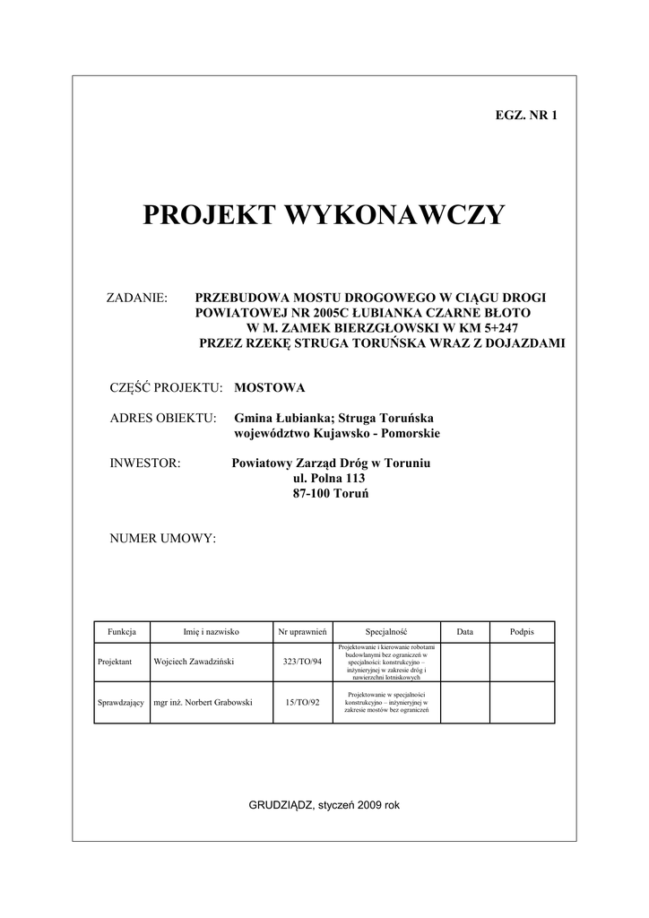 EGZ. NR 1 PROJEKT WYKONAWCZY ZADANIE: PRZEBUDOWA MOSTU DROGOWEGO W CIĄGU DROGI POWIATOWEJ NR 2005C ŁUBIANKA CZARNE BŁOTO W M. ZAMEK BIERZGŁOWSKI W KM 5+247 PRZEZ RZEKĘ STRUGA TORUŃSKA WRAZ Z DOJAZDAMI CZĘŚĆ PROJEKTU: MOSTOWA ADRES OBIEKTU: Gmina Łubianka; Struga Toruńska województwo Kujawsko - Pomorskie INWESTOR: Powiatowy Zarząd Dróg w Toruniu ul. Polna 113 87-100 Toruń NUMER UMOWY: Funkcja Imię i nazwisko Nr uprawnień Specjalność Projektant Wojciech Zawadziński 323/TO/94 Projektowanie i kierowanie robotami budowlanymi bez ograniczeń w specjalności: konstrukcyjno – inżynieryjnej w zakresie dróg i nawierzchni lotniskowych Sprawdzający mgr inż. Norbert Grabowski 15/TO/92 Projektowanie w specjalności konstrukcyjno – inżynieryjnej w zakresie mostów bez ograniczeń GRUDZIĄDZ, styczeń 2009 rok Data Podpis PROJEKT WYKONAWCZY ZAWARTOŚĆ OPRACOWANIA I. CZĘŚĆ OPISOWA 1. Podstawa opracowania......................................................................................... 3 2. Cel zadania, opis istniejącego mostu i uzasadnienie wykonania robót............ 3 3. Roboty przygotowawcze i rozbiórkowe.............................................................. 4 3.1. Postępowanie z materiałami z rozbiórki............................................................ 4 4. Roboty projektowe............................................................................................... 4 4.1. Kapy chodnikowe................................................................................................. 4 4.2. Roboty drogowe.................................................................................................... 5 5. Organizacja ruchu na czas robót........................................................................ 5 6. Spis rysunków....................................................................................................... 5 II. PRZEDMIAT ROBÓT I KOSZTORYS OFERTOWY III. RYSUNKI 1. Rys. nr 1 Projekt zagospodarowania terenu 1:500 2. Rys. nr 2 Rysunek ogólny 1:50 3. Rys. nr 3 Inwentaryzacja 1:50 4. Rys. nr 4 Chodnik 1:20 5. Rys. nr 5 Chodnik - zbrojenie 1:20 6. Rys. nr 6 Przekrój normalny drogi z chodnikiem 1:50 7. Rys. nr 7 Przekrój normalny drogi 1:50 8. Rys. nr 8 Widok zbrojenia po rozkuciu 1:20 2 PROJEKT WYKONAWCZY 3 CZĘŚĆ OPISOWA przebudowy mostu drogowego w ciągu drogi powiatowej nr 2005C Łubianka Czarne Błoto w m. Zamek Bierzgłowski w km 5+247 przez rzekę Struga Toruńska wraz z dojazdami 1. PODSTAWA OPRACOWANIA Projekt wykonawczy na wykonanie przebudowy mostu jest elementem dokumentacji technicznej. Dokumentacja została wykonana na mocy umowy nr.............. z dnia............ zawartej pomiędzy Powiatowym Zarządem Dróg Toruniu ul. Polna 113, 87100 Toruń a p. Norbertem Grabowskim zam. w 86-300 Grudziądz, ul. Księdza Łęgi 5 m. 42. Przy dokumentacji wykorzystano: o dokumentację wykonania obiektu \ 1990r., o archiwalne wpisy do ewidencji mostu, o własne spostrzeżenia i pomiary wykonane w ramach wizji lokalnej, o obecnie obowiązujące przepisy i normy 2. CEL ZADANIA, OPIS ISTNIEJĄCEGO MOSTU I UZASADNIENIE WYKONANIA ROBÓT Celem zadania jest przebudowa istniejącego żelbetowego mostu drogowego przez rz. Struga Toruńska, zlokalizowanego w miejscowości Zamek Bierzgłowski, w ciągu drogi powiatowej nr 2005C Łubianka – Czarne Błoto w km 5 + 247. Istniejący most przez rzekę Struga Toruńska jest jednoprzęsłowym mostem wykonanym jako zespolona konstrukcja z wykorzystaniem prefabrykowanych belek żelbetowych typu „Wągrowiec” o długości L = 6,0 m i szerokości 7,5 m. Szerokość jezdni 6,0 m. Światło poziome mostu wynosi 5,0 m. Schemat statyczny mostu belka swobodnie podparta. Istniejący most jest obiektem wyposażonym w balustrady stalowe. Przęsło mostu oparte jest na żelbetowych przyczółkach posadowionych bezpośrednio, zaopatrzone w skrzydła zawieszone. Kąt skrzyżowania osi mostu i osi jezdni 900. Przebudowa obiektu planowana jest ze względu na zwiększenie bezpieczeństwa pieszych. W trakcie wizji lokalnej stwierdzono: PROJEKT WYKONAWCZY 4 o w obrębie przyczółków uskoki jezdni do 6 cm, o na ścianach przyczółków zarysowania i pęknięcia nie powodujące zmniejszenia nośności obiektu, o stan gzymsów niezadowalający, pokazały się wykwity, zanieczyszczenia oraz nastąpiła wegetacja roślin, o skarpy w obrębie przyczółka porośnięte roślinnością i krzakami, nastąpiło ich osiadanie. 3. ROBOTY PRZYGOTOWAWCZE I ROZBIÓRKOWE Przed rozpoczęciem prac należy w terminie min. 7 dni powiadomić właściwy organ nadzoru budowlanego. Przebudowę mostu rozpocząć należy od rozbiórki istniejącej balustrady po prawej stronie mostu. Następnie należy rozebrać gzyms. W części drogowej należy zdemontować krawężnik biegnący wzdłuż mostu po lewej i prawej stronie. Należy zwrócić szczególną uwagę na zabezpieczenie koryta rzeki przed zanieczyszczeniem w postaci spadającego gruzu. 3.1. Postępowanie z materiałami z rozbiórki. Materiały z rozbiórkami należy wykorzystać w sposób następujący: o konstrukcję stalową balustrad oczyścić i pomalować, o destrukt z frezowania nawierzchni asfaltowej wykorzystać w budownictwie drogowym wzmacniając istniejące pobocze o destrukt z rozbiórki elementów betonowych należy przekruszyć i wykorzystać ponownie w budownictwie drogowym 4. ROBOTY PROJEKTOWE 4.1. Kapy chodnikowe. Po rozebraniu gzymsów do poziomu belki skrajnej wzdłuż mostu i skrzydełek należy oczyścić pozostające zbrojenie, które zostanie wykorzystane w nowej konstrukcji chodnika. Następnie należy wykonać szalunek. Po wykonaniu szalunku ułożyć zbrojenie, a pręty główne należy połączyć z belką za pomocą otworów wywierconych w belce głównej i zalanych żywicą epoksydową. Zmontować całość zbrojenia. Następnie należy zalać betonem B-30 (pierwszy etap betonowania). Po uzyskaniu odpowiedniej wytrzymałości wykonu