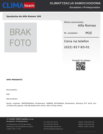 Sprężarka do Alfa Romeo 166 Marka samochodu: Alfa Romeo Nr. produktu: POZ Cena na telefon (022) 817-83-01 Przejdź do sklepu OPIS PRODUKTU Kod produktu: POZ Opis produktu: Numer oryginału: 60653653Marka Kompresora: SANDEN SDV16Model Kompresora: Wymiary: PV7 ø134 mm. (12V)Rocznik pojazdu: 166 (98-)Pojemność silnika: 166 (2.0)Typ silnika: © CLIMA TEAM Spółka z o.o. Doradztwo i Profesjonalizm Tel: (022) 817 83 01 Mobile: 0 501 642 528 ul. Staniewicka 2 03-310 Warszawa Fax: (022) 817 84 49 Mobile: 0 501 642 529 Zapraszamy od poniedziałku do piątku [email protected] Mobile: 0 500 119 528 w godz. 9:00 - 17:00 [email protected] projekt GRAFCOM | Netler Shop 1.020