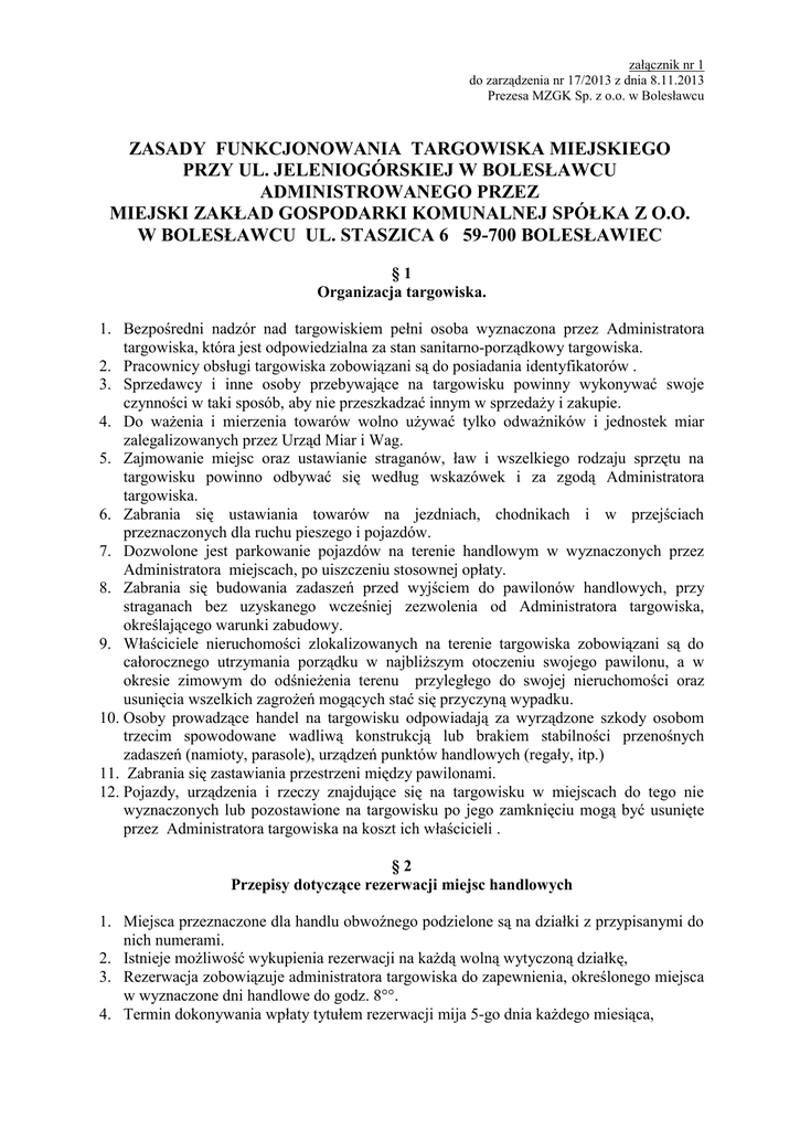 załącznik nr 1 do zarządzenia nr 17/2013 z dnia 8.11.2013 Prezesa MZGK Sp. z o.o. w Bolesławcu ZASADY FUNKCJONOWANIA TARGOWISKA MIEJSKIEGO PRZY UL. JELENIOGÓRSKIEJ W BOLESŁAWCU ADMINISTROWANEGO PRZEZ MIEJSKI ZAKŁAD GOSPODARKI KOMUNALNEJ SPÓŁKA Z O.O. W BOLESŁAWCU UL. STASZICA 6 59-700 BOLESŁAWIEC §1 Organizacja targowiska. 1. Bezpośredni nadzór nad targowiskiem pełni osoba wyznaczona przez Administratora targowiska, która jest odpowiedzialna za stan sanitarno-porządkowy targowiska. 2. Pracownicy obsługi targowiska zobowiązani są do posiadania identyfikatorów . 3. Sprzedawcy i inne osoby przebywające na targowisku powinny wykonywać swoje czynności w taki sposób, aby nie przeszkadzać innym w sprzedaży i zakupie. 4. Do ważenia i mierzenia towarów wolno używać tylko odważników i jednostek miar zalegalizowanych przez Urząd Miar i Wag. 5. Zajmowanie miejsc oraz ustawianie straganów, ław i wszelkiego rodzaju sprzętu na targowisku powinno odbywać się według wskazówek i za zgodą Administratora targowiska. 6. Zabrania się ustawiania towarów na jezdniach, chodnikach i w przejściach przeznaczonych dla ruchu pieszego i pojazdów. 7. Dozwolone jest parkowanie pojazdów na terenie handlowym w wyznaczonych przez Administratora miejscach, po uiszczeniu stosownej opłaty. 8. Zabrania się budowania zadaszeń przed wyjściem do pawilonów handlowych, przy straganach bez uzyskanego wcześniej zezwolenia od Administratora targowiska, określającego warunki zabudowy. 9. Właściciele nieruchomości zlokalizowanych na terenie targowiska zobowiązani są do całorocznego utrzymania porządku w najbliższym otoczeniu swojego pawilonu, a w okresie zimowym do odśnieżenia terenu przyległego do swojej nieruchomości oraz usunięcia wszelkich zagrożeń mogących stać się przyczyną wypadku. 10. Osoby prowadzące handel na targowisku odpowiadają za wyrządzone szkody osobom trzecim spowodowane wadliwą konstrukcją lub brakiem stabilności przenośnych zadaszeń (namioty, parasole), urządzeń punktów handlowych (regały, itp.) 11. Zabrania się zastawiania przestrzeni między pawilonami. 12. Pojazdy, urządzenia i rzeczy znajdujące się na targowisku w miejscach do tego nie wyznaczonych lub pozostawione na targowisku po jego zamknięciu mogą być usunięte przez Administratora targowiska na koszt ich właścicieli . §2 Przepisy dotyczące rezerwacji miejsc handlowych 1. Miejsca przeznaczone dla handlu obwoźnego podzielone są na działki z przypisanymi do nich numerami. 2. Istnieje możliwość wykupienia rezerwacji na każdą wolną wytyczoną działkę, 3. Rezerwacja zobowiązuje administratora targowiska do zapewnienia, określonego miejsca w wyznaczone dni handlowe do godz. 8°°. 4. Termin dokonywania wpłaty tytułem rezerwacji mija 5-go dnia każdego miesiąca, 5. W przypadku braku wpłaty w wyznaczonym terminie, działka zostanie oddana w użytkowanie innej osobie. 6. Rezerwacji podlegają wszystkie oznakowane miejsca handlowe. 7. Osobom nie posiadającym aktualnie wykupionej rezerwacji zabrania się pozostawiania stelaży namiotów po godzinach pracy targowiska. 8. Koszt rezerwacji miejsca oraz innych opłat eksploatacyjnych określa aktualny cennik ustalony przez Administratora zamieszczony na tablicy ogłoszeń. §3 Przepisy dotyczące ruchu pojazdami na terenie targowiska 1. Ruch pojazdami mechanicznymi odbywa się zgodnie z zasadami Kodeksu drogowego i planem organizacji ruchu na Targowisku Miejskim przy ul. Jeleniogórskiej. 2. Na targowisku obowiązuje ruch jednokierunkowy i ograniczenie prędkości do 10 km/h. 3. Wjazd na teren targowiska dozwolony jest wyłącznie dla zaopatrzenia w godz. od 6°°-8°° i od 14°°-18°°. W godzinach od 8°° - 14°° obowiązuje zakaz wjazdu, który nie dotyczy pojazdów Administratora targowiska oraz pojazdów uprzywilejowanych. § 4. Przepisy dotyczące porządku i utrzymania czystości 1. 2. 3. 4. 5. Ustawa z dnia 13 września 1996 r. o utrzymaniu czystości i porządku w gminach (Dz.U.z 2012 r. ,poz. 391) oraz Uchwała nr XXXII/269/2012 Rady Miasta Bolesławiec z dnia 28 grudnia 2012 r. w sprawie regulaminu utrzymania czystości i porządku na terenie miasta Bolesławiec. Właściciele nieruchomości niezamieszkałych na których powstają odpady (sklepy, pawilony handlowe) zobowiązani są do segregowania wytwarzanych przez siebie odpadów w ilości nie przekraczającej wielkości zadeklarowanej. W przypadku wytwarzania większej ilości nieczystości niż zadeklarowana, dzierżawca zobowiązany będzie do dokonania dopłaty w wysokości różnicy pomiędzy ceną wywozu zadeklarowanej ilości nieczystości a faktyczną ceną ich wywozu. (zgodnie z deklaracją w każdym punkcie handlowym wytwarzane są nieczystości w ilości 30 litrów w skali tygodnia.) Targowisko zostało wyposażone przez Administratora w odpowiednio oznakowane pojemniki do selektywnego gromadzenia odpadów o pojemności zgodnej z sumą zadeklarowanej przez dzierżawców ilości wytwarzanych nieczystości. W przypadku stwierdzenia przez służby wywożące nieczystości, iż śmieci nie są gromadzone w sposób selektywny, opłata z tytułu wywozu nieczystości wzrośnie do poziomu opłat za wywóz nieczystości zmieszanych. Kupcy biorący udział w handlu obwoźnym zobowiązani są do pozostawiania miejsc handlowych w czystości. Osoby pozostawiające śmieci na stanowiskach handlowych zostaną obciążone opłatą za sprzątanie i wywóz nieczystości. W przypadku osób które otrzymały działkę w użytkowanie za zasadzie porozumienia, działka ta zostanie odebrana i przekazana w użytkowanie kolejnej osobie. §5 Postanowienia końcowe 1. Osoby biorące udział w handlu na targowisku zobowiązane są do przestrzegania ustalonych zasad oraz przepisów higieniczno–sanitarnych, weterynaryjnych, handlowych, porządkowych i przeciwpożarowych. 2. W stosunku do osób nie przestrzegających niniejszych zasad zostaną wyciągnięte kon