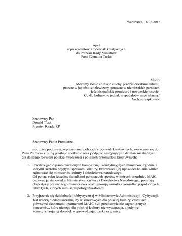 Warszawa, 16.02.2013 Apel reprezentantów środowisk kreatywnych do Prezesa Rady Ministrów Pana Donalda Tuska Motto: „Możemy nosić chińskie ciuchy, jeździć czeskimi autami, patrzeć w japońskie telewizory, gotować w niemieckich garnkach jeść hiszpańskie pomidory i norweskie łososie. Co do kultury, to jednak wypadałoby mieć własną.” Andrzej Sapkowski Szanowny Pan Donald Tusk Premier Rządu RP Szanowny Panie Premierze, my, niżej podpisani, reprezentanci polskich środowisk kreatywnych, zwracamy się do Pana Premiera z pilną prośbą o spotkanie oraz podjęcie następujących działań niezbędnych dla dalszego rozwoju polskiej twórczości i polskich przemysłów kreatywnych: 1. Przestrzeganie jasno określonych kompetencji konstytucyjnych ministrów, zgodnie z którymi szeroko pojętymi sprawami kultury, twórczości i jej upowszechniania winien zajmować się minister ds. kultury i dziedzictwa narodowego. Od ponad roku jesteśmy świadkami gorszących sporów, w których urzędnicy MAiC, dezawuują stanowiska Ministerstwa Kultury i Dziedzictwa Narodowego, pomijają ekspertyzy prawne tego ministerstwa oraz ignorują wnioski z konsultacji społecznych, także tych, których sami są współorganizatorami; 2. Przyjrzenie się działalności lobbystycznej w Ministerstwie Administracji i Cyfryzacji. Jest rzeczą niedopuszczalną, by w kluczowych dla polskiej kultury kwestiach, głównymi ekspertami i partnerami MAiC byli przedstawiciele zagranicznych koncernów, które niczego dla polskiej kultury nie wytwarzają, a jedynie komercjalizują jej dorobek wyprowadzając zyski za granicę. 3. Jasne określenie zasad konsultacji założeń ustaw przygotowywanych przez MAiC. Mamy bowiem do czynienia z ewidentnym łamaniem zasad konsultacji określonych przez Radę Ministrów (ustawa o VOD, UŚUDE, otwarte zasoby publiczne). Nagminnie wprowadza się do ustaw niekorzystne dla kultury i przemysłów kreatywnych przepisy już po zakończeniu konsultacji, w testach regulacyjnych zapisuje się nieprawdę, pomija ustawy niezbędne do znowelizowania przy wprowadzaniu proponowanych zmian, nie przeprowadza rzetelnych estymacji skutków ekonomicznych proponowanego prawa, nieprawdziwie relacjonuje wymogi i zalecenia Unii Europejskiej oraz fałszywie przedstawia sytuacje w innych krajach europejskich. W obecnym brzmieniu projekt ustawy o UŚUDE, który ma być przedstawiony w tym tygodniu na Radzie Ministrów poprzez wprowadzenie już po zamknięciu konsultacji społecznych i rządowych artykułu 12a, uczyniłby z Polski raj dla portali pirackich z całego świata. 4. Wedle danych rządowych polskie przemysły kreatywne dostarczają obecnie 3,5% GDP i dają pracę ok. 5% ogółu zatrudnionych, w tym bardzo wielu młodym, rozpoczynającym swą pracę zawodową. Rozwój przemysłów kreatywnych – jak to pokazują doświadczenia wielu krajów europejskich – łagodzi skutki kryzysu, zwłaszcza wśród osób młodych. Oczekujemy jasnego określenia, w jaki sposób rząd kierowany przez Pana Premiera zamierza rozwijać te przemysły, zapewnić im ochronę i preferencje przynajmniej równe innym przemysłom, tak aby zmierzać w kierunku wyznaczonym przez Wielką Brytanię, w której przemysły kreatywne dostarczają już powyżej 10% GDP. 5. Oczekujemy także jasnego określenia przez Pana Premiera roli środowisk twórczych w Pańskiej wizji naszego wspólnego państwa. We wszystkich dotychczasowych expose kultura była traktowana po macoszemu, a problemy przemysłów kreatywnych w ogóle się nie pojawiały, tymczasem wszystkie wysokorozwinięte kraje europejskie mają swoje modele wspierania przemysłów kreatywnych i chronienia kultury narodowej. Chcielibyśmy wreszcie się dowiedzieć czy Polska zamierza kroczyć drogą wyznaczaną przez model francuski, brytyjski czy niemiecki czy też stworzyć własny. 6. Oczekujemy osobistego zaangażowania Pana Premiera w kwestie otwierania zasobów publicznych. Środowiska twórcze i obywatelskie nie są przeciwne temu procesowi, wręcz odwrotnie – w znanej Panu Premierowi obywatelskiej ustawie medialnej znalazł się kompleksowy i nowoczesny system udostępniania zasobów poprzez Portal Mediów Publicznych. Niestety, rozwiązania proponowane przez MAiC ignorują nie tylko tamten projekt, ale także wyniki warsztatów konsultacyjnych prowadzonych przez kilka miesięcy pod auspicjami MKiDN i MAiC, prawo europejskie, Konstytucję RP, zalecenia Komisji Europejskiej i zasady zdrowego rozsądku. Zmierzają do utworzenia państwowych molochów na wzór RSW Prasa-Książka-Ruch, którego z pożytkiem dla społeczeństwa był Pan likwidatorem. Ośmieszają polskie starania o poszerzanie wolności gospodarczej, proponując by wzory umów o przekazanie praw autorskich określała Rada Ministrów w swoim rozporządzeniu. Wreszcie – jak wynika z testu regulacyjnego – wcale nie zmierzają do darmowego dla użytkowników udostępniania zasobów kultury, a korzyść dla państwa upatrują w pauperyzacji środowisk twórczych. Szanowny Panie Premierze, gdy w czasie II wojny światowej minister obrony Wielkiej Brytanii zaproponował Premierowi Winstonowi Churchillowi ograniczenie wydatków na kulturę, Churchill zapytał go: „A o co wtedy będziemy toczyć tę wojnę?!”. Wszystkie badania miast europejskich i polskich potwierdzają, że kluczowymi elementami atrakcyjności tych miast są dwa czynniki: praca i kultura. Przemysły kreatywne dają pracę i powiększają atrakcyjność zamieszkiwania w danym mieście. Wiedzą o tym władze Londynu, który systematycznie awansuje na liście największych „polskich” miast. Deklarował Pan w expose, że zadaniem Pańskiego rządu jest ściąganie młodych Polaków z powrotem do Polski. Nie da się tego osiągnąć niszcząc krajowe przemysły kreatywne i zachęcając najzdolniejszych twórców do emigracji zarobkowej. Apelujemy o pilne podjęcie rozmów z reprezentantami naszych środowisk, zwłaszcza, że w 