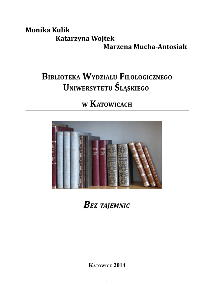 Monika Kulik Katarzyna Wojtek Marzena Mucha-Antosiak BIBLIOTEKA WYDZIAŁU FILOLOGICZNEGO UNIWERSYTETU ŚLĄSKIEGO W KATOWICACH BEZ TAJEMNIC KATOWICE 2014 1 Spis treści Spis treści ..................................................................................................................................2 1. WSTĘP...................................................................................................................................3 2. POZNAJMY SIĘ...................................................................................................................4 2.1. Sieć bibliotek Uniwersytetu Śląskiego..............................................................4 2.2. O bibliotece Wydziału Filologicznego w Katowicach.......................................9 2.3. Nasze agendy....................................................................................................10 2.3.1 Wypożyczalnia Biblioteki Wydziału Filologicznego...........................10 2.3.2 Czytelnia Ogólna..................................................................................12 2.3.3 Czytelnia Czasopism............................................................................17 2.3.4 Czytelnia i Wypożyczalnia Bibliologiczna..........................................21 2.3.5 Lektorium Klasyczne...........................................................................26 2.4. Gdzie nas znajdziesz?......................................................................................29 2.5. Szatnia …........................................................................................................30 3. KORZYSTAJ Z NASZYCH USŁUG.................................................................................31 3.1. Co zrobić, aby skorzystać z usług sieci bibliotek UŚ?....................................31 3.2. Jak mogę zarządzać swoim kontem?...............................................................37 3.3. Zasady korzystania z wypożyczalni …............................................................45 3.4. Co się stanie, gdy nie zdążę zwrócić książki na czas?.....................................47 3.5. Kto i co może wypożyczyć poza bibliotekę?...................................................48 3.6. Czy mogę przedłużyć termin zwrotu wypożyczonej książki?.........................49 3.7. Co się stanie gdy zgubię lub zniszczę książkę?...............................................49 3.8. Jak korzystać z czytelń?...................................................................................50 3.9. Czy i co mogę kserować?................................................................................52 4. ZAMÓW KSIĄŻKĘ LUB CZASOPISMO........................................................................53 4.1. Informacja o katalogach...................................................................................53 4.2. Katalog komputerowy – instrukcja..................................................................57 2 1. WSTĘP Podręcznik „Biblioteka Wydziału Filologicznego Uniwersytetu Śląskiego w Katowicach bez tajemnic” zawiera podstawowe informacje przydatne wszystkim użytkownikom Biblioteki. Pozwala zapoznać się z terminologią stosowaną w katalogach bibliotecznych oraz przybliża procedury biblioteczne (zapisanie się do biblioteki, wyszukiwanie w katalogach, zamawianie książek, korzystanie z czytelń). Ponadto Podręcznik zawiera wskazówki praktyczne o Bibliotece: umiejscowienie poszczególnych agend, godziny ich otwarcia oraz informacje, jak można skontaktować się z pracownikami Biblioteki. W celu ułatwienia korzystania z Podręcznika został on podzielony na rozdziały, natomiast bogaty materiał graficzny umożliwia zrozumienie zawiłości procedur związanych z korzystaniem z Biblioteki. 3 2. Poznajmy się 2.1. SIEĆ BIBLIOTEK UNIWERSYTETU ŚLĄSKIEGO BIBLIOTEKA i instytutowymi UNIWERSYTETU tworzy sieć ŚLĄSKIEGO wraz z bibliotekami biblioteczno-informacyjną wydziałowymi Uniwersytetu Śląskiego w Katowicach. Biblioteki sieci UŚ służą celom naukowym i dydaktycznym studentów oraz pracowników naukowych poprzez gromadzenie zbiorów związanych z wykładanymi przedmiotami, a także materiałów źródłowych tradycyjnych i elektronicznych, zbiorów specjalnych, dokumentów audiowizualnych, mikrofilmów i innych. Informacji o zbiorach wszystkich bibliotek wydziałowych oraz CINiBA szukaj w katalogu komputerowym: http://opac.bg.us.edu.pl/Scripts/cgiip.exe/wo2_search.p? R=1&IDBibl=19&ID1=DMFMOOHGRPGJODGHFSQMK&ln=pl Rys. 1. Katalog komputerowy 4 UWAGA Od 2010 roku działa Uczelniana Biblioteka Wirtualna udostępniająca zdigitalizowane publikacje naukowe oraz podręczniki i skrypty: http://www.bg.us.edu.pl/index.php?option=com_content&view=article&id=1084&Itemid=28 Rys. 2. Biblioteka Cyfrowa UŚ 5 Rys. 3. Biblioteka Cyfrowa UŚ 6 UWAGA Od października 2012 roku dostęp do zbirów Biblioteki Uniwersytetu Śląskiego i Uniwersytetu Ekonomicznego w nowym gmachu CINIBA – Centrum Informacji Naukowej i Biblioteki Akademickiej http://www.ciniba.edu.pl/ CINIBA – CENTRUM INFORMACJI NAUKOWEJ I BIBLIOTEKA AKADEMICKA 1 CENTRUM INFORMACJI NAUKOWEJ I BIBLIOTEKA AKADEMICKA to wspólny projekt Uniwersytetu Śląskiego i Uniwersytetu Ekonomicznego w Katowicach, którego głównym celem jest współudział w procesie budowy nowoczesnej gospodarki regionalnej poprzez wykorzystanie aktywności oraz potencjału intelektualnego środowisk naukowych. CINiBA to tzw. biblioteka hybrydowa, co oznacza, że dzięki nowoczesnym narzędziom równolegle udostępniane są wszystkie typy dokumentów, niezależnie od nośnika na jakim się znajdują: książki, czasopisma, bazy danych, teksty elektroniczne, materiały 1 Żródło: http://www.ciniba.us.edu.pl/images/stories/galeriaprzewodnik/c02.jpg (data dostępu: 10.09.2013) 7 audiowizualne, multimedialne oraz zbiory dostosowane do specjalnych grup użytkownik