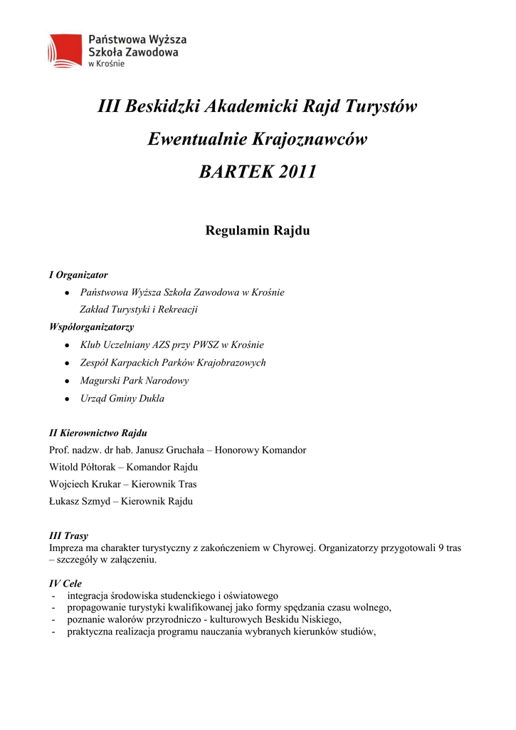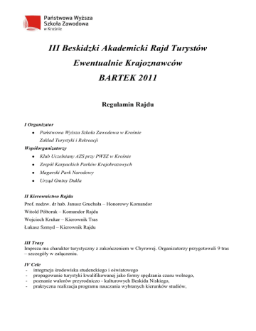 III Beskidzki Akademicki Rajd Turystów Ewentualnie Krajoznawców BARTEK 2011 Regulamin Rajdu I Organizator Państwowa Wyższa Szkoła Zawodowa w Krośnie Zakład Turystyki i Rekreacji Współorganizatorzy Klub Uczelniany AZS przy PWSZ w Krośnie Zespół Karpackich Parków Krajobrazowych Magurski Park Narodowy Urząd Gminy Dukla II Kierownictwo Rajdu Prof. nadzw. dr hab. Janusz Gruchała – Honorowy Komandor Witold Półtorak – Komandor Rajdu Wojciech Krukar – Kierownik Tras Łukasz Szmyd – Kierownik Rajdu III Trasy Impreza ma charakter turystyczny z zakończeniem w Chyrowej. Organizatorzy przygotowali 9 tras – szczegóły w załączeniu. IV Cele - integracja środowiska studenckiego i oświatowego - propagowanie turystyki kwalifikowanej jako formy spędzania czasu wolnego, - poznanie walorów przyrodniczo - kulturowych Beskidu Niskiego, - praktyczna realizacja programu nauczania wybranych kierunków studiów, V . Termin 27 – 28 maja 2011 r. VI Uczestnicy Rajd przewidziany jest dla studentów PWSZ, pracowników uczelni, absolwentów, uczniów szkół ponadgimnazjalnych, pracowników zakładów pracy oraz osób zainteresowanych górskimi wędrówkami. VII Zgłoszenia Zgłoszenia przyjmowane są do dnia 16 maja 2011 roku na drukach zgłoszeniowych opracowanych przez organizatora i dostarczone przez Opiekuna do Pani Lucyny Pojnar pok. nr 108 (sekretariat Kanclerza PWSZ, Krosno Rynek 1), tel. 0-13 43 755 25. Dodatkowych informacji udziela Pan Jacek Wnuk pod numerem telefonu 0-13 43 755 16. VIII Obowiązki uczestników - dobry humor i kondycja, - przygotowanie do trudów wędrówki, - wygodny strój turystyczny, - własny śpiwór i karimata, obuwie zastępcze (dla tras kilkudniowych), - nocleg w warunkach turystycznych, - wpłata 20 zł. do dnia 16 maja 2011 r. (w kasie uczelni pok. nr 103, Rynek 1), - opłata za nocleg na trasach kilkudniowych, - zachowanie zgodne z kartą turysty. Uwaga: Szczegółowe informacje dotyczące miejsca i godziny wyjazdu oraz miejsca noclegu przekazane zostaną uczestnikom po zakończeniu zapisów na wybrane trasy. IX Organizator zapewnia obsługę przewodnicką na trasach, pamiątkową plakietkę, ciepły posiłek w trakcie zakończenia imprezy, nagrody za udział w konkursie: Wiedzy o Beskidzie Niskim, konkurs sprawnościowy oraz najbardziej oryginalnego znaleziska na trasie – z wyłączeniem istot żywych i roślin chronionych, dojazd do tras, transport z Chyrowej do Krosna, słońce, deszcz i błoto. X Zakończenie imprezy W dniu 28 maja 2011 r. o godzinie 14.00 oczekujemy na uczestników Rajdu w Gospodarstwie Agroturystycznym Pod Chyrową. Podczas zakończenia zapewniamy gorący posiłek, dobrą zabawę, konkursy z nagrodami. Życzymy wielu wrażeń i przyjemności