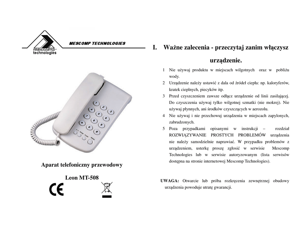 I. Ważne zalecenia - przeczytaj zanim włączysz urządzenie. 1 Nie używaj produktu w miejscach wilgotnych wody. oraz w pobliżu 2 Aparat telefoniczny przewodowy Leon MT-508 Urządzenie należy ustawić z dala od źródeł ciepła: np. kaloryferów, kratek cieplnych, piecyków itp. 3 Przed czyszczeniem zawsze odłącz urządzenie od linii zasilającej. Do czyszczenia używaj tylko wilgotnej szmatki (nie mokrej). Nie używaj płynnych, ani środków czyszczących w aerozolu. 4 Nie używaj i nie przechowuj urządzenia w miejscach zapylonych, zabrudzonych. 5 Poza przypadkami opisanymi w instrukcji – rozdział ROZWIĄZYWANIE PROSTYCH PROBLEMÓW urządzenia nie należy samodzielnie naprawiać. W przypadku problemów z urządzeniem, usterkę proszę zgłosić w serwisie Mescomp Technologies lub w serwisie autoryzowanym (lista serwisów dostępna na stronie internetowej Mescomp Technologies). UWAGA: Otwarcie lub próba rozkręcenia zewnętrznej obudowy urządzenia powoduje utratę gwarancji. II. Właściwości • • Możliwość zawieszenia na ścianie Regulacja głośności dzwonka • • • • Możliwość wyłączenia dzwonka Przełącznik Pulse/Tone Redial Flash UWAGA: Jeżeli linia telefoniczna jest linią napowietrzną wskazane jest zainstalowanie układu zabezpieczającego aparat przed przepięciami i przeciążeniami. • Pauza Gwarancja nie obejmuje uszkodzeń wynikłych np. z wyładowań atmosferycznych. III. Instalacja: 1. Połączyć przewodem słuchawkowym (skręconym) słuchawkę (gniazdo w dolnej części słuchawki) - z aparatem (gniazdo od spodu aparatu). Sprawdzić, czy wtyki zatrzasnęły się na gniazdach. 2. Przewód liniowy aparatu włożyć w gniazdo umieszczone w górnej ściance aparatu, a drugi koniec zakończony właściwą wtyczką do gniazda telefonicznego. 3. Podnieść słuchawkę i sprawdzić, czy jest słyszalny sygnał zgłoszenia centrali. Przy wybieraniu trybu wybierania DTMF wybrać dowolną cyfrę. Jeżeli sygnał centrali nie zniknie, należy wybrać tryb PULSE i powtórzyć próbę. IV. Funkcje przycisków i przełączników: FLASH - przycisk do generowania przerwy w linii (tzw. przerwa kalibrowana). Przycisk do przełączania rozmowy na inny telefon (w przypadku wewnętrznych centrali telefonicznych) VI. Nawiązywanie połączeń REDIAL- przycisk służący do ponownego wybierania ostatnio wybieranego numeru: Podnieś słuchawkę, następnie sprawdź sygnał zgłoszenia się centrali. Za pomocą klawiatury wybierz żądany numer. Po podniesieniu słuchawki i usłyszeniu sygnału zgłoszenia centrali, nacisnąć przycisk REDIAL, ostatnio wybrany numer zostanie ponownie wybrany. Jeżeli połączenie nie zostało zrealizowane należy: odłożyć słuchawkę, VII. Rozwiązywanie prostych problemów podnieść ją, ponownie wcisnąć przycisk REDIAL. PAUZA- przycisk służący do programowania(zapamiętywania przez aparat odstępu między wybieranymi cyframi numeru abonenta. Przycisk jest stosowany, gdy wybieramy numer zamiejscowy i przewidujemy używanie przycisku REDIAL. Przełącznik TONE/PULSE - przełącznik określający sposób wybierania numerów abonentów. P (pulse) - wybieranie dekadowe. T(tone) - wybieranie częstotliwościowe (DTMF), stosowane przy współpracy z centralami elektronicznymi oraz przy zdalnym dostępie do np. automatycznej sekretarki. V. Odbieranie połączeń przychodzących Gdy dzwoni telefon, oznacza, że masz nową rozmowę. Aby odebrać podnieś słuchawkę. Aby zakończyć połączenie odłóż słuchawkę. Brak sygnału. Sprawdź czy słuchawka jest prawidłowo podłączona do telefonu, lub czy linia telefoniczna nie jest uszkodzona. Zakłócenia Sprawdź, czy wtyczka nie jest uszkodzona. Sprawdź, czy gniazdo nie jest wilgotne lub zardzewiałe. Symbol CE oznacza, że niniejszy produkt spełnia europejskie wymagania w zakresie bezpieczeństwa, ochrony zdrowia, środowiska i konsumenta. Oznacza, że produkt został poddany odpowiedniej procedurze oceny zgodności i spełnia zasadnicze wymagania dyrektyw podanych w deklaracji zgodności Przedstawiony symbol (przekreślony wizerunek kosza na kółkach zgodnie z dyrektywą WEEE ) wskazuje na zalecenia obowiązujące w Unii Europejskiej dotyczące oddzielnego zbierania odpadów elektrycznych i sprzętu elektronicznego. Prosimy nie wrzucać niniejszego sprzętu do kosza razem z odpadami domowymi. Pozbywając się tego urządzenia skontaktuj się z lokalnymi władzami, służbami likwidacji odpadów, sklepem gdzie dokonano zakupu sprzętu lub z nasza firmą. Oddzielna zbiórka i prawidłowy odzysk zużytego sprzętu elektrycznego i elektronicznego podczas likwidacji pozwoli nam przyczynić się do oszczędzania zasobów naturalnych. Masa urządzenia: 0,40kg Lp. Data zgłoszeni a Data wydania Wykonane czynności Wymienione części Potwierdzenie Zakładu Serwisowego Kupon A karty gwarancyjnej MT-508 Data naprawy Kupon B karty gwarancyjnej MT-508 Data naprawy Kupon C karty gwarancyjnej MT-508 Data naprawy ............................................................. Rodzaj naprawy ............................................................. ............................................................. ............................................................. ............................................................. Zakład serwisowy ............................................................. Rodzaj naprawy ............................................................. ............................................................. ............................................................. ............................................................. Zakład serwisowy ............................................................. Rodzaj naprawy ............................................................. ............................................................. ............................................................. .......................................