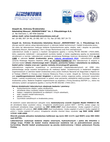 Zespół ds. Ochrony Środowiska Gdańskiej Stoczni „REMONTOWA” im. J. Piłsudskiego S.A. ul. Na Ostrowiu 1, 80-958 Gdańsk adres mail: [email protected] tel. (0-58) 307 24 46, (0-58) 307 11 72; fax (0-58) 307 24 73 Zespół ds. Ochrony Środowiska Gdańskiej Stoczni „REMONTOWA” im. J. Piłsudskiego S.A. oferuje szeroki zakres usług laboratoryjnych w zakresie badań technicznych i badań środowiska pracy. Od wielu lat laboratorium realizuje badania fizykochemiczne paliw, olejów, stali i stopów na potrzeby Gdańskiej Stoczni „Remontowej”, firm z Grupy Remontowa oraz firm zewnętrznych. Laboratorium działa w oparciu o System Zarządzania zgodny z normą PN-EN ISO/IEC 17025:2005, który zapewnia rzetelność i wiarygodność wyników badań, a także współpracę opartą na standardzie określonym w normie. Laboratorium uzyskało akredytację Polskiego Centrum Akredytacji (PCA) nr AB 1285 w zakresie badań środowiska pracy (zakres akredytacji PCA). Laboratorium posiada uznanie Polskiego Rejestru Statków (PRS) nr TT/676/710405/14 jako laboratorium II stopnia w zakresie badań składu chemicznego stali i stopów, pomiarów hałasu i oświetlenia na statkach, badań paliw i olejów oraz par i gazów metodą chromatografii gazowej. Laboratorium regularnie uczestniczy w porównaniach międzylaboratoryjnych od 1998 roku potwierdzając swoje wysokie kompetencje do realizacji badań. Uczestniczymy w badaniach biegłości organizowanych w zakresie badań środowiska pracy przez Instituto Nacional de Seguridad e Higiene en el Trabajo (INSHT) w Viscaya oraz Instytut Medycyny Pracy w Łodzi. Zespół ds. Ochrony Środowiska jest współorganizatorem badań biegłości w zakresie analizy wagowej pyłów, oznaczeń zawartości metali i wolnej krystalicznej krzemionki w pyłach oraz pomiarów oświetlenia elektrycznego i hałasu w środowisku pracy. Badania biegłości organizowane są wspólnie z Firmą Doradczą ISOTOP s.c., która ma wdrożony system zarządzania zgodny z normą PN-EN ISO/IEC 17043:2011. Zakres działalności laboratorium obejmuje badania i pomiary: ● fizykochemiczne olejów i paliw okrętowych, ● określanie klasy czystości olejów hydraulicznych, ● hałasu i natężenia oświetlenia na statkach i innych obiektach, ● stali i stopów metali kolorowych, ● jakości ścierniw, ● czynników szkodliwych w środowisku pracy. W ostatnim czasie laboratorium zakupiło nowy Automatyczny Licznik Cząstek Model PAMAS-S 40, do określania klasy czystości cieczy. Urządzenie skalibrowano pyłami NIST i ACFTD, wobec czego ma możliwość określania klasy czystości wg ISO 4406:1987 (kod dwuliczbowy: liczba cząstek>5 μm(c)/ liczba cząstek>15 μm(c)), ISO 4406:1999 (kod trzyliczbowy: liczba cząstek>4 μm(c)/ liczba cząstek>6 μm(c) / liczba cząstek>14 μm(c). Urządzenie określa również klasy czystości wg NAS 1638, GOST 17216 i GJB 420A. Miernik posiada aktualne świadectwa kalibracji wg norm ISO 11171 (pył NIST) oraz ISO 4402 (pył ACFTD). Laboratorium wykonuje badania olejów smarnych, hydraulicznych i paliw dla klientów z całego kraju. Próbki do badań można dostarczać osobiście lub za pośrednictwem poczty kurierskiej. Wyniki badań przekazywane są pocztą elektroniczną i listem poleconym Pocztą Polską. Laboratorium oferuje szeroki zakres badań w atrakcyjnych cenach! Badane obiekty Badane cechy i metody badawcze/pomiarowe Normy i/lub procedury badawcze Pobierania próbek powietrza na stanowiskach pracy w celu oceny narażenia na pyły przemysłowe i metale. Metoda dozymetrii indywidualnej. PN-Z-04008-7:2002, PN-Z-04008-7:2002/Az1:2004, PN-EN 689:2002, Środowisko pracy - powietrze Stężenie pyłu całkowitego i respirabilnego. Metoda filtracyjno – wagowa. Stężenie manganu i żelaza. Metoda spektrofotometryczna. PN-91-Z-04030.05 i PN-91-Z04030.06 ZS/PB-01 ed.1 z 15.02.2008 Środowisko pracy Zawartość wolnej krystalicznej krzemionki. Metoda - pył spektrofotometryczna. PN-91/Z-04018.04 Równoważny poziom dźwięku A Maksymalny poziom dźwięku A Szczytowy poziom dźwięku C Środowisko pracy Metoda pomiarowa bezpośrednia -hałas Poziom ciśnienia akustycznego w pasmach częstotliwościowych oktawowych Poziom ekspozycji na hałas odniesiony do 8-godzinnego wymiaru pracy, tygodnia pracy. PN-N-01307:1994, PN-EN ISO 9612:2011 Środowisko pracy Pomiary natężenia oświetlenia -oświetlenie PN-EN 12464-1:2012 Klasa czystości olejów Oznaczanie klasy czystości olejów hydraulicznych ISO 4406 Właściwości fizyczne olejów i paliw okrętowych Zawartość: wody, zanieczyszczeń stałych nierozpuszczalnych w toluenie, lepkości kinematyczna (w 40, 50, 100 °C), gęstość (w 15, 20 °C), temperatura zapłonu QI-8.2.07.03 Instrukcja badań określających własności fizyczne olejów i paliw okrętowych Skład chemiczny stali i żeliwa Zawartość: węgla, manganu, fosforu, krzemu, niklu, molibdenu QI-8.2.07.01 Instrukcja badań składu chemicznego stali i żeliwa Skład chemiczny brązów i mosiądzów Zawartość: miedzi, żelaza, ołowiu, cynku, fosforu, niklu, cyny, manganu, glinu QI-4.10.06.02 Instrukcja badań składu chemiczny brązów i mosiądzów Natężenie oświetlenia elektrycznego na statkach Pomiary natężenia oświetlenia QI-4.10.06.04 Instrukcja pomiarów natężenia oświetlenia elektrycznego na statkach Równoważny poziomu dźwięku A Maksymalny poziom dźwięku A Hałas na statkach Szczytowy poziom dźwięku C Poziom ciśnienia akustycznego w pasmach częstotliwościowych oktawowych 63 Hz − 8 kHz Ścierniwo skład frakcyjny, gęstość pozorna, twardość w skali Mohsa, zawartość: wilgoci, rozpuszczalnych w wodzie substancji, chlorków QI-4.10.06.05 Instrukcja pomiarów hałasu na statkach QI-8.2.07.09 Instrukcja badania ścierniw