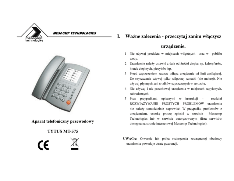 I. Ważne zalecenia - przeczytaj zanim włączysz urządzenie. 1 Nie używaj produktu w miejscach wilgotnych wody. oraz w pobliżu 2 Aparat telefoniczny przewodowy Urządzenie należy ustawić z dala od źródeł ciepła: np. kaloryferów, kratek cieplnych, piecyków itp. 3 Przed czyszczeniem zawsze odłącz urządzenie od linii zasilającej. Do czyszczenia używaj tylko wilgotnej szmatki (nie mokrej). Nie używaj płynnych, ani środków czyszczących w aerozolu. 4 Nie używaj i nie przechowuj urządzenia w miejscach zapylonych, zabrudzonych. 5 Poza przypadkami opisanymi w instrukcji – rozdział ROZWIĄZYWANIE PROSTYCH PROBLEMÓW urządzenia nie należy samodzielnie naprawiać. W przypadku problemów z urządzeniem, usterkę proszę zgłosić w serwisie Mescomp Technologies lub w serwisie autoryzowanym (lista serwisów dostępna na stronie internetowej Mescomp Technologies). TYTUS MT-575 UWAGA: Otwarcie lub próba rozkręcenia zewnętrznej obudowy urządzenia powoduje utratę gwarancji. II. Właściwości • 10 przycisków pamięci bezpośredniej • Speaker phone- tryb głośno mówiący • Redial • Flash • Pause • Pulse/Tone • Możliwość zawieszenia na ścianie III. Instalacja: UWAGA: Jeżeli linia telefoniczna jest linią napowietrzną wskazane jest zainstalowanie układu zabezpieczającego aparat przed przepięciami i przetężeniami. Gwarancja nie obejmuje uszkodzeń wynikłych np. z wyładowań atmosferycznych. 1. Połączyć przewodem słuchawkowym (skręconym) słuchawkę (gniazdo w dolnej części słuchawki) - z aparatem (gniazdo od spodu aparatu). Sprawdzić, czy wtyki zatrzasnęły się na gniazdach. 2. Przewód liniowy aparatu włożyć w gniazdo umieszczone w górnej ściance aparatu, a drugi koniec zakończony właściwą wtyczką do gniazda telefonicznego. 3. Podnieść słuchawkę i sprawdzić, czy jest słyszalny sygnał zgłoszenia centrali. Przy wybieraniu trybu wybierania DTMF wybrać dowolną cyfrę. Jeżeli sygnał centrali nie zniknie, należy wybrać tryb PULSE i powtórzyć próbę. IV. Opis urządzenia VI. Nawiązywanie połączeń 1. 2. Podnieś słuchawkę, następnie sprawdź sygnał zgłoszenia się centrali. Za pomocą klawiatury wybierz żądany numer lub naciśnij przycisk pamięci bezpośredniej. Gdy chcesz rozmawiać w trybie głośno mówiącym naciśnij przycisk SPK. VII. Pamięć bezpośrednia 1. 2. 3. 4. Aby zapisać numer w pamięci bezpośredniej: Podnieś słuchawkę. Naciśnij przycisk ZAPIS, następnie wprowadź numer. Naciśnij przycisk ZAPIS, a następnie klawisz pamięci bezpośredniej pod którym chcesz zapisać numer (M1~M 10.) Po operacji zapisywania, odłóż słuchawkę. Aby połączyć się z numerem zapisanym w pamięci bezpośredniej: • Podnieś słuchawkę, a następnie naciśnij przycisk pamięci pod którym zapisany jest żądany numer Lub V. Odbieranie połączeń przychodzących Gdy dzwoni telefon, oznacza, że masz nową rozmowę. Aby odebrać podnieś słuchawkę, lub jeżeli chcesz rozmawiać w trybie głośno mówiącym naciśnij przycisk SPK. Aby zakończyć połączenie naciśnij ponownie przycisk SPK • Przyciśnij klawisz SPK, a następnie naciśnij przycisk pamięci pod którym zapisany jest żądany numer VIII. Funkcje przycisków i przełączników: Przełącznik TONE/PULSE - przełącznik określający sposób wybierania numerów abonentów. P (pulse) - wybieranie dekadowe. T(tone) - wybieranie częstotliwościowe (DTMF), stosowane przy współpracy z centralami elektronicznymi oraz przy zdalnym dostępie do np. automatycznej sekretarki. ZAPIS-przycisk służy do zapisywania numeru w Pamięci bezpośredniej. ODDZWOŃ- służy do łączenia się z numerem z pamięci bezpośredniej. Dioda „W UŻYCIU”- wskazuje, że urządzenie jest w trybie użycia, np rozmowa telefoniczna. PAUZA - przycisk służący do programowania (zapamiętywania przez aparat dostępu między wybieranymi cyframi numeru abonenta). Przycisk jest stosowany, gdy wybieramy numer zamiejscowy i przewidujemy używanie przycisku REDIAL. FLASH - przyciski do generowania przerwy w linii ( tzw. przerwa kalibrowana). Przycisk do przełączania rozmowy na inny telefon (w przypadku wewnętrznych centrali telefonicznych) REDIAL- przycisk służący do ponownego wybierania ostatnio wybieranego numeru: Po podniesieniu słuchawki i usłyszeniu sygnału zgłoszenia centrali, nacisnąć przycisk REDIAL, ostatnio wybrany numer zostanie ponownie wybrany. UWAGA: Jeżeli chcemy użyć funkcję REDIAL przy połączeniu międzymiastowym należy: Wybrać cyfrę „0”przycisnąć przycisk PAUZA, a następnie wybrać numer kierunkowy abonenta. Po przyciśnięciu przycisku REDIAL telefon wybierze cyfrę „0”, poczekaj na zgłoszenie centrali, a następnie wybierze kolejne cyfry. Jeżeli połączenie nie zostało zrealizowane należy: odłożyć słuchawkę, podnieść ją, ponownie wcisnąć przycisk REDIAL. SPK- speaker phone. Funkcja ta umożliwia rozmowę w trybie głośno mówiącym bez konieczności podnoszenia słuchawki. IX. ROZWIĄZYWANIE PROSTYCH PROBLEMÓW Brak sygnału. Sprawdź czy słuchawka jest prawidłowo podłączona do telefonu, lub czy linia telefoniczna nie jest uszkodzona. Zakłócenia Sprawdź, czy wtyczka nie jest uszkodzona. Sprawdź, czy gniazdo nie jest wilgotne lub zardzewiałe. Nie można połączyć się z numerem z pamięci bezpośredniej Sprawdź, czy został prawidłowo wpisany numer do pamięci bezpośredniej Symbol CE oznacza, że niniejszy produkt spełnia europejskie wymagania w zakresie bezpieczeństwa, ochrony zdrowia, środowiska i konsumenta. Oznacza, że produkt został poddany odpowiedniej procedurze oceny zgodności i spełnia zasadnicze wymagania dyrektyw podanych w deklaracji zgodności Przedstawiony symbol (przekreślony wizerunek kosza na kółkach zgodnie z dyrektywą WEEE ) wskazuje na zalecenia obowiązujące w Unii Europejskiej dotyczące oddzielnego zbierania odpadów elektrycznych i sprzętu elektr