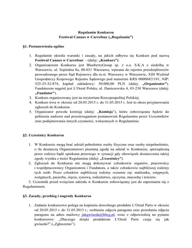 Regulamin Konkursu Festiwal Cannes w Carrefour („Regulamin”) §1. Postanowienia ogólne 1. Regulamin określa warunki i zasady, na jakich odbywa się Konkurs pod nazwą Festiwal Cannes w Carrefour - (dalej: „Konkurs”). 2. Organizatorem Konkursu jest BlueberryGroup sp. z o.o. S.K.A z siedzibą w Warszawie, ul. Szpitalna 8a, 00-031 Warszawa, wpisana do rejestru przedsiębiorców prowadzonego przez Sąd Rejonowy dla m.st. Warszawy w Warszawie, XIII Wydział Gospodarczy Krajowego Rejestru Sądowego pod numerem KRS 00000421191, NIP: 525-25-32-874, kapitał zakładowy: 50.000,00 PLN (dalej: „Organizator”). Fundatorem nagród jest L’Oreal Polska, ul. Daniszewska 4, 03-230 Warszawa (dalej: „Fundator”). 3. Konkurs organizowany jest na terytorium Rzeczpospolitej Polskiej. 4. Konkurs trwa w okresie od 20.05.2015 r. do 31.05.2015 r. Jest to okres przyjmowania zgłoszeń do Konkursu. 5. Organizator powoła komisję (dalej: „Komisja”), która zobowiązana będzie do pełnienia nadzoru nad przestrzeganiem postanowień Regulaminu przez Uczestników oraz podejmowania innych czynności, wskazanych w Regulaminie. §2. Uczestnicy Konkursu 1. W Konkursie mogą brać udział pełnoletnie osoby fizyczne oraz osoby niepełnoletnie, o ile dostarczą Organizatorowi pisemną zgodę na udział w Konkursie, sporządzoną przez rodzica bądź opiekuna prawnego w sytuacji gdy obowiązek dostarczenia takiej zgody wynika z treści Regulaminu (dalej: „Uczestnicy”). 2. Zgłoszeń do Konkursu nie mogą dokonywać członkowie organów, pracownicy i współpracownicy Organizatora i Fundatora, a także członkowie najbliższej rodziny tych osób. Przez członków najbliższej rodziny rozumie się: małżonka, zstępnych, wstępnych, pasierba, zięcia, synową, rodzeństwo, ojczyma, macochę i teściów. 3. Uczestnik przed wzięciem udziału w Konkursie zobowiązany jest do zapoznania się z Regulaminem. §3. Zasady, przebieg i nagrody Konkursu 1. Zadanie konkursowe polega na kupieniu dowolnego produktu L’Oreal Paris w okresie od 20.05.2015 r. do 31.05.2015 r., zrobieniu zdjęcia paragonu oraz przesłaniu zdjęcia paragonu na adres mailowy [email protected], wraz z odpowiedzią na pytanie konkursowe: „Dlaczego dzięki produktom L’Oreal Paris czuję się jak gwiazda?”.(„Zgłoszenie”). 2. Warunkiem wzięcia udziału w „Konkursie” jest prawidłowe wykonanie Zadania konkursowego oraz: a. W przypadku osób niepełnoletnich warunkiem udziału jest dostarczenie Organizatorowi pisemnej zgody na udział w Konkursie, sporządzonej przez rodzica bądź opiekuna prawnego; b. Prawidłowe dokonanie przez Uczestnika czynności, o których mowa powyżej jest równoznaczne z wyrażeniem oświadczeń, o których mowa w Regulaminie; c. W momencie przystąpienia do Konkursu, Uczestnik jest zobowiązany do przesłania na adres poczty elektronicznej [email protected] oświadczenia o zaakceptowaniu Regulaminu oraz zgody na przetwarzanie i w przypadku wygranej na publikację danych osobowych (w przypadku osób niepełnoletnich zgody przedstawiciela ustawowego) i oświadczenia o zapoznaniu się z klauzulą obowiązku informacyjnego, w zakresie oraz zgodnie z §5 pkt 4 i 5 Regulaminu. 3. Każdy Uczestnik może przesłać dowolną liczbę Zadań konkursowych; 4. W każdym dniu konkursowym Komisja wyłoni 10 (słownie: dziesięciu) zwycięzców (dalej: „Zwycięzca”), na postawie najwyżej ocenionych zadań pod względem pomysłowości i oryginalności przez Komisję. Jeden dzień konkursowy trwa od godz. 0:00 do godz. 23:59 przez okres trwania Konkursu. 5. Organizator poinformuje Zwycięzców o wygranej mailowo, na adres email, z którego zostało wysłane zadanie konkursowe, w ciągu 7 dni roboczych od dnia zakończenia Konkursu. 6. Warunkiem otrzymania nagrody jest przesłanie w ciągu 24 godzin od otrzymania informacji o wygranej na adres mailowy [email protected] następujących danych: imię, nazwisko, adres korespondencyjny, numer telefonu. 7. Organizator prześle Zwycięzcy nagrodę rzeczową za pośrednictwem kuriera lub Poczty Polskiej korzystając z danych wskazanych w mailu w terminie 30 dni od zakończenia Konkursu; 8. Nagrodami w konkursie jest zestaw kosmetyków: mascara VML o wartości 33,99 zł wraz z nagrodą pieniężną w wysokości 4,00 zł i szminka Color Riche o wartości 41,99 zł wraz z nagrodą pieniężną w wysokości 5,00 zł. Łączna wartość nagrody wynosi 84,98 zł. Kwota 9,00 zł stanowi równowartość zryczałtowanego podatku dochodowego od osób fizycznych o wartości otrzymanej nagrody i zostanie potrącona przed wydaniem nagrody, zgodnie z ustawą z dnia 26 lipca 1991 roku o podatku dochodowym od osób fizycznych (j.t. Dz.U. z 2012r., poz.361). 9. Zgłoszenia naruszające którekolwiek z postanowień niniejszego Regulaminu bądź co do których nie zostały uzyskane zgody rodziców/opiekunów prawnych (w przypadku osób niepełnoletnich) są nieważne i będą wykluczane z Konkursu przez Organizatora. §4.Prawa autorskie 1. Uczestnicy Konkursu poprzez udział w niej oświadczają, że odpowiedzi na zadanie konkursowe (dalej: Utwór, Zgłoszenie) są wolne od wad prawnych, a korzystanie z nich nie naruszy (lub nie zagrozi naruszeniem) praw osób trzecich. W razie gdyby powyższe oświadczenie okazało się nieprawdziwe, w przypadku zgłoszenia roszczeń osób uprawnionych autorsko lub z tytułu praw pokrewnych, lub innych osób dochodzących swoich praw z tytułu wykorzystania tekstów przez Organizatora, Uczestnik Konkursu zwalnia lub zwolni Organizatora z odpowiedzialności prawnej i zobowiązuje się do zaspokojenia słusznych roszczeń tych osób. 2. Uczestnik udziela nieodpłatnie oraz bez ograniczeń czasowych, terytorialnych i ilościowych Organizatorowi oraz Fundatorowi licencji niewyłącznej na korzystanie ze Zgłoszenia. Licencja obejmuje w szczególności upoważnienie do korzystania ze Zgłoszenia we wszystkich formach reklamy i marketingu, w tym także za po