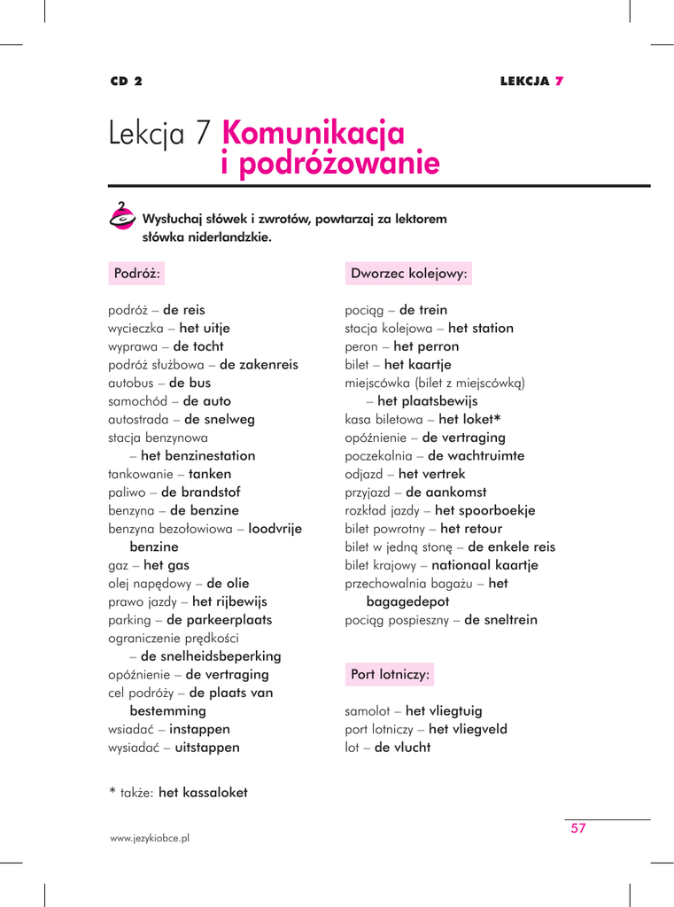 CD 2 LEKCJA 7 Lekcja 7 Komunikacja i podróżowanie 2 Wysłuchaj słówek i zwrotów, powtarzaj za lektorem słówka niderlandzkie. Podróż: podróż – de reis wycieczka – het uitje wyprawa – de tocht podróż służbowa – de zakenreis autobus – de bus samochód – de auto autostrada – de snelweg stacja benzynowa – het benzinestation tankowanie – tanken paliwo – de brandstof benzyna – de benzine benzyna bezołowiowa – loodvrije benzine gaz – het gas olej napędowy – de olie prawo jazdy – het rijbewijs parking – de parkeerplaats ograniczenie prędkości – de snelheidsbeperking opóźnienie – de vertraging cel podróży – de plaats van bestemming wsiadać – instappen wysiadać – uitstappen Dworzec kolejowy: pociąg – de trein stacja kolejowa – het station peron – het perron bilet – het kaartje miejscówka (bilet z miejscówką) – het plaatsbewijs kasa biletowa – het loket* opóźnienie – de vertraging poczekalnia – de wachtruimte odjazd – het vertrek przyjazd – de aankomst rozkład jazdy – het spoorboekje bilet powrotny – het retour bilet w jedną stonę – de enkele reis bilet krajowy – nationaal kaartje przechowalnia bagażu – het bagagedepot pociąg pospieszny – de sneltrein Port lotniczy: samolot – het vliegtuig port lotniczy – het vliegveld lot – de vlucht * także: het kassaloket www.jezykiobce.pl 57 NIDERLANDZKI KURS PODSTAWOWY odlot – het vertrek przylot – de aankomst zarezerwować lot – een vlucht boeken stanowisko odpraw – check-in punt odprawa celna – check-in* pierwsza klasa – eerste klasse lub business class druga klasa / klasa turystyczna – economy class miejsce przy oknie – de plaats bij het raam miejsce od strony korytarza – de plaats aan het gangpad pasażer – de passagier bagaż – de bagage paszport – het paspoort wiza – het visum granica – de grens nadbagaż – teveel bagage cło – de tol celnik – de douanier strefa wolnocłowa – de taxfree zone lub de tolvrije zone sklep wolnocłowy – de taxfree winkel lub de tolvrije winkel zapinać pasy – riemen vastmaken * także: de douanecontrole 58 bramka na lotnisku – het poortje op het vliegveld terminal – de terminal Hotel: hotel – het hotel rezerwacja – de reservatie pokój – de kamer recepcja – de receptie obsługa hotelowa – de hotelservice schronisko młodzieżowe – de jeugdherberg nocleg ze śniadaniem (w hotelu) – de overnachting met ontbijt lub logies en ontbijt wolne pokoje – vrije kamers zarezerwować pokój w hotelu – een kamer in een hotel reserveren łazienka – de badkamer prysznic – de douche klucz – de sleutel pokój dwuosobowy – de tweepersoonskamer pokojówka – het kamermeisje zameldować się – zich melden