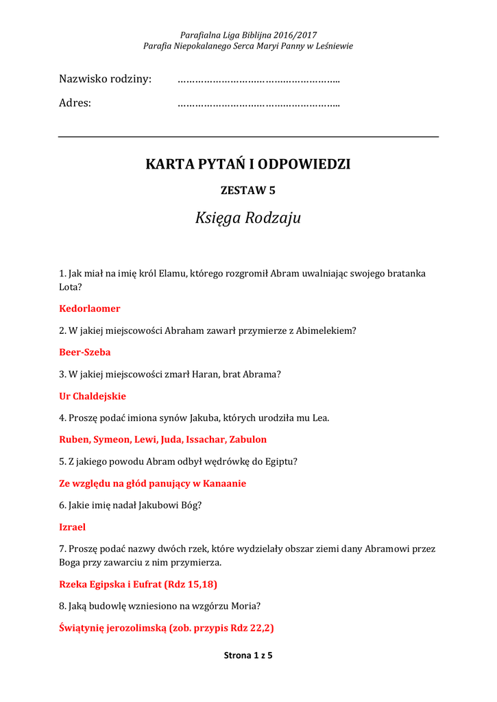 Parafialna Liga Biblijna 2016/2017 Parafia Niepokalanego Serca Maryi Panny w Leśniewie Nazwisko rodziny: ……………………………………………….. Adres: ……………………………………………….. KARTA PYTAŃ I ODPOWIEDZI ZESTAW 5 Księga Rodzaju 1. Jak miał na imię król Elamu, którego rozgromił Abram uwalniając swojego bratanka Lota? Kedorlaomer 2. W jakiej miejscowości Abraham zawarł przymierze z Abimelekiem? Beer-Szeba 3. W jakiej miejscowości zmarł Haran, brat Abrama? Ur Chaldejskie 4. Proszę podać imiona synów Jakuba, których urodziła mu Lea. Ruben, Symeon, Lewi, Juda, Issachar, Zabulon 5. Z jakiego powodu Abram odbył wędrówkę do Egiptu? Ze względu na głód panujący w Kanaanie 6. Jakie imię nadał Jakubowi Bóg? Izrael 7. Proszę podać nazwy dwóch rzek, które wydzielały obszar ziemi dany Abramowi przez Boga przy zawarciu z nim przymierza. Rzeka Egipska i Eufrat (Rdz 15,18) 8. Jaką budowlę wzniesiono na wzgórzu Moria? Świątynię jerozolimską (zob. przypis Rdz 22,2) Strona 1 z 5 Parafialna Liga Biblijna 2016/2017 Parafia Niepokalanego Serca Maryi Panny w Leśniewie 9. Do jakiego kraju został sprzedany przez swoich braci Józef? Do Egiptu 10. Proszę podać imię syna Abrama zrodzonego z niewolnicy Hagar. Izmael 11. Ile dni trwało balsamowanie ciała Izraela? Czterdzieści dni 12. Proszę podać grecki odpowiednik hebrajskiego słowa „toledot”. genesis 13. Proszę podać imię pierwszego syna Jakuba i Racheli. Józef 14. Za jaką wartość Abraham kupił miejsce, w którym pochował swoją żonę Sarę? 400 syklów srebra 15. Co zerwała Ewa w rajskim ogrodzie? owoc 16. Co miało pozostawać znakiem przymierza zawartego przez Boga z Abramem? obrzezanie 17. Przez ile dni mieszkańcy Egiptu opłakiwali śmierć Jakuba? Siedemdziesiąt dni 18. Proszę podać imiona synów Adama i Ewy wymienione w Księdze Rodzaju. Kain, Abel, Set 19. O ocalenie jakiego miasta targował się z Bogiem Abraham? Sodomy 20. Co miało być pokarmem dla zwierząt polnych oraz ptactwa zgodnie z poleceniem Boga? Trawa zielona 21. Skórami jakich zwierząt był okryty Jakub, by oszukać swego ojca i uzyskać błogosławieństwo? Strona 2 z 5 Parafialna Liga Biblijna 2016/2017 Parafia Niepokalanego Serca Maryi Panny w Leśniewie Skóry koźląt 22. Co Rachela ukradła Labanowi? Posążki domowe 23. Proszę podać nazwę linii rodowej, z której wywodził się Abraham. Semici 24. Jaką nazwę nadano miastu, w którym schronił się Lot uchodząc z Sodomy i Gomory? Soar 25. O ile lat syn niewolnicy Hagar był starszy od pierwszego syna Sary, żony Abrahama? Czternaście lat 26. Jaka część ciała Jakuba doznała urazu podczas walki w Penuel? Staw biodrowy 27. Dzięki czemu człowiek, z natury śmiertelny, stał się nieśmiertelny zgodnie z opisem Księgi Rodzaju? Dzięki umieszczeniu go w ogrodzie Eden, gdzie rosło drzewo życia (zob. przypis do Rdz 3,19) 28. Jak miał na imię urzędnik faraona, któremu sprzedany został Józef, syn Jakuba? Potifar 29. Na jakim polu znajdowała się pieczara, w której został pochowany Jakub? Pole Makpela 30. Jak miała na imię córka Jakuba? Dina 31. Które drzewo rosło pośrodku rajskiego ogrodu? drzewo życia 32. Kim dla Tamar był Juda? teść 33. Ile łokci wysokości miała mierzyć arka, którą polecił zbudować Noemu Bóg? 30 łokci Strona 3 z 5 Parafialna Liga Biblijna 2016/2017 Parafia Niepokalanego Serca Maryi Panny w Leśniewie 34. Co miały symbolizować trzy gałązki we śnie, który przyśnił się w więzieniu głównemu podczaszemu? Trzy dni (po których uzyska łaskę faraona i zostanie przywrócony na urząd) 35. Którego dnia zostało stworzone Słońce zgodnie z opisem zawartym w Księdze Rodzaju? czwartego 36. Co symbolizowało siedem pięknych krów we śnie faraona? Siedem lat obfitości w Egipcie 37. Czyją żoną była Silla? Lameka (Rdz 4,19) 38. Jak miał na imię ojciec Noego? Lamek 39. W jakim wieku umarł Józef, syn Jakuba? 110 lat 40. Z jakiego drzewa w rajskim ogrodzie Bóg zakazał spożywać człowiekowi? Drzewo poznania dobra i zła 41. Ile dni Noe przebywał w arce? 394 dni (40 dni potopu, 150 dni wzbierania wód na ziemi, 150 dni opadania wód, 54 dni oczekiwania) 42. Ilu braci Józefa przybyło za pierwszym razem do Egiptu, by zaopatrzyć się w żywność? Dziesięciu 43. Proszę podać imiona dwóch postaci biblijnych, którzy otrzymali od Boga przywilej wyłączenia spod naturalnego prawa śmierci? Henoch i Eliasz (zob. przypis do Rdz 5,24) 44. Co znaczy mezopotamskie słowo, od którego nazwę bierze rajski ogród? równina, step 45. Ile lat miał Ezaw, gdy wziął sobie za żonę Jehudit? Strona 4 z 5 Parafialna Liga Biblijna 2016/2017 Parafia Niepokalanego Serca Maryi Panny w Leśniewie Czterdzieści lat 46. Jak miał na imię najsławniejszy na ziemi myśliwy wspomniany w Księdze Rodzaju? Nimrod 47. Jak nazywała się ziemia, w której osiadła rodzina Józefa przybyła do Egiptu? Goszen, Ramses 48. Ile opisów stworzenia człowieka odnaleźć można w Księdze Rodzaju? dwa 49. Którzy z dwunastu synów Jakuba nie byli jego biologicznymi synami? Wszyscy z dwunastu synów wymienionych w Rdz są jego bilogicznymi synami, ponadto Manasses i Efraim (synowie Józefa) zostali postawieni na równi z biologicznymi synami (zob. Rdz 48,5 z przypisem) 50. Co miało pozostać znakiem zawartego przymierza noachickiego? tęcza 51. Z jakiego miasta pochodziła Rebeka, żona Izaaka? PYTANIE ANULOWANE ZE WZGLĘDU NA NIEŚCISŁOŚĆ 52. Proszę podać nazwę rzeki z rajskiego ogrodu, która okrąża cały kraj Kusz. Gichon 53. Jak miał na imię syn Jakuba, a brat Józefa pochodzący od tej samej matki? Beniamin 54. Z czego Adam i Ewa zrobili sobie przepaski, gdy dostrzegli, że są nadzy? Gałązki figowe 55. Proszę podać imiona dwóch synów Izaaka. Ezaw i Jakub KARTĘ Z NANIESIONYMI ODPOWIEDZIAMI NALEŻY DOSTARCZYĆ W NIEDZIELĘ, 5 LUTEGO, DO ZAKRYSTII I ODEBRAĆ KOLEJN