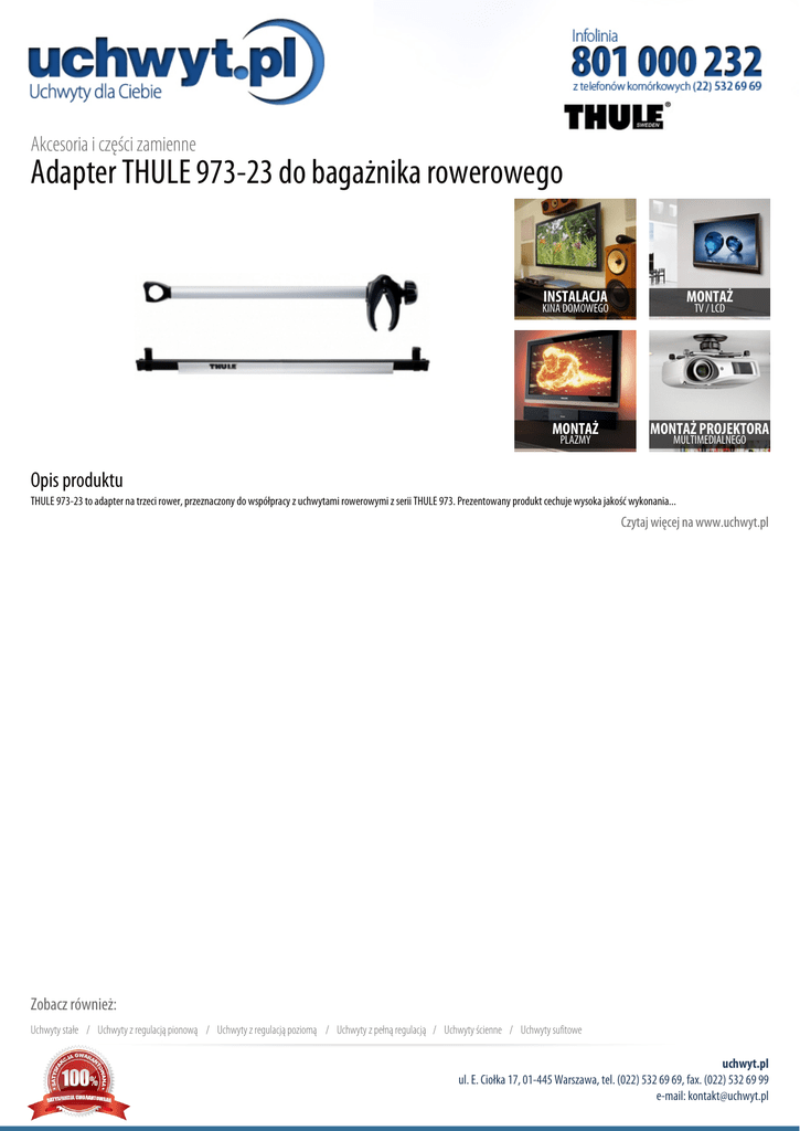 Akcesoria i części zamienne Adapter THULE 973-23 do bagażnika rowerowego INSTALACJA MONTAŻ MONTAŻ MONTAŻ PROJEKTORA KINA DOMOWEGO PLAZMY TV / LCD MULTIMEDIALNEGO Opis produktu THULE 973-23 to adapter na trzeci rower, przeznaczony do współpracy z uchwytami rowerowymi z serii THULE 973. Prezentowany produkt cechuje wysoka jakość wykonania... Czytaj więcej na www.uchwyt.pl Zobacz również: Uchwyty stałe / Uchwyty z regulacją pionową / Uchwyty z regulacją poziomą / Uchwyty z pełną regulacją / Uchwyty ścienne / Uchwyty sufitowe uchwyt.pl ul. E. Ciołka 17, 01-445 Warszawa, tel. (022) 532 69 69, fax. (022) 532 69 99 e-mail: [email protected]