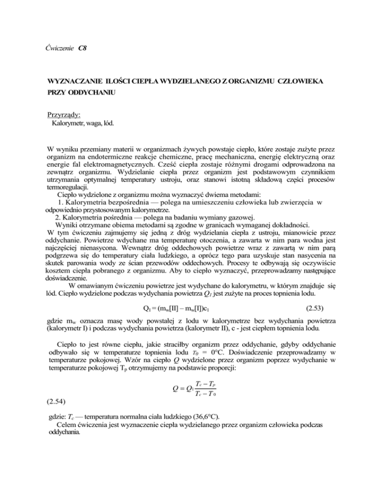 Ćwiczenie C8 WYZNACZANIE ILOŚCI CIEPŁA WYDZIELANEGO Z ORGANIZMU CZŁOWIEKA PRZY ODDYCHANIU Przyrządy: Kalorymetr, waga, lód. W wyniku przemiany materii w organizmach żywych powstaje ciepło, które zostaje zużyte przez organizm na endotermiczne reakcje chemiczne, pracę mechaniczna, energię elektryczną oraz energie fal elektromagnetycznych. Cześć ciepła zostaje różnymi drogami odprowadzona na zewnątrz organizmu. Wydzielanie ciepła przez organizm jest podstawowym czynnikiem utrzymania optymalnej temperatury ustroju, oraz stanowi istotną składową części procesów termoregulacji. Ciepło wydzielone z organizmu można wyznaczyć dwiema metodami: 1. Kalorymetria bezpośrednia — polega na umieszczeniu człowieka lub zwierzęcia w odpowiednio przystosowanym kalorymetrze. 2. Kalorymetria pośrednia — polega na badaniu wymiany gazowej. Wyniki otrzymane obiema metodami są zgodne w granicach wymaganej dokładności. W tym ćwiczeniu zajmujemy się jedną z dróg wydzielania ciepła z ustroju, mianowicie przez oddychanie. Powietrze wdychane ma temperaturę otoczenia, a zawarta w nim para wodna jest najczęściej nienasycona. Wewnątrz dróg oddechowych powietrze wraz z zawartą w nim parą podgrzewa się do temperatury ciała ludzkiego, a oprócz tego para uzyskuje stan nasycenia na skutek parowania wody ze ścian przewodów oddechowych. Procesy te odbywają się oczywiście kosztem ciepła pobranego z organizmu. Aby to ciepło wyznaczyć, przeprowadzamy następujące doświadczenie. W omawianym ćwiczeniu powietrze jest wydychane do kalorymetru, w którym znajduje się lód. Ciepło wydzielone podczas wydychania powietrza Q1 jest zużyte na proces topnienia lodu. Q1 = (mw[II] – mw[I])c1 (2.53) gdzie mw oznacza masę wody powstałej z lodu w kalorymetrze bez wydychania powietrza (kalorymetr I) i podczas wydychania powietrza (kalorymetr II), c - jest ciepłem topnienia lodu. Ciepło to jest równe ciepłu, jakie straciłby organizm przez oddychanie, gdyby oddychanie odbywało się w temperaturze topnienia lodu T0 = 0°C. Doświadczenie przeprowadzamy w temperaturze pokojowej. Wzór na ciepło Q wydzielone przez organizm poprzez wydychanie w temperaturze pokojowej Tp otrzymujemy na podstawie proporcji: Q = Q1 Tc − Tp Tc − T 0 (2.54) gdzie: Tc — temperatura normalna ciała ludzkiego (36,6°C). Celem ćwiczenia jest wyznaczenie ciepła wydzielanego przez organizm człowieka podczas oddychania. Kolejność wykonywanych czynności: I. Zważyć puste i wysuszone naczynia wewnętrzne kalorymetrów I i II bez mieszadeł. 2. Do uformowanego pojemnika z siatki włożyć dwa kawałki lodu (o temp. 0oC – w tym celu pozostawić lód przed włożeniem go do kalorymetru tak długo na kawałku bibułki, aż zacznie się topić, lód przed włożeniem do kalorymetru osuszyć ze stopionej wody) i umieścić go w naczyniu wewnętrznym kalorymetru I. Całość umieścić w osłonie i szczelnie zamknąć pokrywą. Kalorymetr pozostawić na 20 minut. 3. Po upływie 20 minut szybko wyjąć wewnętrzny pojemnik z siatki zawierający lód, otrząsnąć lód z nadmiaru wody do naczynia wewnętrznego kalorymetru i umieścić pojemnik w wewnętrznym naczyniu kalorymetru II. Przez 20 minut wydychać powietrze do kalorymetru II przez ustnik (słomkę). Należy pamiętać, aby oddech był jak najbardziej zbliżony do normalnego, oraz aby całe powietrze było wtłoczone do kalorymetru. Po skończeniu wydychania natychmiast otworzyć kalorymetr i wyjąc z niego pojemnik wraz z pozostałością lodu po uprzednim otrząśnięciu z wody. 4. Zważyć naczynie wewnętrzne kalorymetru I z wodą i odejmując masę pustego naczynia, obliczyć masę wody powstałej ze stopienia lodu pod wpływem ciepła zawartego w kalorymetrze oraz dopływającego z zewnątrz. 5. Zważyć naczynie wewnętrzne kalorymetru II wraz z wodą i odejmując masę pustego naczynia, obliczyć masę wody powstałej podczas wydychania powietrza i skraplania się pary wodnej. Wyniki umieścić w tabeli: I mk I mkw I mw II mk II mkw II mw mwp g 5g T0 C o 0oC Tc C o 36,6oC Tp C ct kJ kg-1 o Q1 335kJ kg-1 gdzie: mk[I] - masa pustego kalorymetru I, mkw[I] - masa kalorymetru I z wodą, mw[I] masa wody powstałej w kalorymetrze I. mk[II] - masa pustego kalorymetru II, mkw[II] - masa kalorymetru II z wodą, mw[II] - masa wody powstałej w kalorymetrze II, mwp - masa wody powstałej na skutek skroplenia się pary wodnej zawartej w wydychanym powietrzu. Całkowite ciepło Q1 stracone przez wydychanie powietrza przy ochłodzeniu się do temperatury T = 0°C obliczyć ze wzoru: Q1 = (mw[II] - mw[I] – mwp)ct 6. Obliczyć ciepło wydychania Q, uwzględniając poprawkę według wzoru (2.54). 7. Przeprowadzić rachunek błędów. (2.55). Wymagania: - pojęcie ciepła i temperatury z punktu widzenia kinetyczno-molekularnej teorii budowy substancji [2, 6 ] definicja ciepła właściwego i ciepła topnienia oraz jednostki tych wielkości zależność temperatury topnienia od ciśnienia