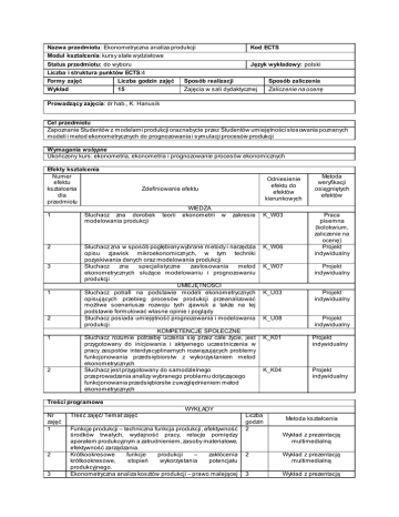 Nazwa przedmiotu: Ekonometryczna analiza produkcji Moduł kształcenia: kursy stałe wydziałowe Kod ECTS Status przedmiotu: do wyboru Liczba i struktura punktów ECTS:4 Język wykładowy: polski Formy zajęć Wykład Liczba godzin zajęć 15 Sposób realizacji Zajęcia w sali dydaktycznej Sposób zaliczenia Zaliczenie na ocenę Prowadzący zajęcia: dr hab., K. Hanusik Cel przedmiotu Zapoznanie Studentów z modelami produkcji oraz nabycie przez Studentów umiejętności stosowania poznanych modeli i metod ekonom etrycznych do prognozowania i symulacji procesów produkcji Wymagania wstępne Ukończony kurs: ekonometria, ekonometria i prognozowanie procesów ekonomicznych Efekty kształcenia Numer efektu kształcenia dla przedmiotu Odniesienie efektu do efektów kierunkowych Zdefiniowanie efektu Słuchacz zna dorobek modelowania produkcji zakresie K_W03 2 Słuchacz zna w sposób pogłębiony wybrane m etody i narzędzia opisu zjawisk mikroekonomicznych, w tym techniki pozyskiwania danych oraz modelowania produkcji Słuchacz zna specjalistyczne zastosowania metod ekonometrycznych służące modelowaniu i prognozowaniu produkcji UMIEJĘTNOŚCI Słuchacz potrafi na podstawie modeli ekonometrycznych opisujących przebieg procesów produkcji przeanalizować możliwe scenariusze rozwoju tych zjawisk a także na tej podstawie formułować własne opinie i poglądy Słuchacz posiada umiejętność prognozowania i modelowania produkcji KOMPETENCJE SPOŁECZNE Słuchacz rozumie potrzebę uczenia się przez całe życie, jest przygotowany do inicjowania i aktywnego uczestniczenia w pracy zespołów interdyscyplinarnych rozwiązujących problemy funkcjonowania przedsiębiorstw z wykorzystaniem metod ekonometrycznych Słuchacz jest przygotowany do samodzielnego przeprowadzenia analizy wybranego problemu dotyczącego funkcjonowania przedsiębiorstw z uwzględnieniem metod ekonometrycznych K_W06 3 1 2 1 2 teorii WIEDZA ekonometrii 1 w Metoda weryfikacji osiągniętych efektów Praca pisemna (kolokwium, zaliczenie na ocenę) Projekt indywidualny K_W07 Projekt indywidualny K_U03 Projekt indywidualny K_U08 Projekt indywidualny K_K01 Projekt indywidualny K_K04 Projekt indywidualny Treści programowe WYKŁADY Nr zajęć 1 2 3 Treść zajęć/ Temat zajęć Funkcje produkcji – techniczna funkcja produkcji, efektywność środków trwałych, wydajność pracy, relacje pomiędzy aparatem produkcyjnym a zatrudnieniem, zasoby materiałowe, efektywność zarządzania. Krótkookresowe funkcje produkcji – zakłócenia krótkookresowe, stopień wykorzystania potencjału produkcyjnego. Ekonometryczna analiza kosztów produkcji – prawo malejącej Liczba godzin 2 Metoda kształcenia Wykład z prezentacją multimedialną 2 Wykład z prezentacją multimedialną 3 Wykład z prezentacją 4 5 6 7 krańcowej wydajności pracy a funkcje kosztów całkowitych w przedsiębiorstwie, funkcje kosztów całkowitych i przychodów a progi rentowności. Analiza gospodarności przedsiębiorstwa – podstawy teoretyczne ekonometrycznego modelowania gospodarności przedsiębiorstwa. Funkcje stosowane w modelowaniu działalności przedsiębiorstwa (Leontief’a, Cobba-Douglas’a, Tinbergen’a, CES), estymacja parametrów funkcji produkcji. Prognozowanie ekonometryczne w przedsiębiorstwie (zapotrzebowania na produkcję, sprzedaży, kosztów, zatrudnienia). Prognozowanie czynników otoczenia przedsiębiorstwa (prognozowanie koniunktury gospodarczej, koniunktury konsumenckiej, prognozy demograficzne). multimedialną 2 Wykład z prezentacją multimedialną 2 Wykład z prezentacją multimedialną 2 Wykład z prezentacją multimedialną 2 Wykład z prezentacją multimedialną Ocena nakładu pracy studenta oraz określenie liczby i struktury punktów ECTS Bilans nakładu pracy przeciętnego studenta - udział w wykładach: 15 x 1 godz. = 15 godz., - realizacja zadania projektowego: 25 godz., - przygotowanie do zaliczenia i obecność na zaliczeniu: 24 godz. + 1 godz. = 15 godz. - konsultacje indywidualne: 35 godz. Łączny nakład pracy studenta 100 Nakład pracy związany z zajęciami wymagającymi 51 bezpośredniego udziału nauczyciela akademickiego Nakład pracy związany z zajęciami o charakterze 49 praktycznym Formy i kryteria zaliczenia przedmiotu i ustalenia oceny (F- formującej; P- podsumowującej) WYKŁADY F1 kolokwium pisemne z pytaniami opisowymi 20% Ocena podsumowująca: F2 projekt indywidualny 80% Średnia ważona ocen wynikająca z ocen formujących F1-F2 Literatura podstawowa 1. Welfe W., Welfe A.: Ekonometria stosowana, Polskie Wydawnictwo Ekonomiczne, Warszawa 2004 2. Hozer J.: Mikroekonomia. Analizy, diagnozy, prognozy, PWE Warszawa 1993 3. Dittmann P., Prognozowanie w przedsiębiorstwie, Oficyna Ekonomiczna, Kraków 2003 4. Guzik B., Appenzeller D., Jurek W., Prognozowanie i symulacje, AE Poznań 2005 5. Welfe W., Welfe A.: Ekonometria stosowana, Polskie Wydawnictwo Ekonomiczne, Warszawa 2004 Literatura uzupełniająca 1. Witkowska D.: Podstawy ekonometrii i teorii prognozowania, Oficyna Ekonomiczna, Kraków 2005 2. Zeliaś A., Pawełek B., Wanat S.: Prognozowanie ekonomiczne, Wydawnictwo Naukowe PWN, Warszawa 2003 1 Nazwa przedmiotu: EKONOMIA BEHAWIORALNA Kod ECTS Moduł kształcenia: kursy stałe wydziałowe Status przedmiotu: PRZEDMIOT DO WYBORU Język wykładowy polski Liczba i struktura punktów ECTS: 4 Formy zajęć Liczba godzin zajęć Sposób realizacji Sposób zaliczenia Wykład zajęcia w sali dydaktycznej Zaliczenie na ocenę 15 Prowadzący zajęcia: dr Marta Maciejasz -Świątkiewicz Cel przedmiotu Celem zajęć jest zapoznanie studentów z podstawowymi zagadnieniami dotyczącymi zachowań podmiotów rynkowych, racjonalności ich działania oraz tego, jak przekłada się ona na efektywność rynku. Celem zajęć jest także zaprezentowanie różnic w analizie zjawisk ekonomicznych w ujęciu klasycznym i b ehawioralnym. Wymagania wstępne Zaliczenie przedmiotu: Mikroekonomia i Makroekonomia lub Ekonomia E