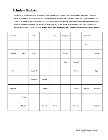 Schule – Sudoku Rozwiązanie sudoku wymaga cierpliwości i spostrzegawczości. Jedną z metod jest metoda eliminacji. Zgodnie z zasadami gry każdy wyraz może pojawić się w jakimś rzędzie, kolumnie czy małym kwadracie (3X3) tylko jeden raz. Oznacza to, że każdy wyraz może wystąpić tylko 9 razy w całym diagramie. Możesz rozpocząć wpisywanie wyrazów, których ujawniono najwięcej – w poniższym diagramie jest to POLNISCH, który wystąpił już 4 razy, zatem musisz znaleźć miejsce dla 5 takich wyrazów. Wpisuj wyraz tylko wtedy, gdy masz pewność, że znalazłeś właściwe miejsce. Deutsch Mathe Bio Englisch Polnisch Bio Polnisch Bio Sport Deutsch Geo Geo Englisch Chemie Englisch Mathe Polnisch Physik Sport Mathe Chemie Mathe Physik Polnisch Chemie Mathe Deutsch Physik Chemie Englisch Szkoła Języków Obcych „Lingua” Schule – Sudoku Rozwiązanie Deutsch Physik Mathe Geo Bio Englisch Sport Polnisch Chemie Chemie Englisch Geo Polnisch Mathe Sport Deutsch Bio Physik Polnisch Bio Sport Physik Chemie Deutsch Geo Englisch Mathe Mathe Deutsch Physik Sport Englisch Geo Polnisch Chemie Bio Geo Polnisch Englisch Bio Deutsch Chemie Physik Mathe Sport Bio Sport Chemie Mathe Polnisch Physik Englisch Deutsch Geo Englisch Geo Deutsch Chemie Sport Bio Mathe Physik Polnisch Physik Chemie Polnisch Englisch Geo Mathe Bio Sport Deutsch Sport Mathe Bio Deutsch Physik Polnisch Chemie Geo Englisch Szkoła Języków Obcych „Lingua”