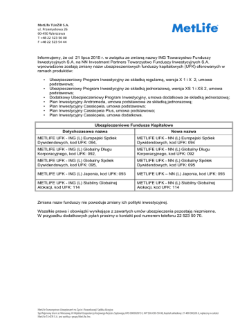 Informujemy, że od 21 lipca 2015 r. w związku ze zmianą nazwy ING Towarzystwo Funduszy Inwestycyjnych S.A. na NN Investment Partners Towarzystwo Funduszy Inwestycyjnych S.A. wprowadzone zostają zmiany nazw ubezpieczeniowych funduszy kapitałowych (UFK) oferowanych w ramach produktów: • • • • • • • Ubezpieczeniowy Program Inwestycyjny ze składką regularną, wersja X 1 i X 2, umowa podstawowa; Ubezpieczeniowy Program Inwestycyjny ze składką jednorazową, wersja XS 1 i XS 2, umowa podstawowa; Dodatkowy Ubezpieczeniowy Program Inwestycyjny, umowa dodatkowa ze składką jednorazową; Plan Inwestycyjny Andromeda, umowa podstawowa ze składką jednorazową; Plan Inwestycyjny Cassiopeia, umowa podstawowa; Plan Inwestycyjny Cassiopeia Plus, umowa podstawowa; Plan Inwestycyjny Cassiopeia, umowa dodatkowa. Ubezpieczeniowe Fundusze Kapitałowe Dotychczasowa nazwa Nowa nazwa METLIFE UFK - ING (L) Europejski Spółek Dywidendowych, kod UFK: 094, METLIFE UFK - NN (L) Europejski Spółek Dywidendowych, kod UFK: 094 METLIFE UFK - ING (L) Globalny Długu Korporacyjnego, kod UFK: 092, METLIFE UFK - NN (L) Globalny Długu Korporacyjnego, kod UFK: 092 METLIFE UFK - ING (L) Globalny Spółek Dywidendowych, kod UFK: 095, METLIFE UFK - NN (L) Globalny Spółek Dywidendowych, kod UFK: 095 METLIFE UFK - ING (L) Japonia, kod UFK: 093 METLIFE UFK – NN (L) Japonia, kod UFK: 093 METLIFE UFK - ING (L) Stabilny Globalnej Alokacji, kod UFK: 114 METLIFE UFK - NN (L) Stabilny Globalnej Alokacji, kod UFK: 114 Zmiana nazw funduszy nie powoduje zmiany ich polityki inwestycyjnej. Wszelkie prawa i obowiązki wynikające z zawartych umów ubezpieczenia pozostają niezmienne. W przypadku dodatkowych pytań prosimy o kontakt pod numerem telefonu 22 523 50 70.