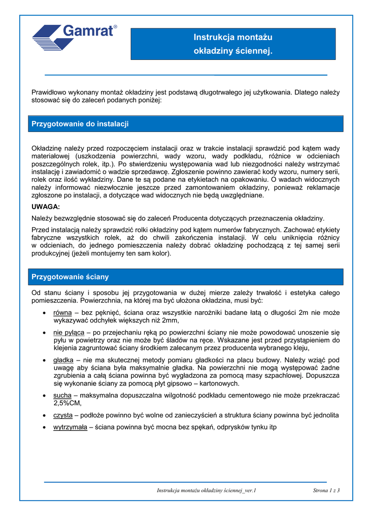 Instrukcja montażu okładziny ściennej. Prawidłowo wykonany montaż okładziny jest podstawą długotrwałego jej użytkowania. Dlatego należy stosować się do zaleceń podanych poniżej: Przygotowanie do instalacji Okładzinę należy przed rozpoczęciem instalacji oraz w trakcie instalacji sprawdzić pod kątem wady materiałowej (uszkodzenia powierzchni, wady wzoru, wady podkładu, różnice w odcieniach poszczególnych rolek, itp.). Po stwierdzeniu występowania wad lub niezgodności należy wstrzymać instalację i zawiadomić o wadzie sprzedawcę. Zgłoszenie powinno zawierać kody wzoru, numery serii, rolek oraz ilość wykładziny. Dane te są podane na etykietach na opakowaniu. O wadach widocznych należy informować niezwłocznie jeszcze przed zamontowaniem okładziny, ponieważ reklamacje zgłoszone po instalacji, a dotyczące wad widocznych nie będą uwzględniane. UWAGA: Należy bezwzględnie stosować się do zaleceń Producenta dotyczących przeznaczenia okładziny. Przed instalacją należy sprawdzić rolki okładziny pod kątem numerów fabrycznych. Zachować etykiety fabryczne wszystkich rolek, aż do chwili zakończenia instalacji. W celu uniknięcia różnicy w odcieniach, do jednego pomieszczenia należy dobrać okładzinę pochodzącą z tej samej serii produkcyjnej (jeżeli montujemy ten sam kolor). Przygotowanie ściany Od stanu ściany i sposobu jej przygotowania w dużej mierze zależy trwałość i estetyka całego pomieszczenia. Powierzchnia, na której ma być ułożona okładzina, musi być: równa – bez pęknięć, ściana oraz wszystkie narożniki badane łatą o długości 2m nie może wykazywać odchyłek większych niż 2mm, nie pyląca – po przejechaniu ręką po powierzchni ściany nie może powodować unoszenie się pyłu w powietrzy oraz nie może być śladów na ręce. Wskazane jest przed przystąpieniem do klejenia zagruntować ściany środkiem zalecanym przez producenta wybranego kleju, gładka – nie ma skutecznej metody pomiaru gładkości na placu budowy. Należy wziąć pod uwagę aby ściana była maksymalnie gładka. Na powierzchni nie mogą występować żadne zgrubienia a całą ściana powinna być wygładzona za pomocą masy szpachlowej. Dopuszcza się wykonanie ściany za pomocą płyt gipsowo – kartonowych. sucha – maksymalna dopuszczalna wilgotność podkładu cementowego nie może przekraczać 2,5%CM, czysta – podłoże powinno być wolne od zanieczyścień a struktura ściany powinna być jednolita wytrzymała – ściana powinna być mocna bez spękań, odprysków tynku itp Instrukcja montażu okładziny ściennej_ver.1 Strona 1 z 3 Klejenie Przed przystąpieniem do przycinania, okładzinę należy rozwinąć i pozostawić płasko rozłożoną na okres 1-2 godzin w temperaturze pokojowej – gdy temperatura w pomieszczeniu jest zbliżona do 15°C - "leżakowanie" może potrwać nawet dobę. Gdy okładzina uzyska właściwą temperaturę będzie bardziej elastyczna i łatwiej ją będzie ułożyć. UWAGA : Gamrat nie ponosi odpowiedzialności za niewłaściwe i źle przygotowane podłoże. Warunki klimatyczne do instalacji okładziny ściennej to: a. temperatura ściany 15 – 22 °C b. temperatura powietrza 17- 25 °C c. względna wilgotność powietrza max 75 % ( warunki idealne to 55% ) Aby zachować wysoką jakość okładziny oraz jej długotrwałą żywotność, należy przykleić ją na całej powierzchni. Do klejenia używamy klejów dyspersyjnych identycznych jak do klejenia wykładzin a w przypadku cokołów i narożników wewnętrznych i zewnętrznych używamy kleju kontaktowego. Zarówno podczas używania mas wyrównujących, impregnatów jak również podczas klejenia należy stosować środki specjalnie przeznaczone pod elastyczne wykładziny oraz bezwzględnie stosować się do zaleceń i uwag dołączonych do produktu przez ich producenta. Tylko takie zachowanie może doprowadzić do uzyskania odpowiedniego podłoża pod montaż okładziny.. Okładzina ścienna może być układana w pozycji pionowej lub poziomej. Montaż polega na przyklejeniu arkuszy całą powierzchnią do wcześniej przygotowanej ściany. Przed przystąpieniem do klejenia na ścianie należy wyznaczyć wszystkie linie łączące w skali 1:1. Przy pomieszczeniach małych, takich jak łazienka lub ubikacja, dopasowaną okładzinę najlepiej zdjąć, nanieść klej ząbkowaną szpachelką, odczekać aż przeschnie, zgodnie z zaleceniem producenta kleju, i cały arkusz położyć ponownie, zaczynając od najdłuższego boku - sprawdzając czy dobrze pasuje do ścian i innych elementów stałych. W dużych pomieszczeniach konieczne jest klejenie etapami, zwłaszcza przy łączeniu dwóch arkuszy okładziny. Na ścianę nanosimy odpowiedni klej za pomocą ząbkowanej szpachelki (zgodnie z instrukcją producenta kleju). Warstwa kleju powinna być równa bez zgrubień, naniesiona na całą powierzchnię. W zależności od temperatury i rodzaju kleju odczekujemy 10-20 minut, po czym należy dopasować i równomiernie docisnąć okładzinę do ściany - w kierunku od środka do zewnątrz, a następnie wzdłuż linii łączenia arkuszy i przy brzegach. Przy klejeniu należy kierować się instrukcją podaną na opakowaniu kleju przez producenta. Pomieszczenia zamknięte po wyłożeniu wykładziny należy wietrzyć do zaniku specyficznego zapachu i dopiero po tym okresie nadają się do użytku. Wykończenia Narożnik wewnętrzny – narożnik powinien być wykonany z jednego arkusza, należy unikać połączeń w samym narożniku ze względu na możliwość gromadzenia się tam zanieczyszczeń trudnych do usunięcia. Łączenie arkuszy należy wykonać w odległości ok 10 cm od narożnika. Wykładzinę dodatkowo należy podgrzać aby dokładnie dopasowała się do narożnika. Narożnik zewnętrzny – narożnik wykonujemy w podobny sposób jak narożnik wewnętrzny jednak w tym przypadku zaleca się przefrezowanie warstwy spodniej okła