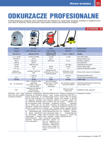 Maszyny sprzątające ODKURZACZE PROFESIONALNE W tabeli znajdują się urządzenia, które zaproponowali nam dostawcy do codziennego sprzątania wykładzin w obiektach biurowych (600 m2 dziennie). Dane techniczne i opisy podane zostały przez dostawców urządzeń. ZESTAWIENIE COMAC SOTECO HAKO KÄRCHER PRODUCENT Agapit BKF Tenzi Sp. z o.o. Hako Polska Kärcher Dystrybutor DRY P12 S Dakota 423 W Supervac 290 sucho/mokro T 12/1 + ESB 28 1,2 / 1,4 kW 2,6 kW (2 silniki) 1,0 kW 1,3 kW 230-240 V 230 V 230 V 48 l/s 430 m3/h 3240 l/min 1200 W 600 W 29 kPa 2400 mm H2O 60 dB 76 dB 66 dB 61 dB 25 / 12 l 72 l 21,5 l 12 l cartridge; 87,00 PLN netto papierowe 97% sprawności cena 72,20 PLN/netto/10szt fizelionowy 10 szt 65,00 PLN netto papierowy – 5,90 PLN netto Moc silnika [kW] Rodzaj zasilania [V] 61 l/s Przepływ powietrza Moc ssania [W] 244 mbar 3 180 cm2 1100 cm2 10 m 8,5 m 10 m 12 m 6,5 kg 27 kg 8 kg 6,6 kg tak – na zamówienie HEPA – 245,00 zł netto; papierowe (pow. filtra: 3 590 cm2) – 9,00 PLN netto mikro filtr stopień separacji pyłu >99,9% dla cząstek 1~3 mikrometry jest możliwość zastosowania filtra HEPA12 filtry odkurzacz do zbierania zanieczyszczeń suchych i mokrych tak ESB 28 szczotka elektryczna Atrakcyjna cena, wyjąt- Odkurzacz profesjonalny, kowo cichy przy wysokim stosowany do sprzątania przepływie powietrza dużych pomieszczeń, takich jak hale produkcyjne, magazyny, warsztaty, itp. Doskonale sprawdza się przy sprzątaniu obiektów w trakcie prac budowlanych. Posiada duży zbiornik o pojemności 72 l, umieszczony na wózku samowyładowczym, co ułatwia pozbywanie się nieczystości. Dzięki zastosowaniu 2 silników wolnoobrotowych może pracować nieprzerwanie przez wiele godzin. MODEL Odkurzacz HAKO ma wbudowany układ by-pass charakteryzujący się tym, że wstrzymanie zasysanego powietrza poprzez wąż na dłuższy czas, nie spowoduje przepalenia się silnika. Powietrze do chłodzenia odkurzacza zasysane jest szczeliną w obudowie. Pojemniki na śmieci wykonane są z tworzywa sztucznego odpornego na uderzenia i większość chemikali. Trwała i wytrzymała konstrukcja odkurzacza sprawia że jest on wyjątkowo wytrzymały i długowieczny. Odkurzacz dostosowany jest do pracy ciągłej zarówno na sucho jak i na mokro. Podciśnienie przy dyszy Poziom hałasu [dB] Pojemność zbiornika (worka) Rodzaj worka i jego cena katalogowa Powierzchnia filtra [cm2] Długość kabla zasilającego [m] Ciężar [kg] Możliwość zastosowania różnych klas filtrów (HEPA, inne) Dodatkowe opcje, akcesoria Mobilny, kompaktowy, er- Uzasadnienie wyboru gonomiczny, duży filtr nylonowy, lekki, nie zajmuje dużo miejsca w pozycji w schowku, idealny do malych i średnich powierzchni. Możliwość podłączenia szczotki elektrycznej do okurzacza to bardzo wygodny sposób na szczotkowe odkurzanie wykładzin również w trudnodostępnych miejscach w biurze (np pod biurkami itd.) www.firmasprzatajaca.pl Nr 2/2008 37 Maszyny sprzątające ODKURZACZE PROFESIONALNE W tabeli znajdują się urządzenia, które zaproponowali nam dostawcy do codziennego sprzątania wykładzin w obiektach biurowych (600 m2 dziennie). Dane techniczne i opisy podane zostały przez dostawców urządzeń. ZESTAWIENIE ZESTAWIENIE PRODUCENT HEFTER CLEANTECH NILFISK NUMATIC JohnsonDiversey HCS Europe Sp z o.o. Nilfisk-Advance Sp. z o.o. Polor Sp. z o.o Vento 15 10 HDS 2000 NVP 180 Moc silnika [kW] 1,0 kW 1,2 (nominalna) 1,4 (maksymalna) 1,25 kW 1,2 kW Rodzaj zasilania 230 V 230 V 220 V 230 V Przepływ powietrza 61 l/s 67 l/s 35/29 l/min 45 l/s 425 W 280/150 W Dystrybutor MODEL TASKI Moc ssania [W] Podciśnienie przy dyszy 22 kPa Minimum 2700 mm H2O 23/17 kPa 2600 mm Poziom hałasu [dB] 59 dB 63 dB 46/44 dB 69 dB 15 l 10 l 10 l 8l Papier/fizelina 11,00/13,30 PLN Papierowy, 1,40 PLN/szt. worek papierowy (opcja: worek płócienny) papierowy, dwuwarstwowy, 3,40 PLN netto/szt. 3000 cm2 3700 cm2 10,5 m 8m 15 m 13,4 m 8 kg 6,2kg 9 kg 5,8 kg HEPA oraz filtr wydmuchu Opcjonalnie HEPA (filtr HEPA w standardzie, opcje: filtr przedsilnikowy) tak Pojemność zbiornika (worka) Rodzaj worka i jego cena katalogowa Powierzchnia filtra [cm2] Długość kabla zasilającego [m] Ciężar [kg] Możliwość zastosowania różnych klas filtrów (HEPA, inne) Wyposażony w ssawę pła- W zestawie: wąż ssący z ską, szczelinową i szczot- regulacją siły ssania, rura kę walcową ssąca 2 częsciowa - chromowana; ssawa "kombi" Dodatkowe opcje, akcesoria do duzych powierzchni, ssawa do małych powierzchni, ssawa do tapicerki, ssawa okrągła Cichy, wydajny odkurzacz. Możliwość naprawy węża ssącego oraz szybka wymiana przewodu zasilającego w wypadku awarii. Uzasadnienie wyboru 38 Nr 2/2008 www.firmasprzatajaca.pl Niski poziom hałasu, duża pojemność worka przy małych wymiarach zewnętrznych, odporna na uszkodzenia metalowa odbudowa, 3 koła gumowe zapewniają łatwe manewrowanie i nie pozstawiają charakterystycznych sladów na podłodze, 8 stopniowy system filtracji, zabezpieczenie silnika przed przegrzaniem, 2 letnia gwarancja z możliwością wydłużenia Szeroki wybór dysz do różnych aplikacji, silnik w kasecie, który w razie awarii można wymienić w miejscu pracy Najcichszy odkurzacz w 2-letnia gwarancja, najswojej klasie. Czyszczenie niższa cena, uśmiech w nie zakłóca rytmu życia standardzie np. w hotelu lub biurze. Umożliwia sprzatanie w dzień co zwiększa wydajność personelu sprzątającego. Maszyny sprzątające ODKURZACZE PROFESIONALNE W tabeli znajdują się urządzenia, które zaproponowali nam dostawcy do codziennego sprzątania wykładzin w obiektach biurowych (600 m2 dziennie). Dane techniczne i opisy podane zostały przez dostawców urządzeń. ZESTAWIENIE LAVOR PRO TENNANT FIMAP WETROK PRODUCENT Precyzja-Bit Werner & Mertz Polska Sp. z o.o. Ecolab Wetrok Polska S.A. Dystrybutor Whisper V8 V5 FBV10 Monovac 6 1,25 kW 0,95 kW 1,2 kW 1,0 kW Moc silnika [kW] 230 V 230 V 230 V 230 V Rodzaj zasilania 56 l/s 3
