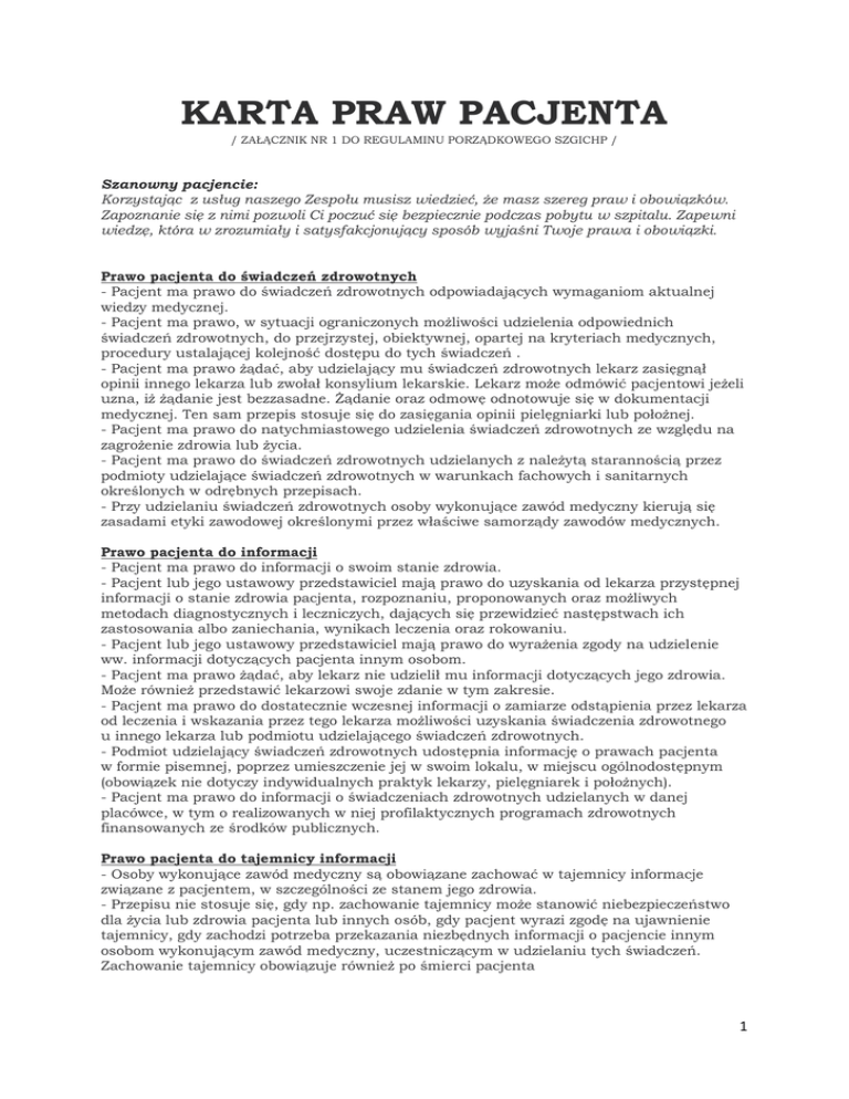 KARTA PRAW PACJENTA / ZAŁĄCZNIK NR 1 DO REGULAMINU PORZĄDKOWEGO SZGICHP / Szanowny pacjencie: Korzystając z usług naszego Zespołu musisz wiedzieć, że masz szereg praw i obowiązków. Zapoznanie się z nimi pozwoli Ci poczuć się bezpiecznie podczas pobytu w szpitalu. Zapewni wiedzę, która w zrozumiały i satysfakcjonujący sposób wyjaśni Twoje prawa i obowiązki. Prawo pacjenta do świadczeń zdrowotnych - Pacjent ma prawo do świadczeń zdrowotnych odpowiadających wymaganiom aktualnej wiedzy medycznej. - Pacjent ma prawo, w sytuacji ograniczonych możliwości udzielenia odpowiednich świadczeń zdrowotnych, do przejrzystej, obiektywnej, opartej na kryteriach medycznych, procedury ustalającej kolejność dostępu do tych świadczeń . - Pacjent ma prawo żądać, aby udzielający mu świadczeń zdrowotnych lekarz zasięgnął opinii innego lekarza lub zwołał konsylium lekarskie. Lekarz może odmówić pacjentowi jeżeli uzna, iż żądanie jest bezzasadne. Żądanie oraz odmowę odnotowuje się w dokumentacji medycznej. Ten sam przepis stosuje się do zasięgania opinii pielęgniarki lub położnej. - Pacjent ma prawo do natychmiastowego udzielenia świadczeń zdrowotnych ze względu na zagrożenie zdrowia lub życia. - Pacjent ma prawo do świadczeń zdrowotnych udzielanych z należytą starannością przez podmioty udzielające świadczeń zdrowotnych w warunkach fachowych i sanitarnych określonych w odrębnych przepisach. - Przy udzielaniu świadczeń zdrowotnych osoby wykonujące zawód medyczny kierują się zasadami etyki zawodowej określonymi przez właściwe samorządy zawodów medycznych. Prawo pacjenta do informacji - Pacjent ma prawo do informacji o swoim stanie zdrowia. - Pacjent lub jego ustawowy przedstawiciel mają prawo do uzyskania od lekarza przystępnej informacji o stanie zdrowia pacjenta, rozpoznaniu, proponowanych oraz możliwych metodach diagnostycznych i leczniczych, dających się przewidzieć następstwach ich zastosowania albo zaniechania, wynikach leczenia oraz rokowaniu. - Pacjent lub jego ustawowy przedstawiciel mają prawo do wyrażenia zgody na udzielenie ww. informacji dotyczących pacjenta innym osobom. - Pacjent ma prawo żądać, aby lekarz nie udzielił mu informacji dotyczących jego zdrowia. Może również przedstawić lekarzowi swoje zdanie w tym zakresie. - Pacjent ma prawo do dostatecznie wczesnej informacji o zamiarze odstąpienia przez lekarza od leczenia i wskazania przez tego lekarza możliwości uzyskania świadczenia zdrowotnego u innego lekarza lub podmiotu udzielającego świadczeń zdrowotnych. - Podmiot udzielający świadczeń zdrowotnych udostępnia informację o prawach pacjenta w formie pisemnej, poprzez umieszczenie jej w swoim lokalu, w miejscu ogólnodostępnym (obowiązek nie dotyczy indywidualnych praktyk lekarzy, pielęgniarek i położnych). - Pacjent ma prawo do informacji o świadczeniach zdrowotnych udzielanych w danej placówce, w tym o realizowanych w niej profilaktycznych programach zdrowotnych finansowanych ze środków publicznych. Prawo pacjenta do tajemnicy informacji - Osoby wykonujące zawód medyczny są obowiązane zachować w tajemnicy informacje związane z pacjentem, w szczególności ze stanem jego zdrowia. - Przepisu nie stosuje się, gdy np. zachowanie tajemnicy może stanowić niebezpieczeństwo dla życia lub zdrowia pacjenta lub innych osób, gdy pacjent wyrazi zgodę na ujawnienie tajemnicy, gdy zachodzi potrzeba przekazania niezbędnych informacji o pacjencie innym osobom wykonującym zawód medyczny, uczestniczącym w udzielaniu tych świadczeń. Zachowanie tajemnicy obowiązuje również po śmierci pacjenta 1 Prawo pacjenta do wyrażenia zgody na badanie i leczenie - Pacjent ma prawo do wyrażenia zgody na udzielenie określonych świadczeń zdrowotnych lub odmowy takiej zgody. - Pacjent ma prawo do wyrażenia zgody na przeprowadzenie badania lub udzielenie innych świadczeń zdrowotnych przez lekarza. - Prawo do wyrażenia zgody ma przedstawiciel ustawowy pacjenta małoletniego, całkowicie ubezwłasnowolnionego lub niezdolnego do świadomego wyrażenia zgody. W przypadku braku przedstawiciela ustawowego prawo to, w odniesieniu do badania, może wykonać opiekun faktyczny. - Pacjent małoletni, który ukończył 16 lat, osoba ubezwłasnowolniona albo pacjent chory psychicznie lub upośledzony umysłowo, lecz dysponujący dostatecznym rozeznaniem, ma prawo do wyrażenia sprzeciwu co do udzielenia świadczenia zdrowotnego, pomimo zgody przedstawiciela ustawowego lub opiekuna faktycznego. W takim przypadku wymagane jest zezwolenie sądu opiekuńczego. - Zgoda oraz sprzeciw na udzielenie świadczeń zdrowotnych mogą być wyrażone przez pacjenta ustnie albo poprzez takie zachowanie, które w sposób niebudzący wątpliwości wskazuje na wolę poddania się proponowanym przez lekarza czynnościom albo brak takiej woli. - W przypadku zabiegu operacyjnego albo zastosowania metody leczenia lub diagnostyki stwarzających podwyższone ryzyko dla pacjenta, zgodę wyraża się w formie pisemnej. Prawo do poszanowania intymności i godności pacjenta - Pacjent ma prawo do poszanowania intymności i godności, w szczególności w czasie udzielania mu świadczeń zdrowotnych. - Prawo do poszanowania godności obejmuje także prawo do umierania w spokoju i godności. Pacjent znajdujący się w stanie terminalnym ma prawo do świadczeń zdrowotnych zapewniających łagodzenie bólu i innych cierpień. - Przy udzielaniu świadczeń zdrowotnych może być obecna osoba bliska. - Osoba wykonująca zawód medyczny udzielająca świadczeń zdrowotnych pacjentowi może odmówić obecności osoby bliskiej przy udzielaniu świadczeń zdrowotnych, w przypadku istnienia prawdopodobieństwa wystąpienia zagrożenia epidemicznego lub ze względu na bezpieczeństwo zdrowotne pacjenta. Odmowę odnotowuje się w dokumentacji medycznej. - Osoby wykonujące zawód medyczny, inne niż udzielające świadczeń zd