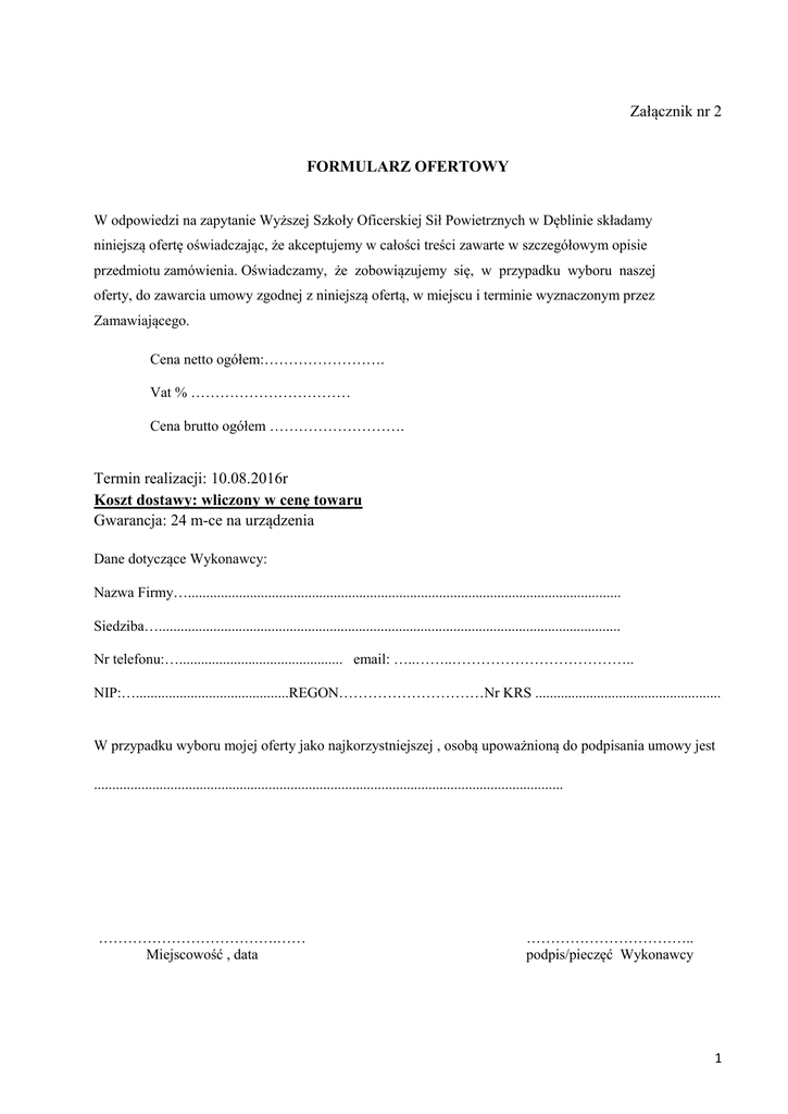 Załącznik nr 2 FORMULARZ OFERTOWY W odpowiedzi na zapytanie Wyższej Szkoły Oficerskiej Sił Powietrznych w Dęblinie składamy niniejszą ofertę oświadczając, że akceptujemy w całości treści zawarte w szczegółowym opisie przedmiotu zamówienia. Oświadczamy, że zobowiązujemy się, w przypadku wyboru naszej oferty, do zawarcia umowy zgodnej z niniejszą ofertą, w miejscu i terminie wyznaczonym przez Zamawiającego. Cena netto ogółem:……………………. Vat % …………………………… Cena brutto ogółem ………………………. Termin realizacji: 10.08.2016r Koszt dostawy: wliczony w cenę towaru Gwarancja: 24 m-ce na urządzenia Dane dotyczące Wykonawcy: Nazwa Firmy…....................................................................................................................... Siedziba…............................................................................................................................... Nr telefonu:…............................................. email: …..……..……………………………….. NIP:…..........................................REGON…………………………Nr KRS ................................................... W przypadku wyboru mojej oferty jako najkorzystniejszej , osobą upoważnioną do podpisania umowy jest ................................................................................................................................. ……………………………….…… Miejscowość , data …………………………….. podpis/pieczęć Wykonawcy 1