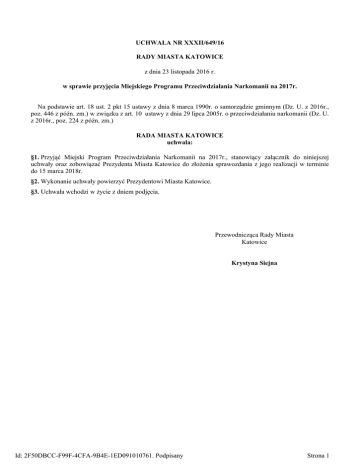 UCHWAŁA NR XXXII/649/16 RADY MIASTA KATOWICE z dnia 23 listopada 2016 r. w sprawie przyjęcia Miejskiego Programu Przeciwdziałania Narkomanii na 2017r. Na podstawie art. 18 ust. 2 pkt 15 ustawy z dnia 8 marca 1990r. o samorządzie gminnym (Dz. U. z 2016r., poz. 446 z późn. zm.) w związku z art. 10 ustawy z dnia 29 lipca 2005r. o przeciwdziałaniu narkomanii (Dz. U. z 2016r., poz. 224 z późn. zm.) RADA MIASTA KATOWICE uchwala: §1. Przyjąć Miejski Program Przeciwdziałania Narkomanii na 2017r., stanowiący załącznik do niniejszej uchwały oraz zobowiązać Prezydenta Miasta Katowice do złożenia sprawozdania z jego realizacji w terminie do 15 marca 2018r. §2. Wykonanie uchwały powierzyć Prezydentowi Miasta Katowice. §3. Uchwała wchodzi w życie z dniem podjęcia. Przewodnicząca Rady Miasta Katowice Krystyna Siejna Id: 2F50DBCC-F99F-4CFA-9B4E-1ED091010761. Podpisany Strona 1 Załącznik do Uchwały Nr XXXII/649/16 Rady Miasta Katowice z dnia 23 listopada 2016 r. Miejski Program Przeciwdziałania Narkomanii w Katowicach na 2017 rok Id: 2F50DBCC-F99F-4CFA-9B4E-1ED091010761. Podpisany Strona 1 SPIS TREŚCI Wstęp Rozdział I Cele i zadania Miejskiego Programu Przeciwdziałania Narkomanii. Rozdział II Zasady realizacji i finansowania Programu. Rozdział III Struktura finansowania Programu. WSTĘP Miejski Program Przeciwdziałania Narkomanii na 2017 rok, zwany dalej Programem, jest elementem „Miejskiej strategii rozwiązywania problemów społecznych na lata 2016-2021” oraz jest współrealizowany z Miejskim Programem Profilaktyki i Rozwiązywania Problemów Alkoholowych na 2017 rok. Realizacja Miejskiego Programu Przeciwdziałania Narkomanii ma na celu prowadzenie działań wychowawczych, edukacyjnych, informacyjnych zapobiegawczych, ograniczanie szkód zdrowotnych i społecznych wynikających z używania środków narkotykowych oraz ma przyczyniać się do pomocy społecznej osobom uzależnionym, rodzinom osób uzależnionych dotkniętych ubóstwem i wykluczeniem społecznym oraz integrować ich ze środowiskiem lokalnym. Id: 2F50DBCC-F99F-4CFA-9B4E-1ED091010761. Podpisany Strona 2 Rozdział I Cele i zadania Miejskiego Programu Przeciwdziałania Narkomanii. Cele Programu : a) zapobieganie używaniu środków narkotykowych, b) ograniczenie szkód zdrowotnych i społecznych wynikających z używania środków narkotykowych. Zadania Programu : 1. Zwiększenie dostępności pomocy terapeutycznej i rehabilitacyjnej dla osób uzależnionych i osób zagrożonych uzależnieniem poprzez: a) wspomaganie grup terapeutycznych oraz grup wsparcia dla osób uzależnionych i zagrożonych uzależnieniem, b) wspieranie działalności punktów informacyjno - konsultacyjnych z zakresu problemów narkotykowych. 2. Udzielanie rodzinom, w których występują problemy narkomanii, pomocy psychospołecznej i prawnej poprzez: a) wspieranie organizacji pozarządowych realizujących taką pomoc, b) Ośrodek Interwencji Kryzysowej Miejskiego Ośrodka Pomocy Społecznej, w ramach jego statutowej działalności. 3. Prowadzenie profilaktycznej działalności informacyjnej, edukacyjnej oraz szkoleniowej w zakresie rozwiązywania problemów narkomanii oraz uzależnień od innych środków psychoaktywnych, w szczególności dla dzieci i młodzieży, w tym prowadzenie zajęć sportowo-rekreacyjnych dla uczniów, a także działań na rzecz dożywiania dzieci uczestniczących w pozalekcyjnych programach opiekuńczo-wychowawczych i socjoterapeutycznych, poprzez: Id: 2F50DBCC-F99F-4CFA-9B4E-1ED091010761. Podpisany Strona 3 a) prowadzenie placówek wsparcia dziennego dla dzieci i młodzieży w szczególności w formie opiekuńczej i specjalistycznej, w tym: kół zainteresowań, świetlic, klubów i ognisk wychowawczych oraz grup profilaktycznych dla młodzieży b) realizację środowiskowych programów profilaktycznych, prowadzonych na terenie szkół, wg następujących założeń merytorycznych : realizacja w formie zajęć pozalekcyjnych z wykorzystaniem różnych form oddziaływań o charakterze sportowym, kulturalnym, zajęć wyrównawczych, w połączeniu z oddziaływaniami o charakterze psychologiczno–pedagogicznym i edukacyjnoinformacyjnymi z zakresu profilaktyki uzależnień, adresowanych w pierwszej kolejności do dzieci zaniedbanych wychowawczo i mających na celu nawiązywanie współpracy z rodzicami, realizacja przez współpracujące ze sobą instytucje (np. szkoły, terenowe punkty pomocy społecznej, uczniowskie kluby sportowe, organizacje pozarządowe, poradnie psychologiczno – pedagogiczne), koordynacja merytoryczna przez osobę wyznaczoną przez dyrektora szkoły, w której realizowany jest program; wskazane jest aby koordynator merytoryczny posiadał kwalifikacje dotyczące pracy psychoprofilaktycznej z dziećmi c) prowadzenie środowiskowych programów profilaktycznych w formie pozalekcyjnych zajęć sportowych realizowanych poprzez uczniowskie kluby sportowe i uwzględniających następujące elementy: włączanie w zajęcia sportowe dzieci znajdujących się w trudnej sytuacji np. materialnej, rodzinnej, wychowawczej, podejmowanie współpracy ze szkołami w realizacji zadań wynikających z programów wychowawczych i programów profilaktyki szkolnej, d) prowadzenie programów profilaktycznych dla dzieci, młodzieży i rodziców w zakresie używania substancji psychoaktywnych, e) organizowanie dla różnych grup zawodowych konferencji lub szkoleń w zakresie skutków używania substancji psychoaktywnych. 4. Wspomaganie działalności instytucji, organizacji pozarządowych i osób fizycznych, służącej rozwiązywaniu problemów narkomanii, poprzez: a) współfinansowanie lub finansowanie zadań stanowiących realizację Programu, poprzez udzielanie dotacji lub zlecanie zadań na podstawie ustawy prawo zamówień publicznych Id: 2F50DBCC-F99F-4CFA-9B4E-1ED091010761. Podpisany Strona 4 b) wzmacnianie kompetencji w zakresie profilaktyki uzależnień oraz przeciwdziałania przemocy o