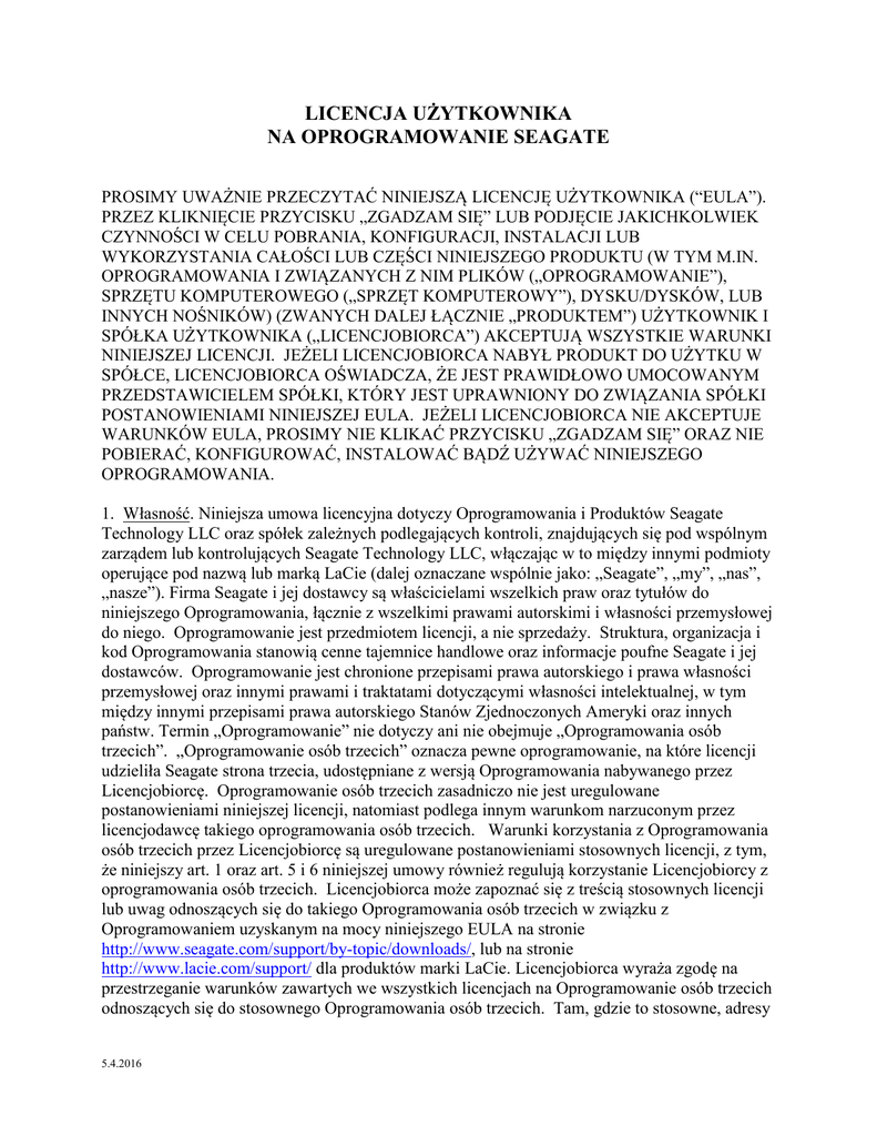 LICENCJA UŻYTKOWNIKA NA OPROGRAMOWANIE SEAGATE PROSIMY UWAŻNIE PRZECZYTAĆ NINIEJSZĄ LICENCJĘ UŻYTKOWNIKA (“EULA”). PRZEZ KLIKNIĘCIE PRZYCISKU „ZGADZAM SIĘ” LUB PODJĘCIE JAKICHKOLWIEK CZYNNOŚCI W CELU POBRANIA, KONFIGURACJI, INSTALACJI LUB WYKORZYSTANIA CAŁOŚCI LUB CZĘŚCI NINIEJSZEGO PRODUKTU (W TYM M.IN. OPROGRAMOWANIA I ZWIĄZANYCH Z NIM PLIKÓW („OPROGRAMOWANIE”), SPRZĘTU KOMPUTEROWEGO („SPRZĘT KOMPUTEROWY”), DYSKU/DYSKÓW, LUB INNYCH NOŚNIKÓW) (ZWANYCH DALEJ ŁĄCZNIE „PRODUKTEM”) UŻYTKOWNIK I SPÓŁKA UŻYTKOWNIKA („LICENCJOBIORCA”) AKCEPTUJĄ WSZYSTKIE WARUNKI NINIEJSZEJ LICENCJI. JEŻELI LICENCJOBIORCA NABYŁ PRODUKT DO UŻYTKU W SPÓŁCE, LICENCJOBIORCA OŚWIADCZA, ŻE JEST PRAWIDŁOWO UMOCOWANYM PRZEDSTAWICIELEM SPÓŁKI, KTÓRY JEST UPRAWNIONY DO ZWIĄZANIA SPÓŁKI POSTANOWIENIAMI NINIEJSZEJ EULA. JEŻELI LICENCJOBIORCA NIE AKCEPTUJE WARUNKÓW EULA, PROSIMY NIE KLIKAĆ PRZYCISKU „ZGADZAM SIĘ” ORAZ NIE POBIERAĆ, KONFIGUROWAĆ, INSTALOWAĆ BĄDŹ UŻYWAĆ NINIEJSZEGO OPROGRAMOWANIA. 1. Własność. Niniejsza umowa licencyjna dotyczy Oprogramowania i Produktów Seagate Technology LLC oraz spółek zależnych podlegających kontroli, znajdujących się pod wspólnym zarządem lub kontrolujących Seagate Technology LLC, włączając w to między innymi podmioty operujące pod nazwą lub marką LaCie (dalej oznaczane wspólnie jako: „Seagate”, „my”, „nas”, „nasze”). Firma Seagate i jej dostawcy są właścicielami wszelkich praw oraz tytułów do niniejszego Oprogramowania, łącznie z wszelkimi prawami autorskimi i własności przemysłowej do niego. Oprogramowanie jest przedmiotem licencji, a nie sprzedaży. Struktura, organizacja i kod Oprogramowania stanowią cenne tajemnice handlowe oraz informacje poufne Seagate i jej dostawców. Oprogramowanie jest chronione przepisami prawa autorskiego i prawa własności przemysłowej oraz innymi prawami i traktatami dotyczącymi własności intelektualnej, w tym między innymi przepisami prawa autorskiego Stanów Zjednoczonych Ameryki oraz innych państw. Termin „Oprogramowanie” nie dotyczy ani nie obejmuje „Oprogramowania osób trzecich”. „Oprogramowanie osób trzecich” oznacza pewne oprogramowanie, na które licencji udzieliła Seagate strona trzecia, udostępniane z wersją Oprogramowania nabywanego przez Licencjobiorcę. Oprogramowanie osób trzecich zasadniczo nie jest uregulowane postanowieniami niniejszej licencji, natomiast podlega innym warunkom narzuconym przez licencjodawcę takiego oprogramowania osób trzecich. Warunki korzystania z Oprogramowania osób trzecich przez Licencjobiorcę są uregulowane postanowieniami stosownych licencji, z tym, że niniejszy art. 1 oraz art. 5 i 6 niniejszej umowy również regulują korzystanie Licencjobiorcy z oprogramowania osób trzecich. Licencjobiorca może zapoznać się z treścią stosownych licencji lub uwag odnoszących się do takiego Oprogramowania osób trzecich w związku z Oprogramowaniem uzyskanym na mocy niniejszego EULA na stronie http://www.seagate.com/support/by-topic/downloads/, lub na stronie http://www.lacie.com/support/ dla produktów marki LaCie. Licencjobiorca wyraża zgodę na przestrzeganie warunków zawartych we wszystkich licencjach na Oprogramowanie osób trzecich odnoszących się do stosownego Oprogramowania osób trzecich. Tam, gdzie to stosowne, adresy 5.4.2016 URL do stron, na których można uzyskać kod źródłowy do Oprogramowania osób trzecich można pobrać na stronie http://www.seagate.com/support/by-topic/downloads/, lub na stronie http://www.lacie.com/support/ dla produktów marki LaCie. 2. Licencja na Produkt. Z zastrzeżeniem warunków niniejszej EULA, Seagate udziela Licencjobiorcy osobistej, niewyłącznej, nieprzenoszalnej i ograniczonej licencji na instalację i używanie jednej (1) kopii Oprogramowania na jednym (1) urządzeniu znajdującym się w pomieszczeniach Licencjobiorcy, wewnętrznie i wyłącznie do celów opisanych w Dokumentacji Produktu. Wykorzystanie niektórych oprogramowań osób trzecich zamieszczonych na nośnikach dostarczonych wraz z Produktem może podlegać warunkom oddzielnej licencji; niniejsza licencja może być zawarta w pliku „Read Me” znajdującym się na nośnikach załączonych do Produktu. Oprogramowanie zawiera elementy umożliwiające Licencjobiorcy korzystanie z niektórych usług świadczonych przez osoby trzecie („Usługi osób trzecich”). Korzystanie przez Licencjobiorcę z Usług osób trzecich jest uregulowane umową zawartą ze stosowną osobą trzecią świadczącą usługi. Z wyjątkiem wyraźnych postanowień niniejszej licencji, EULA nie przyznaje Licencjobiorcy żadnych praw autorskich ani praw własności przemysłowej do Produktu. Wszelkie prawa, które nie zostały w sposób wyraźny przyznane, są zastrzeżone na rzecz Seagate i jej dostawców. Nie mają zastosowania prawa domniemane. 2.1 Oprogramowanie. Licencjobiorcy zezwala się również na sporządzenie jednej kopii Oprogramowania jedynie w celu utworzenia kopii zapasowej oraz na wypadek konieczności usuwania skutków awarii. Licencjobiorcy nie wolno zmieniać ani modyfikować Oprogramowania, ani tworzyć nowego programu instalacyjnego dla Oprogramowania. Oprogramowanie jest przedmiotem licencji i dystrybucji przez firmę Seagate w celu używania jedynie z produktami Seagate i nie może być ono wykorzystywane z produktami niepochodzącymi od Seagate. 3. Ograniczenia. Licencjobiorca nie jest uprawniony do: a. tworzenia opracowań Produktu lub jego części, w tym między innymi Oprogramowania; b. reprodukcji Produktu w całości lub w części, c. sprzedaży, cesji, udzielania licencji, ujawniania lub innego zbywania lub udostępniania Produktu, w całości lub części, osobom trzecim, o ile nie upoważnia go do tego wyraźnie art. 11 poniżej, d. dokonywania zmian, tłumaczenia, dekompilacji lub podejmowania starań w celu odtworzenia kodu źródłowego 