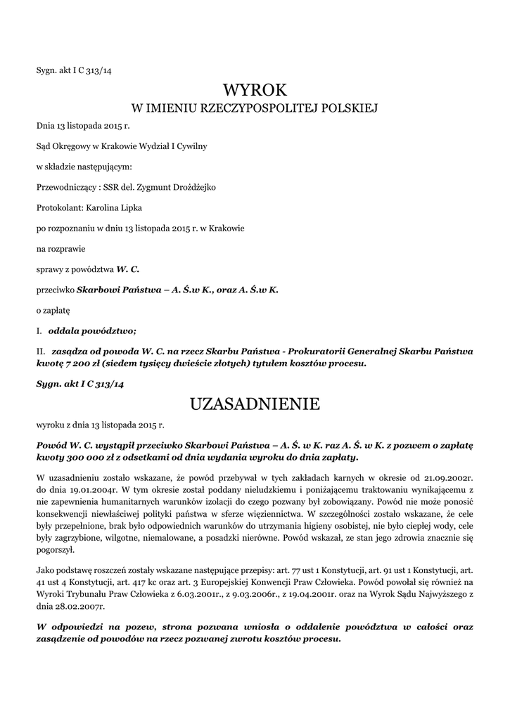 Sygn. akt I C 313/14 WYROK W IMIENIU RZECZYPOSPOLITEJ POLSKIEJ Dnia 13 listopada 2015 r. Sąd Okręgowy w Krakowie Wydział I Cywilny w składzie następującym: Przewodniczący : SSR del. Zygmunt Drożdżejko Protokolant: Karolina Lipka po rozpoznaniu w dniu 13 listopada 2015 r. w Krakowie na rozprawie sprawy z powództwa W. C. przeciwko Skarbowi Państwa – A. Ś.w K., oraz A. Ś.w K. o zapłatę I. oddala powództwo; II. zasądza od powoda W. C. na rzecz Skarbu Państwa - Prokuratorii Generalnej Skarbu Państwa kwotę 7 200 zł (siedem tysięcy dwieście złotych) tytułem kosztów procesu. Sygn. akt I C 313/14 UZASADNIENIE wyroku z dnia 13 listopada 2015 r. Powód W. C. wystąpił przeciwko Skarbowi Państwa – A. Ś. w K. raz A. Ś. w K. z pozwem o zapłatę kwoty 300 000 zł z odsetkami od dnia wydania wyroku do dnia zapłaty. W uzasadnieniu zostało wskazane, że powód przebywał w tych zakładach karnych w okresie od 21.09.2002r. do dnia 19.01.2004r. W tym okresie został poddany nieludzkiemu i poniżającemu traktowaniu wynikającemu z nie zapewnienia humanitarnych warunków izolacji do czego pozwany był zobowiązany. Powód nie może ponosić konsekwencji niewłaściwej polityki państwa w sferze więziennictwa. W szczególności zostało wskazane, że cele były przepełnione, brak było odpowiednich warunków do utrzymania higieny osobistej, nie było ciepłej wody, cele były zagrzybione, wilgotne, niemalowane, a posadzki nierówne. Powód wskazał, ze stan jego zdrowia znacznie się pogorszył. Jako podstawę roszczeń zostały wskazane następujące przepisy: art. 77 ust 1 Konstytucji, art. 91 ust 1 Konstytucji, art. 41 ust 4 Konstytucji, art. 417 kc oraz art. 3 Europejskiej Konwencji Praw Człowieka. Powód powołał się również na Wyroki Trybunału Praw Człowieka z 6.03.2001r., z 9.03.2006r., z 19.04.2001r. oraz na Wyrok Sądu Najwyższego z dnia 28.02.2007r. W odpowiedzi na pozew, strona pozwana wniosła o oddalenie powództwa w całości oraz zasądzenie od powodów na rzecz pozwanej zwrotu kosztów procesu. W uzasadnieniu zaprzeczono okolicznościom faktycznym podnoszonym przez powoda. Podniesiono zarzut przedawnienia. Wskazano również, że ewidencja zaludnienia cel prowadzona jest dopiero od sierpnia 2007r. Sam fakt przeludnienia nie stanowi o naruszeniu dóbr osobistych. Takie poglądy prezentuje Sąd najwyższy oraz Europejski Trybunał Praw Człowieka. Nie w każdej sytuacji naruszenia dóbr osobistych można domagać się zadośćuczynienia. Sąd ustalił następujący stan faktyczny: Powód W. C. w A. Ś. w K. przebywał w okresie 21.09.2002r. – 19.01.2004r. A. Ś. w K. był objęty wizytacjami prowadzonymi przez sędziego penitencjarnego. Jeżeli chodzi o warunki bytowe to kąciki sanitarne były zorganizowane w ten sposób, że można było z nich korzystać w sposób nieskrępowany. Wprawdzie nie były zamurowane w całości i była przerwa na dole i górze, ale można było korzystać w sposób nieskrępowany. Cele były odpowiednio wyposażone tak, że można było utrzymać czystość. Zapewniona była odpowiednia wentylacja. Nie we wszystkich celach była ciepła woda. Jednak prowadzono sukcesywnie remonty kolejnych cel mieszkalnych. W celach występowało przeludnienie, ale było to zjawiskiem obejmującym cały kraj, przy czym zakład karny podejmował wielopłaszczyznowe działania mające na celu zmniejszenia ilości osób przebywających w zakładzie karnym. Dowód: Informacje o pobytach i orzeczeniach k.46-49; Zestawienie cel w których przebywał powód oraz informacje dotyczące przeludnienia w celach k.36-45; Protokoły wizytacji A. Ś. k.50-80 Częściowo zeznania powoda k.108-109 W A. Ś. w K. powód przebywał w okresie od września 2003r. do stycznia 2004r. Przebywał tam w celi nr 9, która była przeludniona. Przebywało tam 12 osób. Generalnie w A. Ś. było przeludnienie. W celi nie było dostępu do ciepłej wody. Wodę można było podgrzewać w czajniku. Zapewnione były środki czystości. Nie można było mieć własnych lampek. Więźniowie roznoszący jedzenie nie mieli nakryć głowy i rękawiczek. Powód miał prywatne ubranie. Dowód: Informacje o pobytach i orzeczeniach k.46-49; Częściowo zeznania powoda k.152-153 Protokoły z okresowej kontroli przewodów kominowych k.130-131 Informacja o zaludnieniu k.132-133 Powód był karany za przestępstwa przeciwko życiu i zdrowiu, przeciwko wolności, przeciwko wolności seksualnej i obyczajności, przeciwko rodzinie, przeciwko wiarygodności dokumentów, przeciwko mieniu. Dowód: Informacje o pobytach i orzeczeniach k.46-49; Ocena dowodów: Sąd dał wiarę dokumentom zgromadzonym w sprawie w szczególności sąd dał wiarę protokołom wizytacyjnym. Są to dokumenty urzędowe. Zostały one sporządzone przez sędziego wizytatora, a więc osoba niezależną od administracji zakładu karnego i osoba ta nie miała żadnego interesu w podawaniu nieprawdy. Sąd nie dał wiary zeznaniom powoda w części w której odnosił się do warunków bytowych w zakładach karnych, a które nie znajdują potwierdzenia w protokołach wizytacyjnych. Zeznania w tym zakresie nie znajdują żadnego potwierdzenia w wiarygodnym materiale dowodowym. Sąd zważył, co następuje: Powództwo nie jest uzasadnione. Powód dochodził swoich roszczeń twierdząc, że przebywał w bardzo złych warunkach. Podstawę jego roszczeń stanowił art. 3 Europejskiej Konwencji Praw Człowieka z dnia 4.11.1950r. podpisanej w R., który stanowi, że nikt nie może być poddany torturom ani nieludzkiemu lub poniżającemu traktowaniu albo karaniu. Na tle tego artykułu kilkakrotnie wypowiadał się Europejski Trybunał Praw Człowieka. W swych orzeczeniach wskazał, że sposób nieludzkiego traktowania, by znaleźć się w zakresie regulacji art. 3 Konwencji, musi osiągnąć pewien minimalny poziom dolegliwości. Analogicznie jest w przypadku poniżającego traktowania. Ocena tego minimum jest relatywna; zale