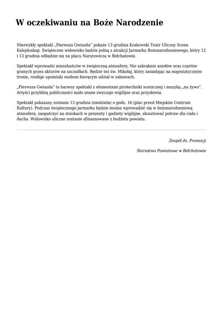 W oczekiwaniu na Boże Narodzenie Niezwykły spektakl „Pierwsza Gwiazda” pokaże 13 grudnia Krakowski Teatr Uliczny Scena Kalejdoskop. Świąteczne widowisko będzie jedną z atrakcji Jarmarku Bożonarodzeniowego, który 12 i 13 grudnia odbędzie się na placu Narutowicza w Bełchatowie. Spektakl wprowadzi mieszkańców w świąteczną atmosferę. Nie zabraknie aniołów oraz czartów granych przez aktorów na szczudłach. Będzie też św. Mikołaj, który zasiadając na majestatycznym tronie, rozdaje upominki osobom biorącym udział w zabawach. „Pierwsza Gwiazda” to barwny spektakl z elementami pirotechniki scenicznej i muzyką „na żywo”. Artyści przybliżą publiczności mało znane zwyczaje wigilijne oraz przysłowia. Spektakl pokazany zostanie 13 grudnia (niedziela) o godz. 16 (plac przed Miejskim Centrum Kultury). Podczas świątecznego jarmarku będzie można wprowadzić się w bożonarodzeniową atmosferę, zaopatrzyć na stoiskach w prezenty i gadżety wigilijne, skosztować potraw dla ciała i ducha. Widowisko uliczne zostanie sfinansowane z budżetu powiatu. Zespół ds. Promocji Starostwo Powiatowe w Bełchatowie