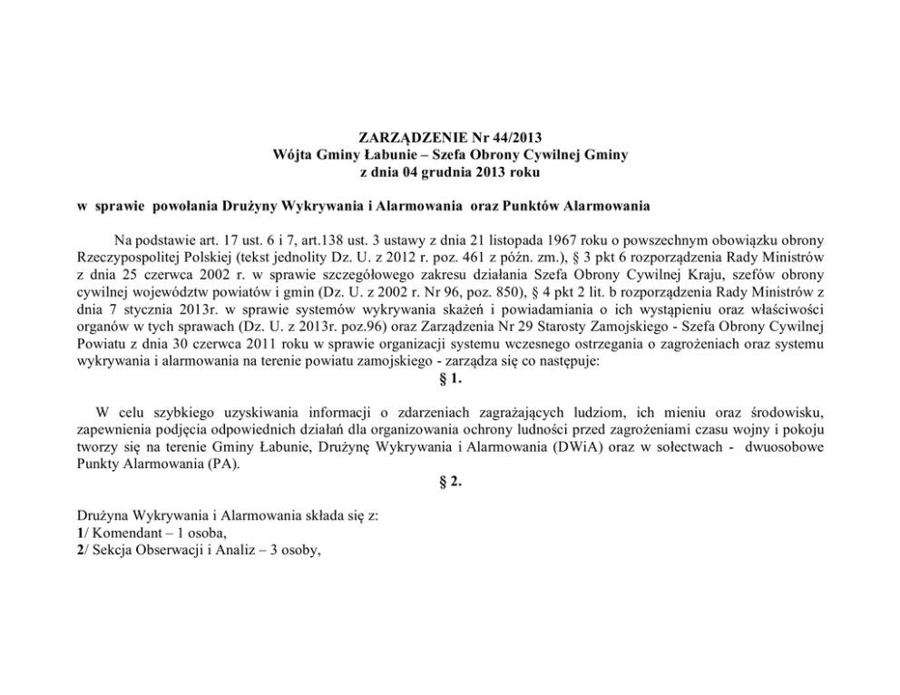 ZARZĄDZENIE Nr 44/2013 Wójta Gminy Łabunie – Szefa Obrony Cywilnej Gminy z dnia 04 grudnia 2013 roku w sprawie powołania Drużyny Wykrywania i Alarmowania oraz Punktów Alarmowania Na podstawie art. 17 ust. 6 i 7, art.138 ust. 3 ustawy z dnia 21 listopada 1967 roku o powszechnym obowiązku obrony Rzeczypospolitej Polskiej (tekst jednolity Dz. U. z 2012 r. poz. 461 z późn. zm.), § 3 pkt 6 rozporządzenia Rady Ministrów z dnia 25 czerwca 2002 r. w sprawie szczegółowego zakresu działania Szefa Obrony Cywilnej Kraju, szefów obrony cywilnej województw powiatów i gmin (Dz. U. z 2002 r. Nr 96, poz. 850), § 4 pkt 2 lit. b rozporządzenia Rady Ministrów z dnia 7 stycznia 2013r. w sprawie systemów wykrywania skażeń i powiadamiania o ich wystąpieniu oraz właściwości organów w tych sprawach (Dz. U. z 2013r. poz.96) oraz Zarządzenia Nr 29 Starosty Zamojskiego - Szefa Obrony Cywilnej Powiatu z dnia 30 czerwca 2011 roku w sprawie organizacji systemu wczesnego ostrzegania o zagrożeniach oraz systemu wykrywania i alarmowania na terenie powiatu zamojskiego - zarządza się co następuje: § 1. W celu szybkiego uzyskiwania informacji o zdarzeniach zagrażających ludziom, ich mieniu oraz środowisku, zapewnienia podjęcia odpowiednich działań dla organizowania ochrony ludności przed zagrożeniami czasu wojny i pokoju tworzy się na terenie Gminy Łabunie, Drużynę Wykrywania i Alarmowania (DWiA) oraz w sołectwach - dwuosobowe Punkty Alarmowania (PA). § 2. Drużyna Wykrywania i Alarmowania składa się z: 1/ Komendant – 1 osoba, 2/ Sekcja Obserwacji i Analiz – 3 osoby, 3/ Sekcja Łączności i Alarmowania – 2 osoby, 4/ Sekcja Rozpoznania - 2 osób, § 3. 1. Rozwinięcie Drużyny Wykrywania i Alarmowania następuje w przypadku wystąpienia zagrożenia, klęsk żywiołowych lub podczas przeprowadzania ćwiczeń i treningów. 2. Podstawą do rozwinięcia Drużyny Wykrywania i Alarmowania jest zarządzenie wydane przez: 1) Wojewodę – Szefa OC województwa w stosunku do obszaru województwa, 2) Starostę – Szefa OC powiatu w stosunku do obszaru powiatu, 3) Wójta Gminy – Szefa OC gminy w stosunku do obszaru gminy. § 4. 1. Drużyna Wykrywania i Alarmowania bierze udział w krajowych, wojewódzkich i powiatowych treningach systemu wykrywania i alarmowania celem zapewnienia sprawnego jej funkcjonowania. 2. Przekazywanie informacji odbywa się za pośrednictwem dostępnych środków łączności. § 7. Wyposażenie Drużyny Wykrywania i Alarmowania w sprzęt umundurowanie zabezpieczy pracownik ds. obrony cywilnej, wg potrzeb i obowiązujących norm. § 8. Za stan organizacyjny i gotowość do działania Drużyny Wykrywania i Alarmowania odpowiedzialny jest Komendant tej formacji. § 9. Strukturę organizacyjną DWiA oraz zasady działania określa załącznik do zarządzenia. § 10. Zarządzenie wchodzi w życie z dniem podpisania. Załącznik do zarządzenia Nr 44/2013 Wójta Gminy Łabunie – Szefa OC Gminy z dnia 04.12.2013r. URZĄD GMINY ŁABUNIE ZATWIERDZAM ................................................... PLAN DZIAŁANIA DRUŻYNY WYKRYWANIA I ALARMOWANIA W ŁABUNIACH Łabunie, 2013r I. PRZEZNACZENIE DRUŻYNY WYKRYWANIA I ALARMOWANIA Drużyna przeznaczona jest do wykrywania zagrożeń oraz ostrzegania i alarmowania ludności oraz uprzedzania ludności o grożącym niebezpieczeństwie uderzeń z powietrza, skażeniach promieniotwórczych, chemicznych, awariach w zakładach pracy posiadających toksyczne środki przemysłowe oraz zakażeniach biologicznych. Drużyną kieruje Komendant DWiA zgodnie z zarządzeniem Szefa Obrony Cywilnej Gminy Łabunie. W okresie pokojowym członkowie DWiA odbywają ćwiczenia i szkolenia w formie treningów, w których szkolą się w zakresie ostrzegania i alarmowania oraz uprzedzania ludności o zagrożeniach. Szkolenie odbywa się zgodnie z obowiązującym planem szkolenia w ramach obowiązujących przepisów prawnych. W razie ogłoszenia mobilizacji i w czasie wojny oraz w okresie obowiązywania stanu wojennego, osoby wchodzące w skład drużyny są zobowiązane do natychmiastowego stawienia się do komendanta DWiA w pomieszczeniu świetlicy UG w celu pełnienia czynnej służby wojskowej. II. ZADANIA SEKCJI ALARMOWANIA 1. Ogłaszanie i odwoływanie alarmów dotyczących uderzeń z powietrza, skażeń promieniotwórczych, chemicznych skażeń TSP i zakażeń biologicznych oraz dotyczących klęsk żywiołowych. 2. Rozpowszechnianie komunikatów ostrzegawczych o grożącym niebezpieczeństwie uderzeń z powietrza, skażeniach promieniotwórczych i chemicznych, zakażeniach biologicznych oraz dotyczących klęsk żywiołowych. 3. Przekazywanie decyzji o alarmowaniu do ogniw systemu alarmowego zgodnie z załączonym wykazem. 4. Ciągła znajomość sytuacji alarmowej na terenie gminy. 5. Dokładna znajomość planu alarmowania gminy oraz możliwości wykorzystania środków łączności do celów alarmowania. 6. Utrzymywanie ciągłej współpracy z elementami alarmowania powiatu /POADA/ i gmin sąsiednich 7. Utrzymywanie w należytej sprawności urządzeń i systemów alarmowych. III. ORGANIZACJA OSIĄGANIA WYŻSZYCH STANÓW GOTOWOŚCI PRZEZ DRUŻYNĘ WYKRYWANIA I ALARMOWANIA W czasie pokoju drużyna odbywa ćwiczenia i szkolenia . W razie ogłoszenia mobilizacji i w czasie wojny oraz w czasie obowiązywania stanu wojennego drużyna przechodzi w stan służby czynnej. Pełnienie służby czynnej polega na stałej gotowości osób wchodzących w skład DWiA i niezwłocznego stawienia się na każde wezwanie przełożonych, oraz wykonywanie zadań wynikających z przeznaczenia drużyny. Zarówno w czasie pokoju jak i po ogłoszeniu mobilizacji, w okresie wojny oraz w czasie obowiązywania stanu kęski żywiołowej, rejonem zbiórki stanu osobowego są pomieszczeniu świetlicy UG. Prawo zarządzania alarmu dla sekcji mają: - Komendant DWA - Szef Obrony Cywilnej Gminy i osoby przez niego upoważnione Powiadomienie drużyny odbywa si