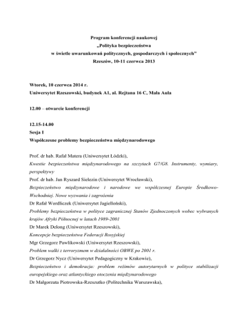 Program konferencji naukowej „Polityka bezpieczeństwa w świetle uwarunkowań politycznych, gospodarczych i społecznych” Rzeszów, 10-11 czerwca 2013 Wtorek, 10 czerwca 2014 r. Uniwersytet Rzeszowski, budynek A1, al. Rejtana 16 C, Mała Aula 12.00 – otwarcie konferencji 12.15-14.00 Sesja I Współczesne problemy bezpieczeństwa międzynarodowego Prof. dr hab. Rafał Matera (Uniwersytet Łódzki), Kwestie bezpieczeństwa międzynarodowego na szczytach G7/G8. Instrumenty, wymiary, perspektywy Prof. dr hab. Jan Ryszard Sielezin (Uniwersytet Wrocławski), Bezpieczeństwo międzynarodowe i narodowe we współczesnej Europie ŚrodkowoWschodniej. Nowe wyzwania i zagrożenia Dr Rafał Wordliczek (Uniwersytet Jagielloński), Problemy bezpieczeństwa w polityce zagranicznej Stanów Zjednoczonych wobec wybranych krajów Afryki Północnej w latach 1989-2001 Dr Marek Delong (Uniwersytet Rzeszowski), Koncepcje bezpieczeństwa Federacji Rosyjskiej Mgr Grzegorz Pawlikowski (Uniwersytet Rzeszowski), Problem walki z terroryzmem w działalności OBWE po 2001 r. Dr Grzegorz Nycz (Uniwersytet Pedagogiczny w Krakowie), Bezpieczeństwo i demokracja: problem reżimów autorytarnych w polityce stabilizacji europejskiego oraz atlantyckiego otoczenia międzynarodowego Dr Małgorzata Piotrowska-Rzeszutko (Politechnika Warszawska), Prawo nieszkodliwego przepływu okrętów wojennych przez morze terytorialne – analiza z uwzględnieniem aspektów bezpieczeństwa międzynarodowego 14.00-15.00 – przerwa na obiad 15.00-16.30 Sesja II Polityka bezpieczeństwa Unii Europejskiej i państw członkowskich Prof. dr Oksana Krayevska (Uniwersytet Lwowski), Ukraine and the EU: problems and perspectives of relations in the context of modern geopolitical situation in Europe Dr Piotr Bajor (Uniwersytet Jagielloński), Wyzwania i problemy bezpieczeństwa energetycznego UE Dr Mariusz Ruszel (Politechnika Rzeszowska), Bezpieczeństwo energetyczne Polski na wspólnym rynku energii UE Dr Izabela Oleksiewicz (Politechnika Rzeszowska), Polityka antyterrorystyczna Wielkiej Brytanii na tle standardów Unii Europejskiej Dr Paweł Korzeniowski (Uniwersytet Rzeszowski), Reforma Niemieckich Sił Zbrojnych w świetle nowych wyzwań w sferze bezpieczeństwa międzynarodowego Dr Anna Paterek (Akademia Frycza Modrzewskiego Kraków), Pomoc rozwojowa jako instrument niemieckiej polityki bezpieczeństwa w obliczu wyzwań XXI wieku 16.30-16.45 – przerwa kawowa 16.45-18.15 Sesja III Problemy bezpieczeństwa w Europie Środkowej i Wschodniej Dr Adam Kulczycki (Uniwersytet Rzeszowski), Dominacja rosyjska na obszarze postradzieckim a bezpieczeństwo w Euroregionie Karpackim (polityka bezpieczeństwa w warunkach integracji europejskiej) Prof. dr hab. Natalia Antoniuk (Uniwersytet Lwowski), Kontekst społeczny polityki bezpieczeństwa Ukrainy – problemy narodowościowe Dr Igor Izhnin (Uniwersytet Lwowski), Destruction of the global security system in the early twenty-first century Doc. dr Marianna Gladysh (Uniwersytet Lwowski), The role of Ukraine in Baltic-Black Sea region: political and security aspects Doc. dr Rostyslav Romanyuk (Uniwersytet Lwowski), Rekonceptualizacja bezpieczeństwa międzynarodowego Ukrainy w ujęciu teoretycznym Dr Andrzej Zapałowski (Uniwersytet Rzeszowski), Współpraca Mołdawii z Unią Europejską i jej wpływ na bezpieczeństwo europejskie Dr Krzysztof Żarna (Uniwersytet Rzeszowski), "Szara strefa bezpieczeństwa". Sytuacja geopolityczna Republiki Słowackiej w latach 19931998 19.30 – uroczysta kolacja (Restauracja Hotelu Icam) Środa, 11 czerwca 2014 r. Uniwersytet Rzeszowski, budynek A2, ul. mjr. W. Kopisto 2a, s. 346 9.30 – 11.15 Sesja IV Wybrane aspekty polityki bezpieczeństwa Rzeczypospolitej Polskiej Prof. dr hab. Ewa Orlof (Uniwersytet Rzeszowski), Sprawa bezpieczeństwa polskiej granicy południowej (na odcinku słowackim) w 1939 roku w ocenach dyplomatów II Rzeczypospolitej Prof. dr hab. Włodzimierz Bonusiak (Uniwersytet Rzeszowski), Polityka bezpieczeństwa Rzeczypospolitej Polskiej po 1989 roku Prof. dr hab. Andrzej Żebrowski (Uniwersytet Pedagogiczny w Krakowie), Bezpieczeństwo Polski w zmieniającym się środowisku międzynarodowym na początku XXI wieku – wybrane aspekty Dr Sabina Olszyk (Uniwersytet Pedagogiczny w Krakowie), Zagrożenia i wyzwania polityki bezpieczeństwa Polski w świetle „Strategii Rozwoju Systemu Bezpieczeństwa Narodowego Rzeczypospolitej Polskiej 2022” z 2013 roku Mgr Paweł Rybarczyk (Uniwersytet Wrocławski), Bezpieczeństwo Polski w kontekście doświadczenia bojowego zdobytego podczas współpracy i działań integralnych komponentów sił międzynarodowych 11.15-11.30 – przerwa kawowa 11.30 – 12.45 Sesja V Problemy bezpieczeństwa ekonomicznego Dr Andrzej Pieczewski (Uniwersytet Łódzki), Wpływ I wojny światowej na gospodarkę i stosunki społeczne w Rosji. Rzeczywistość a predykcje Jana Blocha Prof. dr hab. Mirosław Kłusek (Uniwersytet Rolniczy w Krakowie), Dekret o zaciąganiu nowych i określaniu nieumorzonych zobowiązań pieniężnych z 27 lipca 1949 r. a bezpieczeństwo finansowe państwa Dr Kamil Kowalski (Uniwersytet Łódzki), Widmo ekonomicznej katastrofy czy strach przed komunizmem? Motywy Planu Marshalla w świetle amerykańskich dokumentów Prof. dr hab. Sławomir Kamosiński (Uniwersytet Kazimierza Wielkiego w Bydgoszczy), Przedsiębiorstwo w okresie transformacji: ochrona technologii produkcji, know-how i bezpieczeństwo socjalne załogi. Analiza mikroekonomiczna Dr Arkadiusz Machniak (Przeworsk), Agencja Bezpieczeństwa Wewnętrznego wobec zagrożeń godzących ekonomicznego bezpieczeństwa państwa Dr Mira Malczyńska-Biały (Uniwersytet Rzeszowski), Prawo konsumentów do bezpieczeństwa – wybrane aspekty społeczno-prawne 12.45-13.00 – przerwa kawowa 13.00-14.30 Sesja VI Polityka bezpieczeństwa w wymiarze wewnętrznym Dr Tomasz Szyszlak (Uniwersytet Wrocławski), Strategie europejskich policji wobec wielokulturowości sp