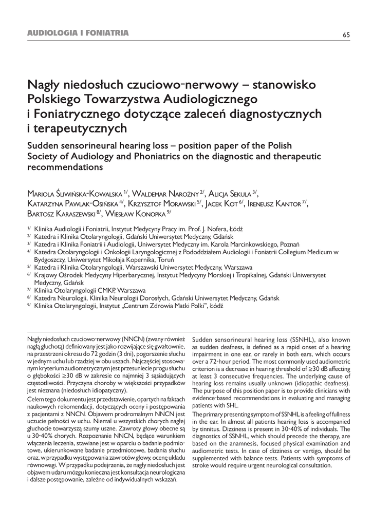 Audiologia Śliwińska-Kowalska iMfoniatria i wsp. Nagły niedosłuch czuciowo-nerwowy – stanowisko Polskiego Towarzystwa Audiol ... 65 Nagły niedosłuch czuciowo-nerwowy – stanowisko Polskiego Towarzystwa Audiologicznego i Foniatrycznego dotyczące zaleceń diagnostycznych i terapeutycznych Sudden sensorineural hearing loss – position paper of the Polish Society of Audiology and Phoniatrics on the diagnostic and therapeutic recommendations Mariola Śliwińska-Kowalska 1/, Waldemar Narożny 2/, Alicja Sekula 3/, Katarzyna Pawlak-Osińska 4/, Krzysztof Morawski 5/, Jacek Kot 6/, Ireneusz Kantor 7/, Bartosz Karaszewski 8/, Wiesław Konopka 9/ 3/ 4/ 1/ 2/ 5/ 6/ 9/ 7/ 8/ Klinika Audiologii i Foniatrii, Instytut Medycyny Pracy im. Prof. J. Nofera, Łódź Katedra i Klinika Otolaryngologii, Gdański Uniwersytet Medyczny, Gdańsk Katedra i Klinika Foniatrii i Audiologii, Uniwersytet Medyczny im. Karola Marcinkowskiego, Poznań Katedra Otolaryngologii i Onkologii Laryngologicznej z Pododdziałem Audiologii i Foniatrii Collegium Medicum w Bydgoszczy, Uniwersytet Mikołaja Kopernika, Toruń Katedra i Klinika Otolaryngologii, Warszawski Uniwersytet Medyczny, Warszawa Krajowy Ośrodek Medycyny Hiperbarycznej, Instytut Medycyny Morskiej i Tropikalnej, Gdański Uniwersytet Medyczny, Gdańsk Klinika Otolaryngologii CMKP, Warszawa Katedra Neurologii, Klinika Neurologii Dorosłych, Gdański Uniwersytet Medyczny, Gdańsk Klinika Otolaryngologii, Instytut „Centrum Zdrowia Matki Polki”, Łódź Nagły niedosłuch czuciowo-nerwowy (NNCN) (zwany również nagłą głuchotą) definiowany jest jako rozwijające się gwałtownie, na przestrzeni okresu do 72 godzin (3 dni), pogorszenie słuchu w jednym uchu lub rzadziej w obu uszach. Najczęściej stosowanym kryterium audiometrycznym jest przesuniecie progu słuchu o głębokości ≥30 dB w zakresie co najmniej 3 sąsiadujących częstotliwości. Przyczyna choroby w większości przypadków jest nieznana (niedosłuch idiopatyczny). Celem tego dokumentu jest przedstawienie, opartych na faktach naukowych rekomendacji, dotyczących oceny i postępowania z pacjentami z NNCN. Objawem prodromalnym NNCN jest uczucie pełności w uchu. Niemal u wszystkich chorych nagłej głuchocie towarzyszą szumy uszne. Zawroty głowy obecne są u 30-40% chorych. Rozpoznanie NNCN, będące warunkiem włączenia leczenia, stawiane jest w oparciu o badanie podmiotowe, ukierunkowane badanie przedmiotowe, badania słuchu oraz, w przypadku występowania zawrotów głowy, ocenę układu równowagi. W przypadku podejrzenia, że nagły niedosłuch jest objawem udaru mózgu konieczna jest konsultacja neurologiczna i dalsze postępowanie, zależne od indywidualnych wskazań. Sudden sensorineural hearing loss (SSNHL), also known as sudden deafness, is defined as a rapid onset of a hearing impairment in one ear, or rarely in both ears, which occurs over a 72-hour period. The most commonly used audiometric criterion is a decrease in hearing threshold of ≥30 dB affecting at least 3 consecutive frequencies. The underlying cause of hearing loss remains usually unknown (idiopathic deafness). The purpose of this position paper is to provide clinicians with evidence-based recommendations in evaluating and managing patients with SHL. The primary presenting symptom of SSNHL is a feeling of fullness in the ear. In almost all patients hearing loss is accompanied by tinnitus. Dizziness is present in 30-40% of individuals. The diagnostics of SSNHL, which should precede the therapy, are based on the anamnesis, focused physical examination and audiometric tests. In case of dizziness or vertigo, should be supplemented with balance tests. Patients with symptoms of stroke would require urgent neurological consultation. 66 Terapią I rzutu jest kortykosteroidoterapia ogólna, stosowana bezzwłocznie po wystąpieniu objawów, nie później niż w ciągu pierwszych 14 dni. Przez pierwsze 7-14 dni leki podawane są w dawce uderzeniowej, a następnie w dawkach zmniejszających się przez podobnie długi okres czasu. Kortykosteroidoterapia dobębenkowa stosowana jest u chorych, u których nie uzyskano poprawy po leczeniu ogólnym (tzw. „leczenie ratunkowe”) lub alternatywnie w stosunku do kortykosteroidów doustnych jako leczenie I rzutu. Działanie wspomagające może mieć hyperbaria tlenowa, zwłaszcza gdy włączona jest w okresie pierwszych 2 tygodni od początku wystąpienia NNCN. Nie zalecane jest natomiast rutynowe stosowanie innych leków niż kortykosteroidy, w tym leków przeciwwirusowych, trombolitycznych, poprawiających krążenie, substancji wazoaktywnych czy antyoksydacyjnych, ze względu na brak dowodów na ich skuteczność i możliwe objawy uboczne. W 1/3 do 2/3 części przypadków NNCN może ulec spontanicznej poprawie. Słowa kluczowe: głuchota, kortykosteroidoterapia, leczenie dobębenkowe, hyperbaria tlenowa, guz kąta mostowomóżdżkowego Otorynolaryngologia 2015, 14(2): 65-73 Systemic corticosteroids are recommended as the first-line therapy, which is to be implemented immediately after the onset of the disease and no later than 14 days after it. Initial full doses of corticosteroids should be administered for 7 to 14 days, and should then be decreased over a similar period. Intratympanic corticosteroids can be used in patients who do not recover with systemic corticosteroids (“salvage therapy”) or as an initial alternative treatment. Hyperbaric oxygen therapy can be beneficial in some patients, if implemented within 14 days from the onset of SSNHL. No other drugs than corticosteroids, including antivirals, thrombolytics, vasodilators, vasoactive substances or antioxidants, should be routinely recommended to patients with idiopathic SSNHL due to a lack of documented efficacy and potential side effects. A 1/3 to 2/3 of cases of SSNHL may recover spontaneously. Key words: deafness, corticosteroidotherapy, intratympanic treatment, hyperbaric oxygen therapy, acoustic neuroma