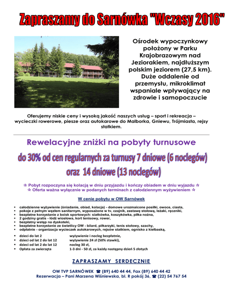 Ośrodek wypoczynkowy położony w Parku Krajobrazowym nad Jeziorakiem, najdłuższym polskim jeziorem (27,5 km). Duże oddalenie od przemysłu, mikroklimat wspaniale wpływający na zdrowie i samopoczucie Oferujemy niskie ceny i wysoką jakość naszych usług – sport i rekreacja – wycieczki rowerowe, piesze oraz autokarowe do Malborka, Gniewu, Trójmiasta, rejsy statkiem. Rewelacyjne zniżki na pobyty turnusowe Pobyt rozpoczyna się kolacją w dniu przyjazdu i kończy obiadem w dniu wyjazdu Oferta ważna wyłącznie w podanych terminach z całodziennym wyżywieniem W cenie pobytu w OW Sarnówek całodzienne wyżywienie (śniadanie, obiad, kolacja) - domowe urozmaicone posiłki, owoce, ciasta, pokoje z pełnym węzłem sanitarnym, wyposażone w tv, czajnik, zastawę stołową, leżaki, ręczniki, bezpłatne korzystanie z boisk sportowych: siatkówka, koszykówka, piłka nożna, 2 godziny gratis - łódź wiosłowa, kort tenisowy, rower, bezpłatny wstęp na dyskoteki, bezpłatne korzystanie ze świetlicy OW - bilard, piłkarzyki, tenis stołowy, szachy, odpłatnie - organizacja wycieczek autokarowych, rejsów statkiem, ognisko z kiełbaską, dzieci do lat 2 dzieci od lat 2 do lat 12 dzieci od lat 2 do lat 12 Opłata za zwierzęta wyżywienie i nocleg bezpłatnie, wyżywienie 24 zł (50% stawki), nocleg 30 zł, 1-3 dni - 50 zł, za każdy następny dzień 5 złotych ZAPRASZAMY SERDECZNIE OW TVP SARNÓWEK (89) 640 44 44, Fax (89) 640 44 42 Rezerwacja – Pani Marzena Wiśniewska, bl. R pokój 36, (22) 54 767 54 Pawilon "Nowy" Terminy i ceny turnusów 7 dniowych terminy turnusów turnusy 7 dniowe (6 noclegów) ceny regularne 1 os. w pokoju 1 os. cena z całodziennym wyżywieniem – 1 dzień pobytu 110 zł 660,00 2 os. w pokoju 2 os. cena z całodziennym wyżywieniem – 1 dzień pobytu 110 zł 1 320,00 25.06 - 01.07 3 os. w pokoju 3 os. cena z całodziennym wyżywieniem – 1 dzień pobytu 105 zł 1 890,00 4 os. w pokoju 4 os. cena z całodziennym wyżywieniem – 1 dzień pobytu 105 zł 2 520,00 5 os. w pokoju 5 os. cena z całodziennym wyżywieniem – 1 dzień pobytu 105 zł 3 150,00 09.07 - 15.07 1 os. w pokoju 1 os. cena z całodziennym wyżywieniem – 1 dzień pobytu 110 zł 660,00 1 320,00 1 890,00 2 520,00 3 150,00 ceny ze zniżką 627,00 1 254,00 1 795,50 2 394,00 2 992,50 02.07 - 08.07 16.07 - 22.07 2 os. w pokoju 2 os. cena z całodziennym wyżywieniem – 1 dzień pobytu 110 zł 23.07 - 29.07 3 os. w pokoju 3 os. cena z całodziennym wyżywieniem – 1 dzień pobytu 105 zł 30.07 - 05.08 4 os. w pokoju 4 os. cena z całodziennym wyżywieniem – 1 dzień pobytu 105 zł 06.08 - 12.08 5 os. w pokoju 5 os. cena z całodziennym wyżywieniem – 1 dzień pobytu 105 zł brak zniżek 13.08 - 19.08 1 os. w pokoju 1 os. cena z całodziennym wyżywieniem – 1 dzień pobytu 110 zł 660,00 2 os. w pokoju 2 os. cena z całodziennym wyżywieniem – 1 dzień pobytu 110 zł 1 320,00 20.08 - 26.08 3 os. w pokoju 3 os. cena z całodziennym wyżywieniem – 1 dzień pobytu 105 zł 1 890,00 4 os. w pokoju 4 os. cena z całodziennym wyżywieniem – 1 dzień pobytu 105 zł 2 520,00 5 os. w pokoju 5 os. cena z całodziennym wyżywieniem – 1 dzień pobytu 105 zł 1 os. w pokoju 1 os. cena z całodziennym wyżywieniem – 1 dzień pobytu 110 zł 3 150,00 660,00 27.08 - 02.09 2 os. w pokoju 2 os. cena z całodziennym wyżywieniem – 1 dzień pobytu 110 zł 1 320,00 03.09 - 09.09 3 os. w pokoju 3 os. cena z całodziennym wyżywieniem – 1 dzień pobytu 105 zł 1 890,00 4 os. w pokoju 4 os. cena z całodziennym wyżywieniem – 1 dzień pobytu 105 zł 2 520,00 5 os. w pokoju 5 os. cena z całodziennym wyżywieniem – 1 dzień pobytu 105 zł 3 150,00 528,00 1 056,00 1 512,00 2 016,00 2 520,00 462,00 924,00 1 323,00 1 764,00 2 205,00 Pawilon "Nowy" Terminy i ceny turnusów 14 dniowych terminy turnusów turnusy 14 dniowe (13 noclegów) ceny regularne 1 os. w pokoju 1 os. cena z całodziennym wyżywieniem – 1 dzień pobytu 110 zł 1 430,00 2 os. w pokoju 2 os. cena z całodziennym wyżywieniem – 1 dzień pobytu 110 zł 2 860,00 25.06 - 08.07 3 os. w pokoju 3 os. cena z całodziennym wyżywieniem – 1 dzień pobytu 105 zł 4 095,00 4 os. w pokoju 4 os. cena z całodziennym wyżywieniem – 1 dzień pobytu 105 zł 5 460,00 5 os. w pokoju 5 os. cena z całodziennym wyżywieniem – 1 dzień pobytu 105 zł 6 825,00 1 os. w pokoju 1 os. cena z całodziennym wyżywieniem – 1 dzień pobytu 110 zł 5 os. w pokoju 5 os. cena z całodziennym wyżywieniem – 1 dzień pobytu 105 zł 1 430,00 2 860,00 4 095,00 5 460,00 6 825,00 1 os. w pokoju 1 os. cena z całodziennym wyżywieniem – 1 dzień pobytu 110 zł 1 430,00 20.08 - 02.09 2 os. w pokoju 2 os. cena z całodziennym wyżywieniem – 1 dzień pobytu 110 zł 2 860,00 03.09 - 16.09 3 os. w pokoju 3 os. cena z całodziennym wyżywieniem – 1 dzień pobytu 105 zł 4 095,00 17.09 - 30.09 4 os. w pokoju 4 os. cena z całodziennym wyżywieniem – 1 dzień pobytu 105 zł 5 460,00 5 os. w pokoju 5 os. cena z całodziennym wyżywieniem – 1 dzień pobytu 105 zł 6 825,00 09.07 - 22.07 2 os. w pokoju 2 os. cena z całodziennym wyżywieniem – 1 dzień pobytu 110 zł 23.07 - 05.08 3 os. w pokoju 3 os. cena z całodziennym wyżywieniem – 1 dzień pobytu 105 zł 06.08 - 19.08 4 os. w pokoju 4 os. cena z całodziennym wyżywieniem – 1 dzień pobytu 105 zł ceny ze zniżką 1 287,00 2 574,00 3 685,50 4 914,00 5 460,00 brak zniżek 1 001,00 2 002,00 2 866,50 3 822,00 4 777,50 Pawilon „Zielony” Terminy i ceny turnusów 7 dniowych terminy turnusów turnus 7 dniowy (6 noclegów) ceny regularne ceny ze zniżką 25.06 - 01.07 02.07 - 08.07 09.07 - 15.07 16.07 - 22.07 1 os. w pokoju 1 os. cena z całodziennym wyżywieniem – 1 dzień pobytu 98 zł 588,00 23.07 - 29.07 2 os. w pokoju 2 os. cena z całodziennym wyżywieniem – 1 dzień pobytu 89 zł 1 068,00 30.07 - 05.08 3 os. w pokoju 3 os. cena z całodziennym wyżywieniem – 1 dzień pobytu 89 zł 1 