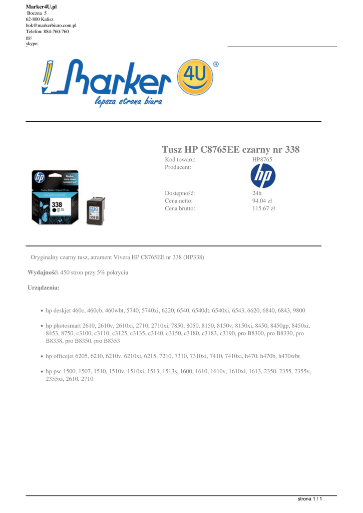 Marker4U.pl Boczna 5 62-800 Kalisz [email protected] Telefon: 884-760-760 gg: skype: Tusz HP C8765EE czarny nr 338 Kod towaru: Producent: HP8765 Dostępność: Cena netto: Cena brutto: 24h 94.04 zł 115.67 zł Oryginalny czarny tusz, atrament Vivera HP C8765EE nr 338 (HP338) Wydajność: 450 stron przy 5% pokryciu Urządzenia: hp deskjet 460c, 460cb, 460wbt, 5740, 5740xi, 6220, 6540, 6540dt, 6540xi, 6543, 6620, 6840, 6843, 9800 hp photosmart 2610, 2610v, 2610xi, 2710, 2710xi, 7850, 8050, 8150, 8150v, 8150xi, 8450, 8450gp, 8450xi, 8453, 8750, c3100, c3110, c3125, c3135, c3140, c3150, c3180, c3183, c3190, pro B8300, pro B8330, pro B8338, pro B8350, pro B8353 hp officejet 6205, 6210, 6210v, 6210xi, 6215, 7210, 7310, 7310xi, 7410, 7410xi, h470, h470b, h470wbt hp psc 1500, 1507, 1510, 1510v, 1510xi, 1513, 1513s, 1600, 1610, 1610v, 1610xi, 1613, 2350, 2355, 2355v, 2355xi, 2610, 2710 strona 1 / 1 Powered by TCPDF (www.tcpdf.org)