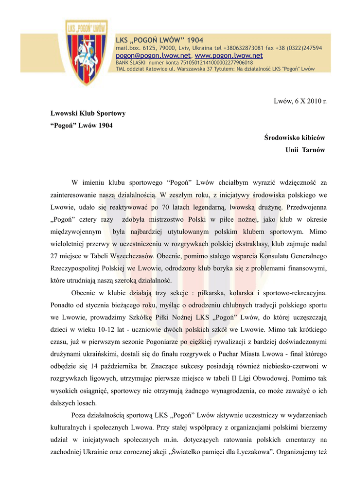 LKS „POGOŃ LWÓW” 1904 mail.box. 6125, 79000, Lviv, Ukraina tel +380632873081 fax +38 (0322)247594 [email protected], www.pogon.lwow.net BANK ŚLASKI numer konta 75105012141000002277906018 TML oddział Katowice ul. Warszawska 37 Tytułem: Na działalność LKS "Pogoń" Lwów Lwów, 6 X 2010 r. Lwowski Klub Sportowy “Pogoń” Lwów 1904 Środowisko kibiców Unii Tarnów W imieniu klubu sportowego “Pogoń” Lwów chciałbym wyrazić wdzięczność za zainteresowanie naszą działalnością. W zeszłym roku, z inicjatywy środowiska polskiego we Lwowie, udało się reaktywować po 70 latach legendarną, lwowską drużynę. Przedwojenna „Pogoń” cztery razy międzywojennym zdobyła mistrzostwo Polski w piłce nożnej, jako klub w okresie była najbardziej utytułowanym polskim klubem sportowym. Mimo wieloletniej przerwy w uczestniczeniu w rozgrywkach polskiej ekstraklasy, klub zajmuje nadal 27 miejsce w Tabeli Wszechczasów. Obecnie, pomimo stałego wsparcia Konsulatu Generalnego Rzeczypospolitej Polskiej we Lwowie, odrodzony klub boryka się z problemami finansowymi, które utrudniają naszą szeroką działalność. Obecnie w klubie działają trzy sekcje : piłkarska, kolarska i sportowo-rekreacyjna. Ponadto od stycznia bieżącego roku, myśląc o odrodzeniu chlubnych tradycji polskiego sportu we Lwowie, prowadzimy Szkółkę Piłki Nożnej LKS „Pogoń” Lwów, do której uczęszczają dzieci w wieku 10-12 lat - uczniowie dwóch polskich szkół we Lwowie. Mimo tak krótkiego czasu, już w pierwszym sezonie Pogoniarze po ciężkiej rywalizacji z bardziej doświadczonymi drużynami ukraińskimi, dostali się do finału rozgrywek o Puchar Miasta Lwowa - finał którego odbędzie się 14 października br. Znaczące sukcesy posiadają również niebiesko-czerwoni w rozgrywkach ligowych, utrzymując pierwsze miejsce w tabeli II Ligi Obwodowej. Pomimo tak wysokich osiągnięć, sportowcy nie otrzymują żadnego wynagrodzenia, co może zaważyć o ich dalszych losach. Poza działalnością sportową LKS „Pogoń” Lwów aktywnie uczestniczy w wydarzeniach kulturalnych i społecznych Lwowa. Przy stałej współpracy z organizacjami polskimi bierzemy udział w inicjatywach społecznych m.in. dotyczących ratowania polskich cmentarzy na zachodniej Ukrainie oraz corocznej akcji „Światełko pamięci dla Łyczakowa”. Organizujemy też otwarte rajdy kolarskie „Śladami historii”, w trakcie których odwiedzamy polskie miejsca pamięci. Zależy nam też na rozpowszechnianiu wiedzy o bogatych tradycjach lwowskiego sportu, czego owocem była już konferencja „Kresowo-galicyjskie korzenie sportu polskiego”. Dbając o integracje polskiego środowiska na zachodniej Ukrainie, wspólnie z Konsulatem Generalnym RP we Lwowie, organizowaliśmy Pierwszy Wiosenny Turniej Piłki Nożnej o Puchar Konsula Generalnego, w którym uczestniczyło sześć polskich drużyn reprezentujących polskie placówki w obwodzie lwowskim. W związku z dużym zainteresowaniem wyżej wspomnianego turnieju, chcemy wystąpić z inicjatywą utworzenia polskiej ligi na zachodniej Ukrainie. Nie da się ukryć, że na przeszkodzie rozwojowi odrodzonego klubu stoi szereg problemów, w tym przede wszystkim: • niestabilność finansowa • brak doświadczenia kadry menadżerskiej oraz trenerskiej • brak własnego boiska oraz hali sportowej • brak profesjonalnego sprzętu sportowego • brak odpowiedniego wyposażenia nowootwartego biura • brak własnego środka transportu Zważywszy na szereg inicjatyw, które udało nam się realizować w tym roku chcielibyśmy zaoferować Państwu szeroką współpracę w zakresie inicjatyw sportowo- kulturalnych. Będziemy wdzięczni też za wszelkie możliwe wsparcie naszych działań. Wierzymy, że wspólnymi siłami uda się odrodzić świetność bogatych tradycji przedwojennego klubu. Z wyrazami szacunku i nadzieją na Państwa przychylność do naszej sprawy: Prezes LKS „Pogoń” Lwów Marek Horbań