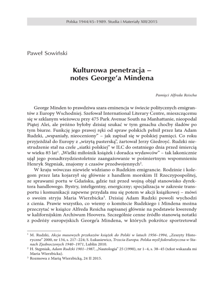 Polska 1944/45–1989. Studia i Materiały XIII/2015 Paweł Sowiński Kulturowa penetracja – notes George’a Mindena Pamięci Alfreda Reischa George Minden to prawdziwa szara eminencja w świecie politycznych emigrantów z Europy Wschodniej. Szefował International Literary Centre, mieszczącemu się w szklanym wieżowcu przy 475 Park Avenue South na Manhattanie, nieopodal Piątej Alei, ale próżno byłoby dzisiaj szukać w tym gmachu choćby śladów po tym biurze. Funkcję jego prawej ręki od spraw polskich pełnił przez lata Adam Rudzki, „wspaniały, nieoceniony” – jak zapisał się w polskiej pamięci. Co roku przyjeżdżał do Europy z „wizytą pasterską”, żartował Jerzy Giedroyć. Rudzki niestrudzenie stał na czele „siatki polskiej” w ILC do ostatniego dnia przed śmiercią w wieku 85 lat1. „Wielki miłośnik książek i doradca wydawców” – tak lakonicznie ujął jego ponadtrzydziestoletnie zaangażowanie w pośmiertnym wspomnieniu Henryk Stępniak, znajomy z czasów przedwojennych2. W kraju wówczas niewiele widziano o Rudzkim emigrancie. Rodzinie i kolegom przez lata kojarzył się głównie z handlem morskim II Rzeczypospolitej, ze sprawami portu w Gdańsku, gdzie tuż przed wojną objął stanowisko dyrektora handlowego. Bystry, inteligentny, energiczny; specjalizacja w zakresie transportu i komunikacji zapewne przydała mu się potem w akcji książkowej – mówi o swoim stryju Maria Wierzbicka3. Dzisiaj Adam Rudzki powoli wychodzi z cienia. Prawie wszystko, co wiemy o komitecie Rudzkiego i Mindena można przeczytać w książce Alfreda Resicha napisanej głównie na podstawie kwerendy w kalifornijskim Archiwum Hoovera. Szczególnie cenne źródło stanowią notatki z podróży europejskich George’a Mindena, w których pokrótce sportretował 1 2 3 M. Rudzki, Akcja masowych przekazów książek do Polski w latach 1956–1994, „Zeszyty Historyczne” 2000, nr 134, s. 217–224; S. Łukasiewicz, Trzecia Europa. Polska myśl federalistyczna w Stanach Zjednoczonych 1940–1971, Lublin 2010. H. Stępniak, Adam Rudzki 1901–1987, „Nautologia” 25 (1990), nr 1–4, s. 38–45 (tekst wskazała mi Maria Wierzbicka). Rozmowa z Marią Wierzbicką, 24 II 2015. 268 Paweł Sowiński niemal wszystkich uczestników swojej siatki, utrwalił emocje, obawy i nadzieje tamtych czasów4. Minden (1920–2006) urodził się w Bukareszcie w dobrze sytuowanej rodzinie. Jego ojciec Robert był Brytyjczykiem, właścicielem firmy spedycyjnej, matka Rumunką, bratanicą potentata naftowego Mihaila Caputineanu. Młodość spędził w kraju matki, gdzie ukończył szkoły z dobrymi wynikami. Tuż po wojnie uciekł z opanowanej przez komunistów Rumunii. Zostawił majątek rodzinny i zaczął nowe życie. Może dlatego dobrze rozumiał uciekinierów z Europy Wschodniej. Sam był jednym z nich. Widzimy go na zdjęciu z 1946 r. jako młodego człowieka o urodzie południowej, choć już lekko łysiejącego na czole. Początkowo studiował w Londynie, następnie wykładał w Cambridge, pracował w Madrycie i w mieście Meksyk. W połowie lat 50. porzucił dla Stanów Zjednoczonych spokojne życie naukowca i szybko pozyskał zaufanie nowych chlebodawców. Przez kolejne trzydzieści parę lat stał na czele ‒ jak to ujął ktoś po jego śmierci ‒ „zimnej wojny na pióra z blokiem radzieckim”5. Stosunkowo rzadko zdarza się w historii, by jeden człowiek tak długotrwale wpływał na bieg zdarzeń. W połowie lat 50. został zatrudniony w Komitecie Wolnej Europy, początkowo w sekcji rumuńskiej. Wkrótce Amerykanie zainicjowali program rozdawnictwa „zakazanych książek” pod patronatem KWE. Od 1963 r. szefował jego komórce książkowej, zwanej Działem Publikacji i Projektów Specjalnych (PSPD). Z tych czasów zapamiętał go Richard Rowson. Przez sześć lat pracowali w tym samym biurze. Wspomina: „potrafił kierować pracą bez ujawniania jakichkolwiek zbędnych informacji. Przesadna elegancja i wyrafinowany gust miały budować jego wiarygodność w zespole. Pewnego razu Minden kiwnął głową z uznaniem, gdy spostrzegł, że noszę taki sam zegarek Omega”6. Przywiązywanie wagi do zewnętrznych oznak własnego statusu społecznego – w oczach Rowsona – stanowiło typowo rumuńską cechę stylu bycia Mindena. Musiał jednak wyróżniać się innymi niż drogie zegarki zaletami, skoro w latach 70. zdecydowano się powierzyć mu również radziecki – najtrudniejszy – kierunek operacji, wcześniej prowadzony oddzielnie m.in. pod auspicjami Bedford Publishing Company. „To był człowiek literatury” ‒ charakteryzuje go krótko Eugeniusz Smolar, dawniej w redakcji emigracyjnego „Aneksu”, czołowy 4 5 6 Jeżeli nie wskazano inaczej, poniższe refleksje opierają się na papierach George’a Mindena zdeponowanych w Hoover Institution Archives oraz lekturze książki Reischa Hot Books in the Cold War. The CIA Funded Secret Western Book Distribution Program behind the Iron Curtain, CEU Press, Budapeszt–Nowy York 2013; wyd. polskie: Nieznany front zimnej wojny. Tajny program dystrybucji książek za żelazną kurtyną, red. M. Jusińska-Choma, IPN 2015. D. Martin, George C. Minden, 85, Dies; Led a Cold War of Words, „New York Times”, 23 IV 2006. List od Richarda Rowsona (wrzesień 2014), w zbiorach autora. W latach 60. Rowson pracował w Komitecie Wolnej Europy, recenzował publikacje dla programu książkowego. Później objął stanowisko wiceprezydenta Council for a Community of Democracies. Kulturowa penetracja – notes George’a Mindena 269 organizator pomocy dla kraju i londyński rozmówca Mindena7. We wczesnych latach 70. projekt książkowy został wydzielony z gestii KWE ze względów konspiracyjnych i początkowo przyjął nazwę International Advisory Council. Od 1975 do 1991 r. Minden nieprzerwanie szefował wspomnianemu wcześniej ILC. Organizacja Mindena od początku powiązana była z CIA, twierdzi Alfred Reisch. Sam Mind