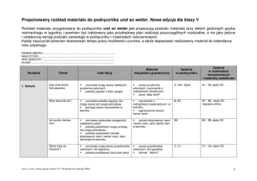 Proponowany rozkład materiału do podręcznika und so weiter. Nowa edycja dla klasy V Rozkład materiału przygotowany do podręcznika und so weiter jest propozycją podziału materiału przy dwóch godzinach języka niemieckiego w tygodniu i powinien być traktowany jako przykładowy plan realizacji poszczególnych rozdziałów, a nie jako jedyna i ostateczną wersję podziału zawartego w podręczniku i materiałach ćwiczeniowych. Każdy nauczyciel powinien dostosować tempo pracy możliwości uczniów, a także dopasować realizowany materiał do kalendarza roku szkolnego. NAZWA SZKOŁY: ............................................................................................ NAUCZYCIEL: ................................................................................................. ROK SZKOLNY: .............................................................................................. KLASA: ............................................................................................................ Rozdział 1. Schule Temat Cele lekcji Materiał leksykalno-gramatyczny Zadania w podręczniku Zadania w materiałach ćwiczeniowych i materiały dodatkowe Das sind meine Schulsachen. uczniowie znają nazwy niektórych przyborów szkolnych potrafią zapytać o brak czegoś nazwy przyborów szkolnych, rzeczowniki z rodzajnikiem określonym; zwrot: Was fehlt? A, Kim -Spiel A1 - A5, płyta CD Was brauchst du? uczniowie potrafią zapytać, kto czego szuka lub czego potrzebuje poznają użycie rzeczownika w bierniku rzeczowniki z rodzajnikiem nieokreślonym w bierniku; zaprzeczenie keinen/ keine/ keins B, B1, B1 - B2, płyta CD, nagranie online Ich suche meinen Kuli. uczniowie doskonalą umiejętność zadawania pytań; potrafią powiedzieć czego szukają lub czego potrzebują ; potrafią zastosować zaimek dzierżawczy mein/ meine/ mein, dein/ deine/dein w bierniku zaimek dzierżawczy mein/ meine/ mein, dein/ deine/ dein w bierniku B2 B3 - B5, płyta CD Wann hast du Deutsch? uczniowie znają nazwy przedmiotów szkolnych i dni tygodnia: potrafią przedstawić swój plan lekcji C, C1 C1 - C4, płyta CD und so weiter. Nowa edycja • klasa 5 © Wydawnictwo Szkolne PWN nazwy przedmiotów szkolnych i dni tygodnia; zaimek : Wann? 1 2. Essen und Trinken Wie findest du Mathe? uczniowie potrafią wyrazić swoją opinię Wir singen ein Lied – Die Wochentagen. uczniowie śpiewają piosenkę; utrwalają nazwy dni tygodnia potrafią kreślić czyjąś własność Die kluge Eule prüft. Test sprawdzian wiadomości Test 1 Korrektur poprawa i ewaluacja testu Karta samooceny Meine Schule - Mini-Projekt für flinke Hände uczniowie potrafią w krótkim tekście znaleźć konkretne informacje ćwiczą wymowę utrwalają wiadomości z poprzednich lekcji przymiotniki: dumm, blöd, langweilig, nicht gut, klasse, spitze, prima, interessant, super, toll zwrot: in Ordnung zaimek dzierżawczy ihr/ ihre/ sein/ seine, unser euer materiał leksykalny i gramatyczny wprowadzony w poprzednich lekcjach C2, C3 C5 - C13, płyta CD D, E D1 - D2, E1 - E 6, płyta CD F,G,H,I H1, test dla ucznia, płyta CD, nagranie online materiały ćwiczeniowe str. 20; materiały potrzebne do wykonania zadania wykonanie projektu i jego prezentacja uczniowie znają nazwy artykułów spożywczych, potrafią powiedzieć, co chętnie jedzą nazwy niektórych artykułów spożywczych A, Kofferpacken A1 - A6; płyta CD Wir essen Cornflakes. uczniowie potrafią zapytać koleżankę/kolegę, co by zjadła/zjadł lub wypiła/ wypił forma möchte, möchtest koniugacja czasownika essen B, B1, B2 B1 - B5, płyta CD, nagranie online Wie viel kostet eine Pizza? uczniowie potrafią nazwać potrawy i napoje oraz podać ich cenę C, C1 C1 - C2, płyta CD Ein Kilo Bananen, bitte. uczniowie znają nazwy owoców i warzyw potrafią robić zakupy C2 C3 - C7, płyta CD, nagranie online Was isst du gern? und so weiter. Nowa edycja • klasa 5 © Wydawnictwo Szkolne PWN nazwy potraw i napojów cena ilość nazwy niektórych owoców i warzyw ilość, waga 2 Śpiewamy piosenkę Hunger und Durst. uczniowie śpiewają piosenkę Hunger und Durst; uczniowie rozumieją selektywnie tekst do słuchania; potrafią prawidłowo zadawać pytania Meine Schwester isst mehr als ich. uczniowie znają zasadę stopniowania przymiotników regularnych i nieregularnych; potrafią dokonywać porównań Die kluge Eule prüft. Test sprawdzian wiadomości Test 2 Korrektur poprawa i ewaluacja testu Karta samooceny Speisekarte - Mini-Projekt für flinke Hände wykonanie projektu i prezentacja Materiały ćwiczeniowe str. 36 Julia geht ins Kino. uczniowie potrafią określić miejsca spędzania wolnego czasu 3. Freizeit uczniowie rozumieją selektywnie tekst do czytania; ćwiczą wymowę; utrwalają wiadomości z poprzednich lekcji D, F, D1, płyta CD stopień wyższy i najwyższy przymiotników regularnych i nieregularnych E E1 - E5, płyta CD G, H, I H1; płyta CD, nagranie online materiał leksykalny i gramatyczny wprowadzony w poprzednich lekcjach okolicznik miejsca: in die A , Würfelspiel A1 - A3, płyta CD …, zu ….., ins …..in den …, auf den ….., Wofür intressierst du dich? uczniowie znają nazwy szczególnych zainteresowań i potrafią o nie zapytać hobby; zwroty: Was ist dein Hobby? Wofür interessierst du dich? B, B1, B2 B1 - B7, płyta CD Markus kann alles. uczniowie potrafią mówić o swoich umiejętnościach czasowniki określające umiejętności i zainteresowania czasownik können C, C1 C1 - C2, płyta CD Kannst du das? czasowniki określające umiejętności i zainteresowania; czasownik können C2, C3 - C4, płyta CD uczniowie rozumieją warianty semantyczne czasownika können potrafią przeprowadzić wywiad und so weiter. Nowa edycja • klasa 5 © Wydawnictwo Szkolne PWN 3 Wir singen ein Lied – Was Tiere können? uczniowie znają nazwy zwierząt dziko żyjących; potrafią określić ich umiejętności śpiewają piosenkę Was Tiere können? nazwy zwierz