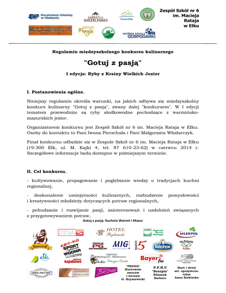 Zespół Szkół nr 6 im. Macieja Rataja w Ełku Regulamin międzyszkolnego konkursu kulinarnego "Gotuj z pasją" I edycja: Ryby z Krainy Wielkich Jezior I. Postanowienia ogólne. Niniejszy regulamin określa warunki, na jakich odbywa się międzyszkolny konkurs kulinarny "Gotuj z pasją", zwany dalej "konkursem". W I edycji tematem przewodnim są ryby słodkowodne pochodzące z warmińskomazurskich jezior. Organizatorem konkursu jest Zespół Szkół nr 6 im. Macieja Rataja w Ełku. Osoby do kontaktu to Pani Iwona Pierzchała i Pani Małgorzata Włodarczyk. Finał konkursu odbędzie się w Zespole Szkół nr 6 im. Macieja Rataja w Ełku (19-300 Ełk, ul. M. Kajki 4, tel. 87 610-23-62) w czerwcu 2014 r. Szczegółowe informacje będą dostępne w późniejszym terminie. II. Cel konkursu. - kultywowanie, propagowanie i pogłębianie wiedzy o tradycjach kuchni regionalnej, - doskonalenie umiejętności kulinarnych, rozbudzenie i kreatywności młodzieży dotyczących potraw regionalnych, pomysłowości - pobudzanie i rozwijanie pasji, zainteresowań i uzdolnień związanych z przygotowywaniem potraw, Gotuj z pasją- Kuchnia Warmii i Mazur "FRUGO" Hurtownia owoców i warzyw G. Hryniewicki P.P.H.U "Scorpio" Eliaszuk Barbara Hurt i detal art. spożywczorolne Anna Siekierko Zespół Szkół nr 6 im. Macieja Rataja w Ełku - zachowanie niepowtarzalnych smaków produktów żywnościowych, - aktywizowanie młodzieży do doskonalenia zawodowego, - upowszechnianie w środowisku szkolnym umiejętności kulinarnych, - umiejętność współpracy, - integracja środowiska szkolnego współpracującego wzajemnie ze sobą. - identyfikacja i zgromadzenie wiedzy o oryginalnych regionalnych produktach żywnościowych, wytwarzanych w gospodarstwach i przez lokalnych rzemieślników, - poszukujemy potraw specyficznych, charakterystycznych dla naszego regionu, które mogą stać się jego wizytówką. III. Uczestnicy konkursu Uczestnikami konkursu może być młodzież ponadgimnazjalna pragnąca rozwijać swoje pasje związane ze sztuką kulinarną z terenu województwa warmińsko- mazurskiego. Istnieje możliwość pracy w zespołach dwuosobowych. Każda osoba lub zespół może zgłosić tylko jedną potrawę regionalną. Każda szkoła może zgłosić więcej niż jeden zespół. IV. Przebieg konkursu Konkurs składa się z trzech etapów: a) I etap – nadesłanie formularza zgłoszeniowego (do 1.03.2014 r.) Gotuj z pasją- Kuchnia Warmii i Mazur "FRUGO" Hurtownia owoców i warzyw G. Hryniewicki P.P.H.U "Scorpio" Eliaszuk Barbara Hurt i detal art. spożywczorolne Anna Siekierko Zespół Szkół nr 6 im. Macieja Rataja w Ełku b) II etap – głosowanie na najbardziej oryginalny pomysł potrawy regionalnej (do 1.05.2014 r.) c) III etap- finał konkursu będzie miał miejsce w Zespole Szkół nr 6 w Ełku w czerwcu 2014 r. Warunkiem udziału w konkursie jest nadesłanie do dnia 1 marca 2014 r. wypełnionego formularza zgłoszeniowego wraz z przepisem na potrawę z regionu Warmii i Mazur na adres e-mail [email protected]. Formularz zgłoszeniowy potrawy konkursowej (załącznik nr 1) i formularz zgłoszeniowy zespołu (załącznik nr 2) dostępny jest na stronie internetowej Zespołu Szkół nr 6 im. Macieja Rataja w Ełku. Każdy przepis poddany zostanie ocenie merytorycznej przez organizatorów konkursu na podstawie następujących kryteriów: Zgodności z tematem konkursu i wymaganiami regulaminu (1-5), Uzasadnienie wyboru potrawy (1-5), Prezentacja potrawy na podstawie zdjęć (1-5), Forma przepisu, jasność, precyzyjność (1-5) Po ocenie merytorycznej przepisy zostaną umieszczone na facebooku https://www.facebook.com/gotujzpasja6 gdzie poprzez kliknięcie "lubie to" oddany zostanie głos na tę potrawę. Podczas głosowania zostanie wyłonionych 10 najciekawszych potraw regionalnych, które później zostaną wykonane w czasie finału, podczas którego jury wyłoni 3 laureatów. Osoby zakwalifikowane do finału zostaną powiadomione o tym fakcie drogą elektroniczną bądź telefonicznie. Dokładny harmonogram przebiegu finału zostanie przedstawiony w późniejszym terminie. Gotuj z pasją- Kuchnia Warmii i Mazur "FRUGO" Hurtownia owoców i warzyw G. Hryniewicki P.P.H.U "Scorpio" Eliaszuk Barbara Hurt i detal art. spożywczorolne Anna Siekierko Zespół Szkół nr 6 im. Macieja Rataja w Ełku Organizatorzy konkursu zapewnią podczas finału stanowisko pracy wyposażone w sprzęt niezbędny do przygotowania i prezentacji potrawy. Każda z ekip zabezpiecza we własnym zakresie niezbędne surowce do wykonania 5 porcji potraw konkursowych. Organizator nie zwraca uczestnikom kosztów udziału w konkursie. Warunkiem przystąpienia do zmagań finałowych jest: - posiadanie legitymacji szkolnej potwierdzającej tożsamość uczestnika, - posiadanie ubioru kucharskiego. Potrawy będą oceniane przez dwie komisje: jury techniczne i jury degustacyjne. Kryteria, którymi będą posługiwały się w/w komisje oceny w załączniku nr 3. określone są V. Nagrody Wszyscy uczestnicy finału otrzymują pamiątkowe dyplomy. Dla laureatów konkursu przewidziane są nagrody m.in. warsztaty kulinarne przeprowadzone w Centrum Gastronomiczno-Hotelarskim w Zespole Szkół nr 6 im. Macieja Rataja w Ełku Gotuj z pasją- Kuchnia Warmii i Mazur "FRUGO" Hurtownia owoców i warzyw G. Hryniewicki P.P.H.U "Scorpio" Eliaszuk Barbara Hurt i detal art. spożywczorolne Anna Siekierko Zespół Szkół nr 6 im. Macieja Rataja w Ełku VI. Postanowienia końcowe 1. Organizator zastrzega sobie prawo do nieodpłatnego dysponowania recepturami na zgłoszone do konkursu potrawy, ich wykorzystania i udostępniania w celach szkoleniowych. 2. Informacje o nagrodzonych i ich potrawach zostaną opublikowane na stronie internetowej Zespołu Szkół nr 6 im. Macieja Rataja w Ełku oraz na Facebooku. 3. Organizator zastrzega sobie prawo do opublikowania imion, nazwisk, zdjęć i informacji o zwycięzcach i uczestnikach Konkursu. 4. Poprzez przystąp