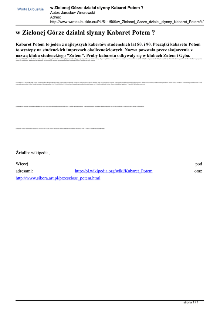 w Zielonej Górze działał słynny Kabaret Potem ? Autor: Jarosław Wnorowski Adres: http://www.wrotalubuskie.eu/PL/511/509/w_Zielonej_Gorze_dzialal_slynny_Kabaret_Potem/k/ w Zielonej Górze działał słynny Kabaret Potem ? Kabaret Potem to jeden z najlepszych kabertów studenckich lat 80. i 90. Początki kabaretu Potem to występy na studenckich imprezach okolicznościowych. Nazwa powstała przez skojarzenie z nazwą klubu studenckiego "Zatem". Próby kabaretu odbywały się w klubach Zatem i Gęba. Pierwotny skład (od 25 listopada 1984) tworzyli dwaj studenci pedagogiki kulturalno-oświatowej Wyższej Szkoły Pedagogicznej: Krzysztof Langer i Dariusz Kamys. W pierwszych latach występowali tam też między innymi Janusz Klimenko (1985-1990), Ewa Sopielewska (do 1987), Andrzej Kłos (w Potem tylko 2 miesiące) i Mirosław Kowalik. Pierwszym pianistą zespołu był Paweł Jarosz. W kwietniu 1985 Władysław Sikora (wówczas pracujący jako monter telefonów) zastąpił Krzysztofa Langera w roli lidera kabaretu. Po działalności w latach 1984-1987 kabaret Potem rozpadł się. Bezpośrednią przyczyną rozpadu było powołanie do zasadniczej służby wojskowej dwóch członków grupy, ale pośrednio także spadek formy artystycznej kabaretu w kolejnych programach. Potem reaktywował się w 1989, a w nowym składzie znaleźli się byli członkowie kabaretu Drugi Garnitur Joanna Chuda (obecnie Kołaczkowska) i Adam Nowak (późniejszy lider zespołu Raz, Dwa, Trzy). Od około 1990 tworzyli go: Joanna Kołaczkowska, Mirosław Gancarz (od 1986), Leszek Jenek, Dariusz Kamys, Adam Pernal (pianista) i Władysław Sikora (kierownictwo). Potem stanowił podstawę kabaretowej Formacji Zaś (1988-1990). Niektórzy członkowie Potem, na czele z liderem całego środowiska, Władysławem Sikorą, w ramach Formacji opiekowali się nowymi kabaretami Zielonogórskiego Zagłębia Kabaretowego. Pożegnalny występ kabaretu miał miejsce 28 czerwca 1999 w kinie "Newa" w Zielonej Górze, ostatni występ odbył się 30 czerwca 1999 w Teatrze Ziemi Rybnickiej w Rybniku. Żródło: wikipedia, Więcej adresami: pod http://pl.wikipedia.org/wiki/Kabaret_Potem oraz http://www.sikora.art.pl/przeszlosc_potem.html strona 1 / 1 Powered by TCPDF (www.tcpdf.org)