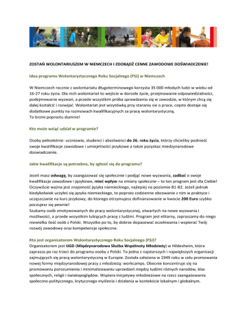 ZOSTAŃ WOLONTARIUSZEM W NIEMCZECH I ZDOBĄDŹ CENNE ZAWODOWE DOŚWIADCZENIE! Idea programu Wolontarystycznego Roku Socjalnego (FSJ) w Niemczech W Niemczech rocznie z wolontariatu długoterminowego korzysta 35 000 młodych ludzi w wieku od 16-27 roku życia. Dla nich wolontariat to wejście w dorosłe życie, przejmowanie odpowiedzialności, podejmowanie wyzwań, a przede wszystkim próba sprawdzenia się w zawodzie, w którym chcą się dalej kształcić i rozwijać. Wolontariat jest wizytówką przy staraniu sie o prace, często dostaje się dodatkowe punkty na rozmowach kwalifikacyjnych za pracę wolontarystyczną. To brzmi poprostu dumnie! Kto może wziąć udział w programie? Osoby pełnoletnie: uczniowie, studenci i absolwenci do 26. roku życia, którzy chcieliby podnieść swoje kwalifikacje zawodowe i umiejetności jezykowe a takze pozyskac miedzynarodowe doswiadczenie. Jakie kwalifikacje są potrzebne, by zgłosić się do programu? Jezeli masz odwagę, by zaangazować się społecznie i podjąć nowe wyzwania, zadbać o swoje kwalifikacje zawodowe i językowe, mieć wpływ na zmiany społeczne – to ten program jest dla Ciebie! Oczywiście ważna jest znajomość języka niemieckiego, najlepiej na poziomie B1-B2. Jeżeli jednak kiedykolwiek uczyłeś się języka niemieckiego, to poprzez codzienne obcowanie z nim w praktyce i uczęszczanie na kurs jezykowy, do ktorego otrzymujesz dofinansowanie w kwocie 200 Euro szybko poczujesz się pewnie! Szukamy osób zmotywowanych do pracy wolontarystycznej, otwartych na nowe wyzwania i możliwości, a przede wszystkim lubiących pracę z ludźmi. Program jest elitarny, zapraszamy do niego niewielka ilość osób z Polski. Wszystko po to, by dobrze dopasować oczekiwania i wspierać Twój rozwój zawodowy oraz kompetencje społeczne. Kto jest organizatorem Wolontarystycznego Roku Socjalnego (FSJ)? Organizatorem jest IJGD (Międzynarodowa Służba Wspólnoty Młodzieży) w Hildesheim, która zaprasza po raz trzeci do programu osoby z Polski. To jedna z najstarszych i największych organizacji zajmujących się pracą wolontarystyczną w Europie. Została założona w 1949 roku w celu promowania nowej formy międzynarodowej pracy z młodzieżą: workcamps. Obecnie koncentruje się na promowaniu porozumienia i minimalizowaniu uprzedzeń między ludźmi różnych narodów, klas społecznych, religii i światopoglądów. Wspiera inicjatywy młodzieżowe na rzecz zaangażowania społeczno-politycznego, krytycznego myślenia i działania w kontekście lokalnym i globalnym. Swoją pracę opiera na sześciu „filarach”, tj. międzykulturowego uczenia się, pracy wolontarystycznej, samopomocy, wrażliwości socjalnej, równości płci i wrażliwości ekologicznej. Zatrudnia 190 pracowników etatowych w 5 dyrekcjach: w Berlinie, Bonn, Halberstadt, Hildesheim, Wismar. W jakich obszarach można podejmować wolontariat? Projekt oferuje odbywanie wolontariatu w organizacjach pozarządowych z wieloletnią tradycją na terenie Dolnej Saksonii (Niedersachsen). Głównie są to: przedszkola integracyjne, miedzykulturowe, szkoły kształcące osoby niepełnosprawne w różnym wieku, organizacje zajmujące się pracą z młodzieżą, warsztaty dla niepełnosprawnych, szpitale, hospicja, jak i kilka dziennych centrów dla osób starszych i centra kultury. Ważne podkreślenia jest, iż wolontariusze pomagają w pracy organizacji ucząc się jednocześnie poprzez zdobywanie doświadczeń, współorganizację np. eventów, projetków. Jakie warunki organizacyjne i finansowe są zapewnianie wolontariuszowi? Wolontarystyczny Rok Socjalny (FSJ) rozpoczyna się 1 sierpnia lub 1 września 2016 roku, trwa 12 miesięcy z możliwością przedłużenia pracy wolontarystycznej do maksymalnie 18 miesięcy. Rok wolontariatu zapewnia pracę praktyczną w organizacjach i instytucjach socjalnych. W trakcie odbywania wolontariatu, wolontariatusze objęci są „wsparciem pedagogicznym”, które zorientowane jest na jego potrzeby, zainteresowania i motwacje. Istotne jest wzmacnianie zarówno kompetencji zawodowych, jak i społecznych wolontariusza. Ciekawym rozwiązaniem w programie jest doprowadzanie do współdziałania wolontariuszy z Polski z wolontariuszami z Niemiec, oparte na modelu komunikacji peer-to-peer, oznacza to ścisła kooperację i wzajemne wsparcie między nimi! W ramach Wolontarystycznego Roku Socjalnego (FSJ), wolontariusze otrzymują comiesięczne kieszonkowe (165 Euro), dofinansowanie do wyżywienia (236 Euro), zakwaterowanie lub ekwiwalent pieniężny w wysokości 223 Euro, świadczenia socjalne (ubezpieczenia społeczne, w tym zdrowotne), wsparcie pedagogiczne w formie opiekuna pracy wolontarystycznej, który zapewnia stałe poradnictwo oraz udział w 5. tygodniowych seminariach tematycznych podnoszących jego kwalifikacje. Wolontariusze otrzymują legitymacje FSJ, które uprawniają do podobnych zniżek, do jakich uprawnione są osoby uczące się. W ramach odbywania rocznej pracy wolontariuszom przysługuje prawo do urlopu wypoczynkowego tj., co najmniej 26 dni roboczych. Wolontariusz otrzymuje na zakończenie pracy wolontarystycznej świadectwo w formie pisemnej z notą opisową (zakres i wyniki pracy). Jak wyglada procedura rekrutacyjna? KROK 1 Należy wypełnić formularz zgłoszeniowy http://www.freiwilligesjahr-nds.ijgd.de i przesłać go mailem wraz z listem motywacyjnym i CV w j. niemieckim, oraz zdjęcie i kopię ostatniego dyplomu na maila koordynatora projektu: [email protected] KROK 2 Wstępne spotkania informacyjne z kandydatami w Polsce. KROK 3 Hospitacja w organizacji, wybranej zgodnie z potrzebami i zainteresowaniami wolontariuszy. Jest to ważny element rekrutacji, ponieważ wolontariusz i organizacja muszą do siebie dobrze „pasować”. Organizacje pokrywają koszty zakwaterowania, koszt dojazdu pozostaje po stronie wolontariusza. KROK 4 Porozumienie podpisywane przez wolontariusza, organizację przyjmującą i IJGD, które org