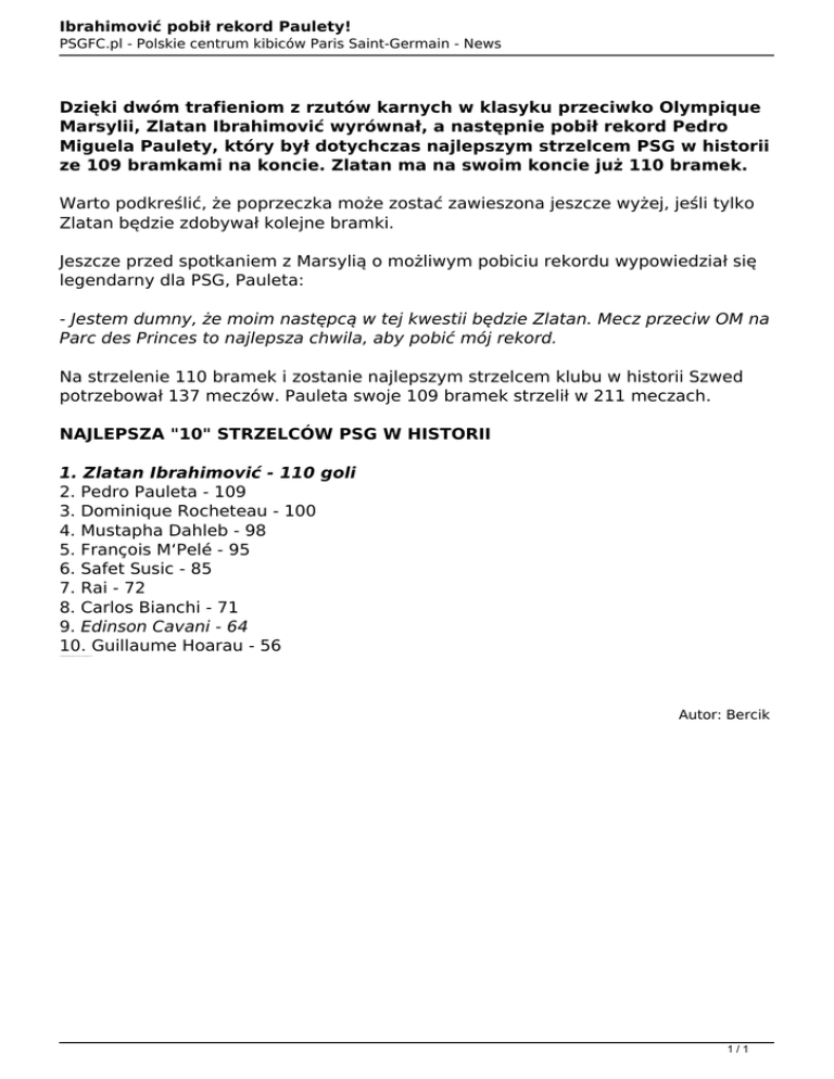 Ibrahimović pobił rekord Paulety! PSGFC.pl - Polskie centrum kibiców Paris Saint-Germain - News Dzięki dwóm trafieniom z rzutów karnych w klasyku przeciwko Olympique Marsylii, Zlatan Ibrahimović wyrównał, a następnie pobił rekord Pedro Miguela Paulety, który był dotychczas najlepszym strzelcem PSG w historii ze 109 bramkami na koncie. Zlatan ma na swoim koncie już 110 bramek. Warto podkreślić, że poprzeczka może zostać zawieszona jeszcze wyżej, jeśli tylko Zlatan będzie zdobywał kolejne bramki. Jeszcze przed spotkaniem z Marsylią o możliwym pobiciu rekordu wypowiedział się legendarny dla PSG, Pauleta: - Jestem dumny, że moim następcą w tej kwestii będzie Zlatan. Mecz przeciw OM na Parc des Princes to najlepsza chwila, aby pobić mój rekord. Na strzelenie 110 bramek i zostanie najlepszym strzelcem klubu w historii Szwed potrzebował 137 meczów. Pauleta swoje 109 bramek strzelił w 211 meczach. NAJLEPSZA "10" STRZELCÓW PSG W HISTORII 1. Zlatan Ibrahimović - 110 goli 2. Pedro Pauleta - 109 3. Dominique Rocheteau - 100 4. Mustapha Dahleb - 98 5. François M‘Pelé - 95 6. Safet Susic - 85 7. Rai - 72 8. Carlos Bianchi - 71 9. Edinson Cavani - 64 10. Guillaume Hoarau - 56 * kursywą zapisano graczy, którzy wciąż grają w PSG Autor: Bercik 1/1 Powered by TCPDF (www.tcpdf.org)