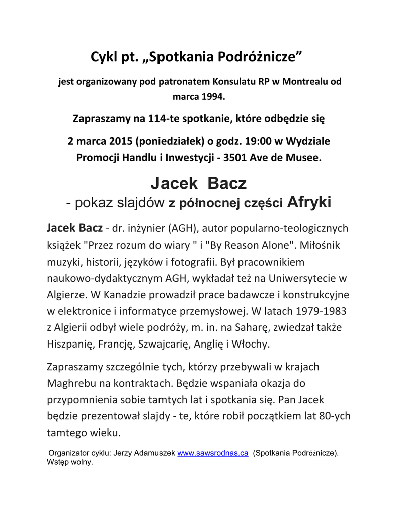 Cykl pt. „Spotkania Podróżnicze” jest organizowany pod patronatem Konsulatu RP w Montrealu od marca 1994. Zapraszamy na 114-te spotkanie, które odbędzie się 2 marca 2015 (poniedziałek) o godz. 19:00 w Wydziale Promocji Handlu i Inwestycji - 3501 Ave de Musee. Jacek Bacz - pokaz slajdów z północnej części Afryki Jacek Bacz - dr. inżynier (AGH), autor popularno-teologicznych książek "Przez rozum do wiary " i "By Reason Alone". Miłośnik muzyki, historii, języków i fotografii. Był pracownikiem naukowo-dydaktycznym AGH, wykładał też na Uniwersytecie w Algierze. W Kanadzie prowadził prace badawcze i konstrukcyjne w elektronice i informatyce przemysłowej. W latach 1979-1983 z Algierii odbył wiele podróży, m. in. na Saharę, zwiedzał także Hiszpanię, Francję, Szwajcarię, Anglię i Włochy. Zapraszamy szczególnie tych, którzy przebywali w krajach Maghrebu na kontraktach. Będzie wspaniała okazja do przypomnienia sobie tamtych lat i spotkania się. Pan Jacek będzie prezentował slajdy - te, które robił początkiem lat 80-ych tamtego wieku. Organizator cyklu: Jerzy Adamuszek www.sawsrodnas.ca (Spotkania Podrόżnicze). Wstęp wolny.