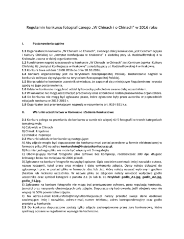 Regulamin konkursu fotograficznego „W Chinach i o Chinach” w 2016 roku I. Postanowienia ogólne 1.1 Organizatorem konkursu „W Chinach i o Chinach”, zwanego dalej konkursem, jest Centrum Języka i Kultury Chińskiej UJ „Instytut Konfucjusza w Krakowie” z siedzibą przy ul. Radziwiłłowskiej 4 w Krakowie, zwana w dalej organizatorem. 1.2 Fundatorem nagród rzeczowych w konkursie „W Chinach i o Chinach” jest Centrum Języka i Kultury Chińskiej UJ „Instytut Konfucjusza w Krakowie” z siedzibą przy ul. Radziwiłłowskiej 4 w Krakowie. 1.3 Konkurs trwa od dnia 18.08.2016 do dnia 10.10.2016. 1.4 Konkurs organizowany jest na terytorium Rzeczpospolitej Polskiej. Dostarczanie nagród w konkursie odbywa się wyłącznie na terytorium Rzeczpospolitej Polskiej. 1.5 Biorąc udział w konkursie uczestnik oświadcza, że zapoznał się z niniejszym Regulaminem i wyraża zgodę na jego postanowienia. 1.6 Udział w konkursie mogą brać udział tylko osoby pełnoletnie zwane dalej uczestnikiem. 1.7 W konkursie nie mogą uczestniczyć pracownicy oraz członkowie rodzin pracowników organizatora. 1.8 Do konkursu nie mogą być zgłaszane prace, które zgłoszone były przez autorów w poprzednich edycjach konkursu w 2012-2015 r. 1.9 Organizator jest przyrzekającym nagrodę w rozumieniu art. 919 i 921 k.c. II. Warunki uczestnictwa w Konkursie i Zadania Konkursowe 2.1 Konkurs polega na przesłaniu do konkursu w sumie nie więcej niż 5 fotografii w trzech kategoriach tematycznych: A) Człowiek w Chinach B) Chiński krajobraz C) Chińskie inspiracje 2.2 Warunki udziału w konkursie są następujące: A) Aby zdjęcie mogło być dopuszczone do konkursu musi zostać przesłane w formie elektronicznej w formacie pliku JPG na adres [email protected]. B) Rozmiar jednego pliku nie może być większy niż 3 megabajty C) Obowiązujący format fotografii: pliki cyfrowe bez kompresji, rozdzielczość 300 dpi, długość krótszego boku nie mniejsza niż 2000 pikseli. D) Zgłoszone na konkurs fotografie muszą być opisane. Opis powinien zawierać: imię i nazwisko autora, nazwę kategorii, tytuł pracy oraz miejsce i datę wykonania zdjęcia. Opisy należy dołączyć do zgłoszonych prac w postaci pliku w formacie .doc lub .txt, który należy nazwać wybranym godłem (hasłem lub nickiem) uczestnika. W nazwie pliku ze zdjęciem należy umieścić wyłącznie godło uczestnika oraz symbol kategorii z punktu 2.1 (A lub B, C). Przykład: godlo_A1.jpg, godlo_A2.jpg, godlo_B1.jpg. E) Zgłoszone na konkurs fotografie nie mogą być przetworzone cyfrowo, poza regulacją kontrastu, jasności oraz nasycenia obejmujących całe zdjęcie. Dopuszcza się kadrowanie, jeśli obejmie ono nie więcej niż 50% powierzchni zdjęcia. F) Na adres e-mail: [email protected] należy przesłać swoje dane osobowe zawierające: Imię i nazwisko, adres e-mail, numer telefonu, adres korespondencyjny oraz godło przyjęte w konkursie. 2.3 Do konkursu dopuszczone zostają tylko zdjęcia zaakceptowane przez jury konkursowe, które spełniają opisane w regulaminie wymagania techniczne. 2.4 Zgłoszenie udziału w konkursie, dokonane zgodnie z pkt. 2.2, musi nastąpić nie wcześniej niż dnia 18.08.2016 i nie później niż dnia 10.10.2016. Zgłoszenia wcześniejsze lub późniejsze nie będą brane pod uwagę w ramach konkursu. 2.5 Każdy uczestnik w okresie trwania konkursu może przesłać nie więcej niż 5 zdjęć konkursowych, przy czym w jednej kategorii można zgłosić maksymalnie 3 fotografie. 2.6 W konkursie nie będą uwzględniane zdjęcia, których opisy będą zawierały określenia lub zwroty powszechnie uznane za wulgarne lub obraźliwe albo naruszające dobra osobiste lub prawa wyłączne osób trzecich. 2.7 Organizator nie ponosi odpowiedzialności za nie dotarcie lub opóźnione dotarcie do organizatora zgłoszenia udziału w konkursie albo za brak możliwości dokonania zgłoszenia konkursowego z przyczyn niezależnych od organizatora, a w szczególności leżących po stronie dostawcy usług internetowych albo wynikających z działania siły wyższej. 2.8 Organizator zastrzega sobie prawo do wykluczenia z udziału w konkursie tych osób, które nie przestrzegają postanowień niniejszego Regulaminu. 2.9 Udział w konkursie i przysłanie związanych z nim materiałów jest całkowicie dobrowolne. Uczestnicy konkursu wyrażają bezwarunkową zgodę na publikację nadesłanych przez nich w ramach konkursu materiałów foto, na stronie www i Facebook Instytutu Konfucjusza oraz wyrażają zgodę na ich modyfikację podczas przygotowania wystawy. III Nagrody w Konkursie 3.1 Jury konkursu przyzna nagrody w postaci: A) Pierwsza nagroda w każdej z dwóch (A i B) kategorii – wartość: 500 zł B) Druga nagroda w każdej z dwóch (A i B) kategorii – wartość: 300 zł C) Trzecia nagroda w każdej z dwóch (A i B) kategorii – wartość: 200 zł D) Jedna nagroda w kategorii C – wartość 500 zł E) Nagrody specjalne Dyrektor Instytutu Konfucjusza oraz Wicedyrektora Instytutu ze strony chińskiej – każda wartości 300 zł. F) Nagroda specjalna w kategorii Piękno – zestawy kosmetyków Elfa Pharm o wartości 200 zł. 3.2 Fani Instytutu Konfucjusza na Facebooku poprzez swoje głosowanie przyznają nagrodę specjalną internautów – o wartości 300 zł. 3.3 Jury konkursu zastrzega sobie prawo innego podziału nagród. 3.4 Jury konkursu dokona wyboru prac i podziału nagród wymienionych w punkcie 3.1. do dnia 24.10.2016. Lista osób, które otrzymają nagrody opublikowana zostanie do dnia 15.11.2016 na stronie www.instytutkonfucjusza.edu.pl. 3.5 Uczestnicy konkursu nie mogą przenieść prawa do uzyskania nagrody na osoby trzecie, ani też zamieniać nagród na inne. 3.6 Wszystkie prace laureatów (10 zdjęć) oraz prace finałowe zostaną wydrukowane i wystawione na wspólnej wystawie w dniach 15-20.11.2016 w Międzynarodowym Centrum Kultury w Krakowie. Ich autorzy otrzymają upominki w postaci kosmety